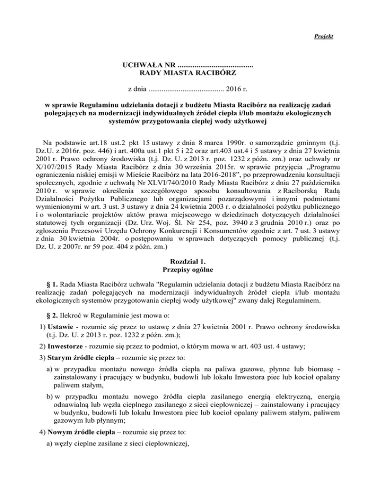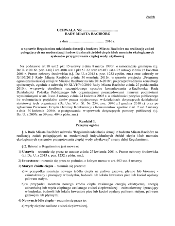 Projekt UCHWAŁA NR ........................................ RADY MIASTA RACIBÓRZ z dnia ........................................ 2016 r. w sprawie Regulaminu udzielania dotacji z budżetu Miasta Racibórz na realizację zadań polegających na modernizacji indywidualnych źródeł ciepła i/lub montażu ekologicznych systemów przygotowania ciepłej wody użytkowej Na podstawie art.18 ust.2 pkt 15 ustawy z dnia 8 marca 1990r. o samorządzie gminnym (t.j. Dz.U. z 2016r. poz. 446) i art. 400a ust.1 pkt 5 i 22 oraz art.403 ust.4 i 5 ustawy z dnia 27 kwietnia 2001 r. Prawo ochrony środowiska (t.j. Dz. U. z 2013 r. poz. 1232 z późn. zm.) oraz uchwały nr X/107/2015 Rady Miasta Racibórz z dnia 30 września 2015r. w sprawie przyjęcia „Programu ograniczenia niskiej emisji w Mieście Racibórz na lata 2016-2018”, po przeprowadzeniu konsultacji społecznych, zgodnie z uchwałą Nr XLVI/740/2010 Rady Miasta Racibórz z dnia 27 października 2010 r. w sprawie określenia szczegółowego sposobu konsultowania z Raciborską Radą Działalności Pożytku Publicznego lub organizacjami pozarządowymi i innymi podmiotami wymienionymi w art. 3 ust. 3 ustawy z dnia 24 kwietnia 2003 r. o działalności pożytku publicznego i o wolontariacie projektów aktów prawa miejscowego w dziedzinach dotyczących działalności statutowej tych organizacji (Dz. Urz. Woj. Śl. Nr 254, poz. 3940 z 3 grudnia 2010 r.) oraz po zgłoszeniu Prezesowi Urzędu Ochrony Konkurencji i Konsumentów zgodnie z art. 7 ust. 3 ustawy z dnia 30 kwietnia 2004r. o postępowaniu w sprawach dotyczących pomocy publicznej (t.j. Dz. U. z 2007r. nr 59 poz. 404 z późn. zm.) Rozdział 1. Przepisy ogólne § 1. Rada Miasta Racibórz uchwala "Regulamin udzielania dotacji z budżetu Miasta Racibórz na realizację zadań polegających na modernizacji indywidualnych źródeł ciepła i/lub montażu ekologicznych systemów przygotowania ciepłej wody użytkowej" zwany dalej Regulaminem. § 2. Ilekroć w Regulaminie jest mowa o: 1) Ustawie - rozumie się przez to ustawę z dnia 27 kwietnia 2001 r. Prawo ochrony środowiska (t.j. Dz. U. z 2013 r. poz. 1232 z późn. zm.); 2) Inwestorze - rozumie się przez to podmiot, o którym mowa w art. 403 ust. 4 ustawy; 3) Starym źródle ciepła – rozumie się przez to: a) w przypadku montażu nowego źródła ciepła na paliwa gazowe, płynne lub biomasę zainstalowany i pracujący w budynku, budowli lub lokalu Inwestora piec lub kocioł opalany paliwem stałym, b) w przypadku montażu nowego źródła ciepła zasilanego energią elektryczną, energią odnawialną lub węzła cieplnego zasilanego z sieci ciepłowniczej – zainstalowany i pracujący w budynku, budowli lub lokalu Inwestora piec lub kocioł opalany paliwem stałym, paliwem gazowym lub płynnym; 4) Nowym źródle ciepła – rozumie się przez to: a) węzły cieplne zasilane z sieci ciepłowniczej, b) kotły na paliwa gazowe, c) kotły na paliwa płynne: olejowe, na gaz LPG, d) źródła ciepła zasilane energią elektryczną (piece, kotły wodne, pompy ciepła, inne), e) kotły opalane biomasą, spełniające wymogi odpowiednio: 4 lub 5 klasy wg kryteriów zawartych w normie PN-EN 303-5:2012, f) technologie oparte o energię odnawialną; 5) Kosztach kwalifikowanych - rozumie się przez to koszty poniesione przez Inwestora, które mogą być pokryte z dotacji. Rozdział 2. Dofinansowanie § 3. Dotacje udzielane są na następujące rodzaje zadań: 1) modernizacja źródła ciepła; 2) montaż instalacji solarnej lub pompy ciepła na potrzeby przygotowania ciepłej wody użytkowej. § 4. 1. Modernizacja źródła ciepła, o której mowa w § 3 pkt 1, polega na: 1) demontażu starego źródła ciepła lub w uzasadnionych przypadkach, gdy źródło stanowiły piece kaflowe ich odcięcie od przewodów kominowych (bez demontażu); 2) montażu nowego źródła ciepła oraz niezbędnego zakresu instalacji dla nowego źródła ciepła (wraz z wkładem kominowym, o ile zachodzi taka konieczność); 3) wykonaniu wewnętrznej instalacji centralnego ogrzewania, w obiektach które nie były w taką instalację wyposażone (w obiektach, w których stare źródło ciepła stanowiły piece kaflowe lub inne). 2. Koszty kwalifikowane modernizacji źródła ciepła nie obejmują robót remontowobudowlanych. § 5. 1. Montaż instalacji solarnej, o którym mowa w § 3 pkt 2, polega na zainstalowaniu kolektorów słonecznych łącznie lub bez zbiornika ciepłej wody użytkowej wraz z niezbędnym osprzętem. 2. Montaż pompy ciepła, o którym mowa w § 3 pkt 2, polega na zainstalowaniu pompy łącznie lub bez zbiornika ciepłej wody użytkowe wraz z niezbędnym osprzętem. 3. Koszty kwalifikowane montażu instalacji solarnej i pomp ciepła na potrzeby przygotowania ciepłej wody użytkowej nie obejmują instalacji rozprowadzającej ciepłą wodę użytkową i robót remontowo-budowlanych. Rozdział 3. Wysokość dotacji § 6. 1. Kwota dotacji, z zastrzeżeniem ust.2 i 3, wynosić będzie: 1) dla zadań polegających na modernizacji źródła ciepła w pojedynczym lokalu mieszkalnym lub użytkowym bez wykonania wewnętrznej instalacji centralnego ogrzewania: a) 3 000 złotych, z zastrzeżeniem lit. b, b) dla obiektów o powierzchni ogrzewanej powyżej 200 m2 kwota dotacji ulegnie zwiększeniu o 15 zł na każdy metr kwadratowy powierzchni powyżej 200 m2; 2) dla zadań polegających na modernizacji źródła ciepła w pojedynczym lokalu mieszkalnym lub użytkowym z wykonaniem wewnętrznej instalacji centralnego ogrzewania: a) 5 000 złotych – z zastrzeżeniem lit. b, b) dla obiektów o powierzchni ogrzewanej powyżej 200m2 kwota dotacji ulegnie zwiększeniu o 15 zł na każdy metr kwadratowy powierzchni powyżej 200 m2; 3) dla zadań polegających na modernizacji źródła ciepła w budynku mieszkalnym lub budynku użytkowym: a) 5 000 złotych z zastrzeżeniem lit. b, b) dla obiektów o powierzchni ogrzewanej powyżej 200m2 kwota dotacji ulegnie zwiększen