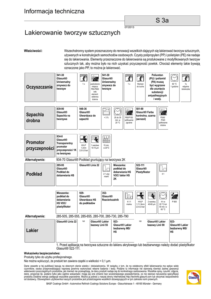 Informacja techniczna S 3a Lakierowanie tworzyw sztucznych Właściwości: Wszechstronny system przeznaczony do renowacji wszelkich dających się lakierować tworzyw sztucznych, używanych w konstrukcjach samochodów osobowych. Czysty polipropylen (PP) i polietylen (PE) nie nadaje się do lakierowania. Elementy przeznaczone do lakierowania są produkowane z modyfikowanych tworzyw sztucznych tak, aby można było na nich uzyskać przyczepność powłok. Chociaż elementy takie bywają oznaczone jako PP, to można je lakierować. Oczyszczanie Promotor przyczepności Podkład Alternatywnie: 541-30 Glasurit® Uniwersalny zmywacz do tworzyw 839-90 Glasurit® Szpachla na tworzywa Szpachla drobna Alternatywnie: 934-0 Glasurit® Transparentny promotor przyczepności 1K na tworzywa 1x uszkodzone miejsca: P80-P600 cały element: włóknina ścierna 948-36 Glasurit® Utwardzacz do szpachli HVLP 1,3mm 2,0-3,0 bar 1 warstwa 10-15 μm 541-30 Glasurit® Uniwersalny zmywacz do tworzyw +3% 25 do 35 min. w 20 °C 1x P80/P150 szlifowanie zgrubne Wytrzeć do sucha Poliuretan (PU) i poliamid (PA) muszą być wygrzane dla usunięcia substancji antyadhezyjnych i wody. 581-90 Glasurit® Farba kontrolna, czarna (aerozol) 60 °C 1 godzina 1x wilgotna ściereczka P240/ P320 szlifowanie drobne 15 min. w 20°C 934-70 Glasurit® Podkład gruntujący na tworzywa 2K 285-95 Glasurit® Podkład do dobarwiania HS Glasurit® Linia 22 Mieszanka: podkład do dobarwiania HS VOC/ plastyfikator 929Glasurit® Utwardzacz HS do podkładów 2:1 użyj miarki Mieszanka: podkład do dobarwiania HS VOC/ lakier HS 2K 352Glasurit® Rozcieńczalnik 4:1:1 miarka 522-111 Glasurit® Plastyfikator HVLP 1,7-1,9mm 2,0-3,0 bar 2 warstwy 40-60 μm 4:1 4hw 20 °C lub 40 min. w 60 °C P 800 285-505, 285-555, 285-655, 285-700, 285-730, 285-790 Glasurit® Linia 22 Lakier 07/2013 lub Glasurit® Lakier bazowy Linii 55 923Glasurit® Lakier bezbarwny MS/ HS lub Glasurit® Lakier bazowy Linii 90 923Glasurit® Lakier bezbarwny MS/ HS 1. Przed aplikacją na tworzywa sztuczne do lakieru akrylowego lub bezbarwnego należy dodać plastyfikator Glasurit® 522-111. Wskazówka bezpieczeństwa: Produkty tylko do użytku profesjonalnego. Nie można wykluczyć, że produkt ten zawiera cząstki o wielkości < 0,1 µm. Dane zawarte w tej publikacji bazują na obecnym stanie wiedzy i doświadczeniu. W związku z tym, że na ostateczny efekt lakierowania ma wpływ wiele czynników, osoba przeprowadzająca naprawę powinna wykonywać własne badania i testy. Podane tu informacje nie stanowią również żadnej gwarancji właściwości poszczególnych produktów, jak również nie przesądzają, że dany produkt nadaje się do konkretnego zastosowania. Wszelkie opisy, rysunki, zdjęcia, dane, proporcje itp. podano tylko jako ogólne wskazówki; mogą się one zmienić bez wcześniejszego powiadomienia, co nie stanowi naruszenia specyfikacji produktu.Ostatnia wersja zastępuje wszystkie poprzednie. Można ją pobrać z naszej strony internetowej http://techinfo.glasurit.com lub otrzymać bezpośrednio od dostawcy. Obowiązkiem użytkownika naszych produktów jest przestrzeganie wszelkich obowiązujących w tym zakresie norm prawnych. BASF Coatings GmbH - Automotive Refinish Coatings Solutions Europe - Glasuritstrasse 1 - 48165 Münster - Germany Informacja techniczna S 3a Lakierowanie tworzyw sztucznych Glasurit® Lakier 2K HS Linii 22 lub Glasurit® Lakier bezbarwny MS/ HS 923- 522-111 Glasurit® Plastyfikator Mieszanka: lakier HS 2K/ plastyfikator lub lakier bezbarwny MS/ HS/ plastyfikator 929Glasurit® Utwardzacz HS do lakierów 07/2013 4:1 352Glasurit® Rozcieńczalnik 2:1 + 10% miarka HVLP 1,3mm 2,0-3,0 bar 2 warstwy 50-70 μm 16 h w 20 °C lub 40 min. w 60 °C 2. Lakiery bezbarwne i lakiery o połysku bezpośrednim przed aplikacją na podłoża z pianki poliuretanowej należy wymieszać z plastyfikatorem Glasurit® 522-111: Glasurit® Lakier 2K HS Linii 22 lub Glasurit® Lakier bezbarwny MS/ HS 923- 522-111 Glasurit® Plastyfikator Mieszanka: lakier HS 2K/ plastyfikator lub lakier bezbarwny MS/ HS/ plastyfikator 929Glasurit® Utwardzacz HS do lakierów 2:1 352Glasurit® Rozcieńczalnik 2:1 + 10% miarka HVLP 1,3mm 2,0-3,0 bar 2 warstwy 50-70 μm 16 h w 20 °C lub 40 min. w 60 °C Wskazówka bezpieczeństwa: Produkty tylko do użytku profesjonalnego. Nie można wykluczyć, że produkt ten zawiera cząstki o wielkości < 0,1 µm. Dane zawarte w tej publikacji bazują na obecnym stanie wiedzy i doświadczeniu. W związku z tym, że na ostateczny efekt lakierowania ma wpływ wiele czynników, osoba przeprowadzająca naprawę powinna wykonywać własne badania i testy. Podane tu informacje nie stanowią również żadnej gwarancji właściwości poszczególnych produktów, jak również nie przesądzają, że dany produkt nadaje się do konkretnego zastosowania. Wszelkie opisy, rysunki, zdjęcia, dane, proporcje itp. podano tylko jako ogólne wskazówki; mogą się one zmienić bez wcześniejszego powiadomienia, co nie stanowi naruszenia specyfikacji produktu.Ostatnia wersja zastępuje wszystkie poprzednie. Można ją pobrać z naszej strony internetowej http://techinfo.glasurit.com lub otrzymać bezpośrednio od dostawcy. Obowiązkiem użytkownika naszych produktów jest przestrzeganie wszelkich obowiązujących w tym zakresie norm prawnych. BASF Coatings GmbH - Automotive Refinish Coatings Solutions Europe - Glasuritstrasse 1 - 48165 Münster - Germany