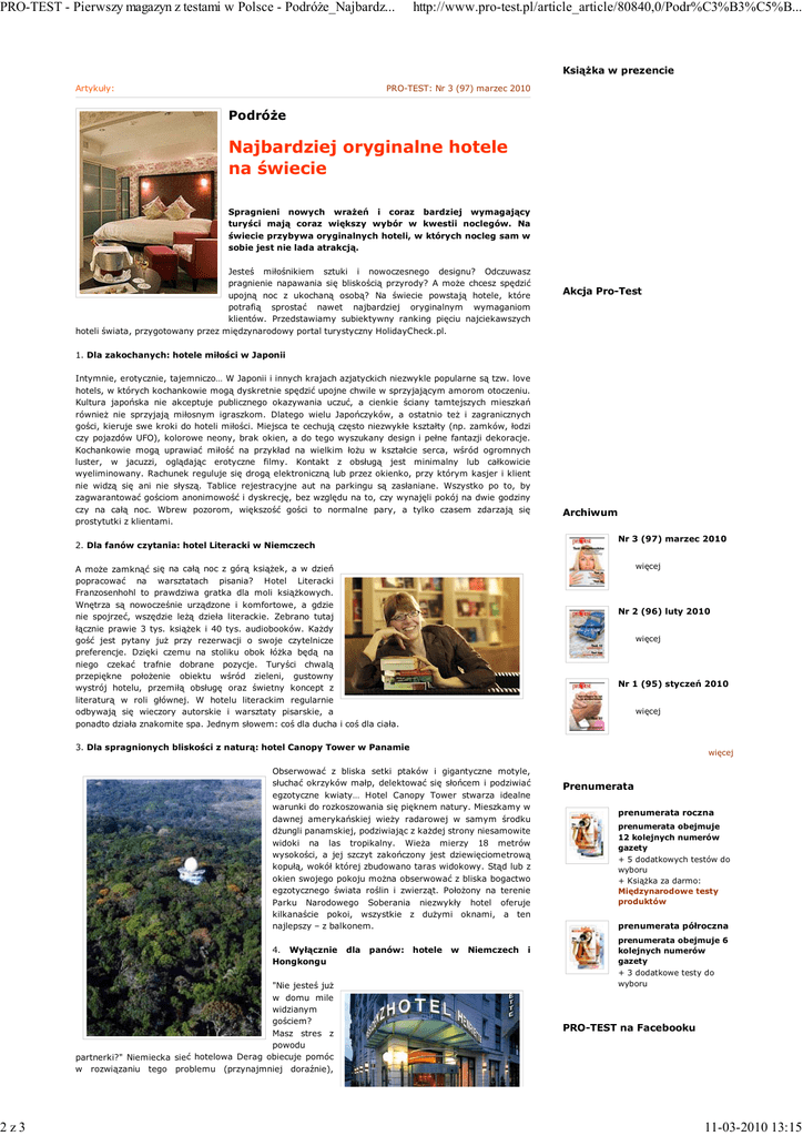 PRO-TEST - Pierwszy magazyn z testami w Polsce - Podróże_Najbardz... 2z3 http://www.pro-test.pl/article_article/80840,0/Podr%C3%B3%C5%B... Książka w prezencie Artykuły: PRO-TEST: Nr 3 (97) marzec 2010 Podróże Najbardziej oryginalne hotele na świecie Spragnieni nowych wrażeń i coraz bardziej wymagający turyści mają coraz większy wybór w kwestii noclegów. Na świecie przybywa oryginalnych hoteli, w których nocleg sam w sobie jest nie lada atrakcją. Jesteś miłośnikiem sztuki i nowoczesnego designu? Odczuwasz pragnienie napawania się bliskością przyrody? A może chcesz spędzić upojną noc z ukochaną osobą? Na świecie powstają hotele, które potrafią sprostać nawet najbardziej oryginalnym wymaganiom klientów. Przedstawiamy subiektywny ranking pięciu najciekawszych hoteli świata, przygotowany przez międzynarodowy portal turystyczny HolidayCheck.pl. Akcja Pro-Test 1. Dla zakochanych: hotele miłości w Japonii Intymnie, erotycznie, tajemniczo… W Japonii i innych krajach azjatyckich niezwykle popularne są tzw. love hotels, w których kochankowie mogą dyskretnie spędzić upojne chwile w sprzyjającym amorom otoczeniu. Kultura japońska nie akceptuje publicznego okazywania uczuć, a cienkie ściany tamtejszych mieszkań również nie sprzyjają miłosnym igraszkom. Dlatego wielu Japończyków, a ostatnio też i zagranicznych gości, kieruje swe kroki do hoteli miłości. Miejsca te cechują często niezwykłe kształty (np. zamków, łodzi czy pojazdów UFO), kolorowe neony, brak okien, a do tego wyszukany design i pełne fantazji dekoracje. Kochankowie mogą uprawiać miłość na przykład na wielkim łożu w kształcie serca, wśród ogromnych luster, w jacuzzi, oglądając erotyczne filmy. Kontakt z obsługą jest minimalny lub całkowicie wyeliminowany. Rachunek reguluje się drogą elektroniczną lub przez okienko, przy którym kasjer i klient nie widzą się ani nie słyszą. Tablice rejestracyjne aut na parkingu są zasłaniane. Wszystko po to, by zagwarantować gościom anonimowość i dyskrecję, bez względu na to, czy wynajęli pokój na dwie godziny czy na całą noc. Wbrew pozorom, większość gości to normalne pary, a tylko czasem zdarzają się prostytutki z klientami. Archiwum Nr 3 (97) marzec 2010 2. Dla fanów czytania: hotel Literacki w Niemczech więcej A może zamknąć się na całą noc z górą książek, a w dzień popracować na warsztatach pisania? Hotel Literacki Franzosenhohl to prawdziwa gratka dla moli książkowych. Wnętrza są nowocześnie urządzone i komfortowe, a gdzie nie spojrzeć, wszędzie leżą dzieła literackie. Zebrano tutaj łącznie prawie 3 tys. książek i 40 tys. audiobooków. Każdy gość jest pytany już przy rezerwacji o swoje czytelnicze preferencje. Dzięki czemu na stoliku obok łóżka będą na niego czekać trafnie dobrane pozycje. Turyści chwalą przepiękne położenie obiektu wśród zieleni, gustowny wystrój hotelu, przemiłą obsługę oraz świetny koncept z literaturą w roli głównej. W hotelu literackim regularnie odbywają się wieczory autorskie i warsztaty pisarskie, a ponadto działa znakomite spa. Jednym słowem: coś dla ducha i coś dla ciała. Nr 2 (96) luty 2010 więcej Nr 1 (95) styczeń 2010 więcej 3. Dla spragnionych bliskości z naturą: hotel Canopy Tower w Panamie więcej Obserwować z bliska setki ptaków i gigantyczne motyle, słuchać okrzyków małp, delektować się słońcem i podziwiać egzotyczne kwiaty… Hotel Canopy Tower stwarza idealne warunki do rozkoszowania się pięknem natury. Mieszkamy w dawnej amerykańskiej wieży radarowej w samym środku dżungli panamskiej, podziwiając z każdej strony niesamowite widoki na las tropikalny. Wieża mierzy 18 metrów wysokości, a jej szczyt zakończony jest dziewięciometrową kopułą, wokół której zbudowano taras widokowy. Stąd lub z okien swojego pokoju można obserwować z bliska bogactwo egzotycznego świata roślin i zwierząt. Położony na terenie Parku Narodowego Soberania niezwykły hotel oferuje kilkanaście pokoi, wszystkie z dużymi oknami, a ten najlepszy – z balkonem. 4. Wyłącznie Hongkongu "Nie jesteś już w domu mile widzianym gościem? Masz stres z powodu partnerki?" Niemiecka sieć hotelowa Derag obiecuje pomóc w rozwiązaniu tego problemu (przynajmniej doraźnie), dla panów: hotele w Niemczech i Prenumerata prenumerata roczna prenumerata obejmuje 12 kolejnych numerów gazety + 5 dodatkowych testów do wyboru + Książka za darmo: Międzynarodowe testy produktów prenumerata półroczna prenumerata obejmuje 6 kolejnych numerów gazety + 3 dodatkowe testy do wyboru PRO-TEST na Facebooku 11-03-2010 13:15 PRO-TEST - Pierwszy magazyn z testami w Polsce - Podróże_Najbardz... 3z3 http://www.pro-test.pl/article_article/80840,0/Podr%C3%B3%C5%B... zapraszając do pokoi przygotowanych wyłącznie dla panów. Według zapewnień z ich strony internetowej, każdy apartament zapewnia to, czego potrzebuje prawdziwy mężczyzna: w lodówce czeka sześciopak piwa, obok telefonu leży karteczka z telefonem do prawnika od rozwodów, jest też telewizja z erotycznymi kanałami i zapas cygar. Personel hotelowy czeka na każde wezwanie (po rysunkowym ludziku w krótkiej spódniczce domyślamy się, że i personel jest odpowiednio dobrany). Specjalną ofertę dla mężczyzn ma także Hotel Fleming w Hongkongu, który w ramach "Strefy dla Niego" proponuje pokoje wyposażone w konsole gier, golfa, stację dla iPoda, zestaw męskich czasopism, DVD oraz dostęp do siłowni. PRO-TEST on Facebook Podyskutuj o produktach na Facebooku Śledź nas na Twitterze 5. Dla miłośników sztuki: hotel Fox w Danii Ponad 60 pokoi w samym centrum Kopenhagi, a każdy to dzieło sztuki, zaprojektowane w innym klimacie. Gospodarze mówią o nim jako o najbardziej ekscytującym i kreatywnym hotelu na świecie: 21 artystów zrealizowało w nim 1000 pomysłów. Znajdziemy tu inspiracje między innymi tradycyjną grafiką, komi