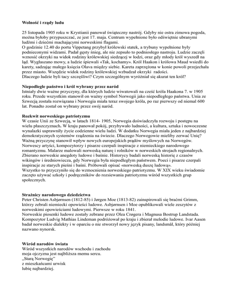 Wolność i rządy ludu 25 listopada 1905 roku w Krystianii panował świąteczny nastrój. Gdyby nie ostra zimowa pogoda, można byłoby przypuszczać, ze jest 17. maja. Centrum wypełnione było odświętnie ubranymi ludźmi i dziećmi machającymi norweskimi flagami. O godzinie 12.40 do portu Vippetang przybył królewski statek, a trybuny wypełnione były podnieconymi widzami. Padał gęsty śnieg, ale nie zepsuło to podniosłego nastroju. Ludzie zaczęli wznosić okrzyki na widok rodziny królewskiej siedzącej w łodzi, oraz gdy młody król wyszedł na ląd. Wygłaszano mowy, a ludzie śpiewali «Tak, kochamy». Król Haakon i królowa Maud wsiedli do karety, sadzając małego księcia Olava między siebie. Kareta zaprzężona w konie powoli przejechała przez miasto. Wszędzie widok rodziny królewskiej wzbudzał okrzyki radości. Dlaczego ludzie byli tacy szczęśliwi? Czym szczególnym wyróżniał się akurat ten król? Niepodległe państwo i król wybrany przez naród Istniały dwie ważne przyczyny, dla których ludzie wiwatowali na cześć króla Haakona 7. w 1905 roku. Przede wszystkim stanowił on ważny symbol Norwegii jako niepodległego państwa. Unia ze Szwecją została rozwiązana i Norwegia miała teraz swojego króla, po raz pierwszy od niemal 600 lat. Ponadto został on wybrany przez swój naród. Rozkwit norweskiego patriotyzmu W czasie Unii ze Szwecją, w latach 1814- 1905, Norwegia doświadczyła rozwoju i postępu na wielu płaszczyznach. W kraju panował pokój, przybywało ludności, a kultura, sztuka i nowoczesne wynalazki usprawniły życie codzienne wielu ludzi. W dodatku Norwegia miała jeden z najbardziej demokratycznych systemów rządzenia na świecie. Dlaczego Norwegowie mieliby zerwać Unię? Ważną przyczynę stanowił wpływ nowych europejskich prądów myślowych na Norwegów. Norwescy artyści, kompozytorzy i pisarze czerpali inspiracje z niemieckiego narodowego romantyzmu. Malarze malowali norweską naturę i rolników w norweskich strojach regionalnych. Zbierano norweskie anegdoty ludowe i baśnie. Historycy badali norweską historię z czasów wikingów i średniowiecza, gdy Norwegia była niepodległym państwem. Poeci i pisarze czerpali inspiracje ze starych pieśni i baśni. Próbowali opisać «norweską duszę ludową». Wszystko to przyczyniło się do wzmocnienia norweskiego patriotyzmu. W XIX wieku świadomie zaczęto używać szkoły i podręczników do rozsiewania patriotyzmu wśród wszystkich grup społecznych. Strażnicy narodowego dziedzictwa Peter Christen Asbjørnsen (1812-85) i Jørgen Moe (1813-82) zainspirowali się braćmi Grimm, którzy zebrali niemiecki opowieści ludowe. Asbjørnsen i Moe opublikowali wiele zeszytów z norweskimi opowieściami ludowymi. Pierwsze w roku 1841. Norweskie piosenki ludowe zostały zebrane przez Olea Crøgera i Magnusa Bostrup Landstada. Kompozytor Ludvig Mathias Lindeman podróżował po kraju i zbierał melodie ludowe. Ivar Aasen badał norweskie dialekty i w oparciu o nie stworzył nowy język pisany, landsmål, który później nazwano nynorsk. Wśród narodów świata Wśród wszystkich narodów wschodu i zachodu moja ojczyzna jest najbliższa memu sercu. „Starą Norwegię” z mieszkańcami urwisk lubię najbardziej. ... Kocham wszystko to co prawdziwie norweskie, - od życia ulicy, po śledzia i dorsza, co rozwija się by jednak upaść nieco ociężale. Kocham bardzo mój język brzmi ostro jak hartowana stal z głębi serca ... w potocznym języku Pera i Påla. Ale najbardziej kocham osady z domami wśród gór i morskich skał gdzie młodzi czczą swoich przodków którzy tu budowali. Wszyscy mamy wspólne korzenie, ku wspólnemu dobru, wspólną krwią, i wspólne wspomnienia jak fale płynące rzeką czasu. O Norwegii w podręczniku z 1882 roku „W tym kraju nasi ojcowie żyli, zmagali się z przeciwnościami losu i trwali na dobre i na złe. [...] Norweskie prawa są mądre i dobre, dają mi dużą wolność i chronią mnie przed przemocą i niesprawiedliwością. Niektóre państwa są zdecydowanie bogatsze niż moja ojczyzna, ale rzadko gdzie jest takie zdrowe powietrze i rzadko woda tak czysta i świeża jak tutaj. Dlatego właśnie będę kochać moja matkę Norwegię nad wszystkie kraje na ziemi; przyrzekam jej wierność i będę jej wdzięcznym i posłusznym synem, pilnym i łagodnym w czasie pokoju, odważnym w czasie wojny, jeśli kiedykolwiek znalazłaby się w niebezpieczeństwie”. Ole Vig (1824-57) Król Haakon był w rzeczywistości duńskim księciem. Miał na imię Carl, a jego syn nosił imię Alexander. Gdy Carl został wybrany na króla Norwegii w 1905 roku, zmienił imię na Haakon, a syn przyjął imię Olav. Na zdjęciu król Haakon i królowa Maud wraz z księciem Olavem na nartach w roku 1907. Król wybrany przez naród Z czasem gdy poczucie tożsamości narodowej było w Norwegii coraz silniejsze, Norwegowie zaczęli domagać się równouprawnienia w Unii ze Szwecją. Dotychczas tylko król i polityka zagraniczna były wspólne. Jakkolwiek Szwedzi mieli najwięcej do powiedzenia w Unii. Dlatego wielu Norwegów chciało zerwania Unii i utworzenia niepodległego państwa. Stało się to w roku 1905. Duński król Carl został poproszony o objęcie tronu niepodległej Norwegii. Zgodził się, ale poprosił aby ogłosić w tej sprawie referendum. Chciał być pewny, że naród norweski rzeczywiście chce mieć go za króla. Chcieli. 78,9 % wyborców głosowało za tym, aby państwo miało króla. Dlatego możemy powiedzieć, ze Haakon 7. był królem wybranym przez naród. Referendum: gdy cały naród, a więc wszyscy uprawnieni do głosowania, mają głosować nad określoną kwestią. Zazwyczaj wiąże się to z odpowiedzeniem TAK lub NIE na propozycję rządu. To była oficjalna flaga norweska z 1844 roku. Znak unijny w rogu nazywano «sałatką śledziową» i z czasem stał on się bardzo niepopularny wśród Norwegów. „Czysto” norweska fla