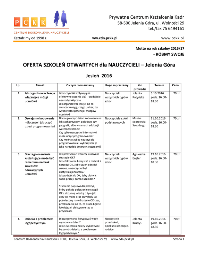 Prywatne Centrum Kształcenia Kadr 58-500 Jelenia Góra, ul. Wolności 29 tel./fax 75 6494161 Kształcimy od 1998 r. ww.cdn.pckk.pl www.pckk.pl Motto na rok szkolny 2016/17 - RÓBMY SWOJE OFERTA SZKOLEŃ OTWARTYCH dla NAUCZYCIELI – Jelenia Góra Jesień 2016 Lp. Temat O czym rozmawiamy Kogo zapraszamy 1. Jak organizować lekcje włączające mózgi uczniów? Nauczycieli wszystkich typów szkół 2. Oswajamy kodowanie - dlaczego i jak uczyć dzieci programowania? Jakie czynniki wpływają na efektywne uczenia się? - podejście neurodydaktyczne Jak organizować lekcje, na co zwracać uwagę, czego unikać, by wykorzystać potencjał mózgów uczniów? Dlaczego uczyć dzieci kodowania na lekcjach przyrody, polskiego czy geografii, albo w ramach edukacji wczesnoszkolnej? Czy tylko nauczyciel informatyki może uczyć programowania? Czy można szybko nauczyć się programowania i wykorzystać je jako narzędzie do pracy z uczniami? Nauczyciele szkół podstawowych 3. Dlaczego ocenianie kształtujące może być remedium na brak sukcesów edukacyjnych uczniów? Jak praktycznie wdrażać i rozwijać strategie OK? Jak efektywnie korzystać z technik i narzędzi OK, żeby uczeń odniósł sukces, a nauczyciel był usatysfakcjonowany? Jak podejść do OK, żeby ułatwić sobie pracę i pomóc uczniom? Kto prowadzi Jolanta Ratyńska Termin Cena 5.10.2016 godz. 16.0018.30 70 zł Monika KoprowskaSawzdargo 11.10.2016 godz. 16.0018.30 70 zł Nauczycieli wszystkich typów szkół Agnieszka Engler 19.10.2016 godz. 16.0018.30 70 zł Nauczyciele przedszkoli, opiekunki dziecięce, rodzice Jolanta Krudys 19.10.2016 godz. 16.0018.30 70 zł Szkolenie poprowadzi praktyk, który pokaże połączenie strategii OK z aktualną wiedzą o tym jak uczy się mózg oraz przykłady jak poświęcony na wdrożenie OK czas, przekłada się na to, że praca będzie łatwiejsza i efektywniejsza w przyszłości. 4. Dziecko z problemem logopedycznym Dlaczego warto korygować wady wymowy u dzieci? Jakie ćwiczenia należy wykonywać by pomóc dziecku z problemem logopedycznym? Centrum Doskonalenia Nauczycieli PCKK, Jelenia Góra, ul. Wolności 29, www.cdn.pckk.pl Strona 1 5. Jak skutecznie i efektywnie pracować z dzieckiem z nadpobudliwością psychoruchową, czyli sposoby na dziecko z ADHD w szkole i przedszkolu Odróżnianie objawów ADHD od zachowań niepożądanych. Poznanie zasad skutecznej komunikacji w pracy z dzieckiem z nadpobudliwością. Rozwinięcie umiejętności wspierania dziecka. Nabycie umiejętności prowadzenia lekcji zgodnie z możliwościami uczniów z zaburzeniami zachowań. Nauczycieli i pedagogów szkół podstawowych oraz wychowawców i nauczycieli przedszkoli Ewelina Pieprzak 25.10.2016 godz. 16.0018.30 70 zł 6. Uzależnienia behawioralne wśród dzieci i młodzieży Uzależnienia od sieci, gier komputerowych, komórek, jedzenia mają wspólny mianownik. Jakie symptomy mogą sygnalizować uzależnienie? Jak bezkonfliktowo rozmawiać o tym z uczniem, a jak z rodzicami? Jak stawiać granice i przestrzegać reguł? Kompetencje nauczyciela, a rola i odpowiedzialność rodzica Nauczycieli wszystkich typów szkół i placówek, Pedagogów szkolnych Bogusława UłanowiczPęcherczyk 26.10.2016 godz.16.0018.30 70 zł 7. Zastosowanie Metody Dobrego Startu we wspomaganiu rozwoju psychoruchowego dzieci 5-6 letnich Cele, znaczenia ćwiczeń w Metodzie Dobrego Startu Praktyczne zastosowanie metody - w ramach przygotowania dzieci do podjęcia nauki szkolnej, w okresie poprzedzającym naukę czytania i pisania - dla uczniów klas pierwszych, podczas lekcji, a także w formie zajęć śródlekcyjnych Rodzaje ćwiczeń – ćwiczenia ruchowe, ruchowo-słuchowe, ruchowo-słuchowo-wzrokowe oraz harmonizujące wszystkie funkcje psychomotoryczne Praktyczne zapoznanie z rodzajami ćwiczeń i wzorami graficznymi – kreślenie wzorów literopodobnych i grafomotorycznych Zabawy i ćwiczenia muzycznoruchowe Nauczycieli szkół podstawowych i przedszkoli Bożena Piotrowska 8.11.2016 godz. 16.00 – 19.00 80 zł 8. Oswajamy kodowanie - dlaczego i jak uczyć dzieci programowania? Dlaczego uczyć dzieci kodowania na lekcjach przyrody, polskiego czy geografii, albo w ramach edukacji wczesnoszkolnej? Czy tylko nauczyciel informatyki może uczyć programowania? Czy można szybko nauczyć się programowania i wykorzystać je jako narzędzie do pracy z uczniami? Nauczyciele szkół podstawowych Monika KoprowskaSawzdargo 9.11..2016 godz.16.0018.30 70 zł 9. Praca z dzieckiem z Zespołem Aspergera i Autyzmem w szkole masowej i przedszkolu Cele szkolenia: nabycie przez Uczestników szkolenia aktualnej wiedzy na temat autyzmu i zespołu Aspergera u dzieci, zrozumienie trudnych zachowań Pedagogów, psychologów, nauczycieli edukacji wczesnoszkolnej, nauczycieli przedmiotowców, Ewelina Pieprzak 16.11.2016 godz. 16.0018.30 70 zł Centrum Doskonalenia Nauczycieli PCKK, Jelenia Góra, ul. Wolności 29, www.cdn.pckk.pl Strona 2 10. Rytmika i tańce integracyjne jako metody rozwijania twórczej aktywności ruchowej dzieci w wieku przedszkolnym i wczesnoszkol-nym 11. Zaburzenia łaknienia I własnego wizerunku u nastolatków 12. Elementy muzykoterapii w pracy z dziećmi nadpobudliwymi ruchowo 13. Przemoc w sieci uczniów, poznanie techniki pracy z nimi, a także praktyczne wskazówki, nabycie umiejętności posługiwania się specjalnymi metodami i formami pracy podczas prowadzenia zajęć z dziećmi z ZA i Autyzmem otworzenie się na nowe prądy edukacyjne, dostosowane do ich potrzeb Rytmika i jej cele – metoda J. Dalcroze’a Gra na instrumentach perkusyjnych, proste aranżacje rytmiczne utworów Improwizacje muzyczno-ruchowe, układy ruchowe do piosenek (wykorzystanie i tworzenie własnych układów ruchowych) Zabawy rozwijające aktywność ruchową Proste ruchy taktowania Rozwój i usprawnianie zdolności intelektualnych (w tym koncentracji uwagi, pamięci, spostrzegawczości, zaburzeń zachowania) poprzez rytmiczne ćwiczenia i improwi