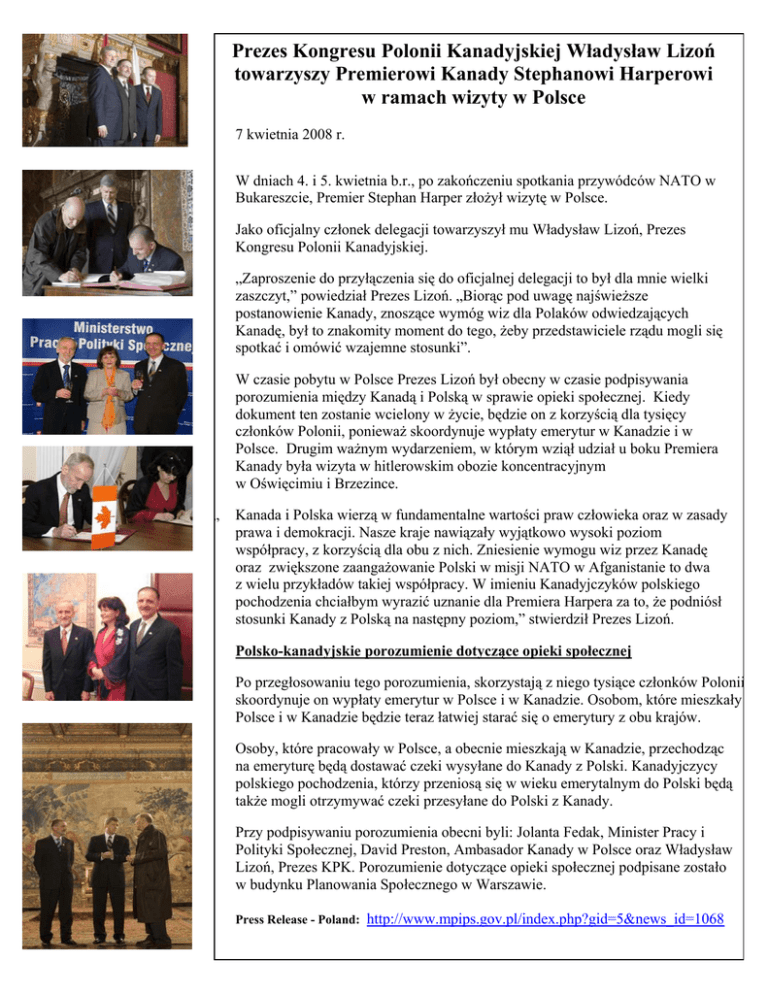 Prezes Kongresu Polonii Kanadyjskiej Władysław Lizoń towarzyszy Premierowi Kanady Stephanowi Harperowi w ramach wizyty w Polsce 7 kwietnia 2008 r. W dniach 4. i 5. kwietnia b.r., po zakończeniu spotkania przywódców NATO w Bukareszcie, Premier Stephan Harper złożył wizytę w Polsce. Jako oficjalny członek delegacji towarzyszył mu Władysław Lizoń, Prezes Kongresu Polonii Kanadyjskiej. „Zaproszenie do przyłączenia się do oficjalnej delegacji to był dla mnie wielki zaszczyt,” powiedział Prezes Lizoń. „Biorąc pod uwagę najświeższe postanowienie Kanady, znoszące wymóg wiz dla Polaków odwiedzających Kanadę, był to znakomity moment do tego, żeby przedstawiciele rządu mogli się spotkać i omówić wzajemne stosunki”. W czasie pobytu w Polsce Prezes Lizoń był obecny w czasie podpisywania porozumienia między Kanadą i Polską w sprawie opieki społecznej. Kiedy dokument ten zostanie wcielony w życie, będzie on z korzyścią dla tysięcy członków Polonii, ponieważ skoordynuje wypłaty emerytur w Kanadzie i w Polsce. Drugim ważnym wydarzeniem, w którym wziął udział u boku Premiera Kanady była wizyta w hitlerowskim obozie koncentracyjnym w Oświęcimiu i Brzezince. „ Kanada i Polska wierzą w fundamentalne wartości praw człowieka oraz w zasady prawa i demokracji. Nasze kraje nawiązały wyjątkowo wysoki poziom współpracy, z korzyścią dla obu z nich. Zniesienie wymogu wiz przez Kanadę oraz zwiększone zaangażowanie Polski w misji NATO w Afganistanie to dwa z wielu przykładów takiej współpracy. W imieniu Kanadyjczyków polskiego pochodzenia chciałbym wyrazić uznanie dla Premiera Harpera za to, że podniósł stosunki Kanady z Polską na następny poziom,” stwierdził Prezes Lizoń. Polsko-kanadyjskie porozumienie dotyczące opieki społecznej Po przegłosowaniu tego porozumienia, skorzystają z niego tysiące członków Polonii skoordynuje on wypłaty emerytur w Polsce i w Kanadzie. Osobom, które mieszkały Polsce i w Kanadzie będzie teraz łatwiej starać się o emerytury z obu krajów. Osoby, które pracowały w Polsce, a obecnie mieszkają w Kanadzie, przechodząc na emeryturę będą dostawać czeki wysyłane do Kanady z Polski. Kanadyjczycy polskiego pochodzenia, którzy przeniosą się w wieku emerytalnym do Polski będą także mogli otrzymywać czeki przesyłane do Polski z Kanady. Przy podpisywaniu porozumienia obecni byli: Jolanta Fedak, Minister Pracy i Polityki Społecznej, David Preston, Ambasador Kanady w Polsce oraz Władysław Lizoń, Prezes KPK. Porozumienie dotyczące opieki społecznej podpisane zostało w budynku Planowania Społecznego w Warszawie. Press Release - Poland: http://www.mpips.gov.pl/index.php?gid=5&news_id=1068