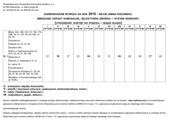 Przedsiębiorstwo Gospodarki Komunalnej Spółka z o.o. 97-500 Radomsko, ul. Stara Droga 85 tel. 44/ 683-42-26, 44/ 683-06-30 w.44 2016 - REJON GMINA RADOMSKO ZMIESZANE ODPADY KOMUNALNE, SELEKTYWNA ZBIÓRKA – SYSTEM WORKOWY (UTRUDNIONY DOSTĘP DO POSESJI – WĄSKI WJAZD) HARMONOGRAM WYWOZU NA ROK I II III IV V VI VII VIII IX X XI XII Z*P*S*M* Z*P*S*M* Z*P*S*M* Z*P*S*M* Z*P*S*M* Z*P*S*M* Z*P*S*M* Z*P*S*M* Z*P*S*M* Z*P*S*M* Z*P*S*M* Z*P*S*M* Bobry 14A, 14B, 14C, 15, 15A, 17A, 18B, 19, 21, 21A, 28, 29, 30A, 31, 33, 34, Cerkawizna, Dziepółć 42, 43, 44, 50, Grzebień 30A, Kietlin ul. Radomszczańska 37, 41A, 43, 45, 51, 59, 128, Nr 1 Klekowiec 8, 21 18 17 21 24 22 21 24 22 20 17 22 Płoszów ul. Guławska 8, 9, 13, ul. Leśna 16, Podcerkawizna, Szczepocice Rządowe 27, 28, 29, 46, 47, 48, 49, 50, 50A, 52, 52A, Strzałków ul. Kochanowskiego 15A, ul. Krótka *Z - zmieszane odpady komunalne *P - plastik ( tworzywa sztuczne, opakowania wielomateriałowe, metal ) *S - szkło ( bezbarwne, kolorowe ) *M - makulatura ( papier, tektura ) Wywóz odpadów wielkogabarytowych, zużytego sprzętu elektrycznego i elektronicznego oraz opon realizowany będzie raz na kwartał - daty wytłuszczone, po wcześniejszym zgłoszeniu telefonicznym w Urzędzie Gminy Radomsko pod numerem telefonu 44/683-24-13 wew. 112, zgłoszenia przyjmowane będą do ostatniego dnia miesiąca poprzedzającego wywóz. Odpady ulegające biodegradacji, odpady zielone (worek kolor szary) – wywóz w każdy pierwszy wtorek miesiąca po wcześniejszym zgłoszeniu telefonicznym w Urzędzie Gminy Radomsko pod numerem telefonu 44/683-24-13 wew. 112, zgłoszenia przyjmowane będą do każdego ostatniego dnia miesiąca.