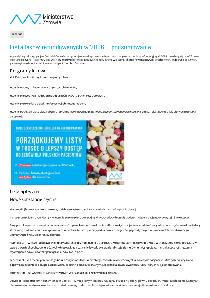 18.01.2017 Lista leków refundowanych w 2016 – podsumowanie Aby zwiększyć dostęp pacjentów do leków, cały czas pracujemy nad wprowadzaniem nowych cząsteczek na listę refundacyjną. W 2016 r. znalazły się tam 23 nowe substancje czynne. Poszerzyły one wachlarz możliwości terapeutycznych między innymi w leczeniu chorób nowotworowych, psychicznych, endokrynologicznych, gastrologicznych, w stwardnieniu rozsianym i chorobie Parkinsona. Programy lekowe W 2016 r. uruchomiliśmy 4 nowe programy lekowe: leczenie opornych i nawrotowych postaci chłoniaków, leczenie pierwotnych niedoborów odporności (PNO) u pacjentów dorosłych, leczenie przewlekłej białaczki limfocytowej obinutuzumabem, leczenie podtrzymujące olaparybem chorych na nawrotowego platynowrażliwego zaawansowanego raka jajnika, raka jajowodu lub pierwotnego raka otrzewnej. Lista apteczna Nowe substancje czynne Nasometin (Mometasonum) – we wszystkich zarejestrowanych wskazaniach na dzień wydania decyzji. Incruse (Umeclidinii bromidum) – w leczeniu przewlekłej obturacyjnej choroby płuc – leczenie podtrzymujące u pacjentów powyżej 18 roku życia. Arypiprazol w postaci zawiesiny do wstrzykiwań o przedłużonym uwalnianiu – dla dorosłych pacjentów ze schizofrenią, u których uzyskano odpowiednią stabilizację podczas leczenia arypiprazolem w postaci doustnej, w przypadku nawrotu objawów psychotycznych w wyniku udokumentowanego, uporczywego braku współpracy chorego. Pramipeksol – w leczeniu objawów idiopatycznej choroby Parkinsona u dorosłych, w monoterapii (bez lewodopy) lub w skojarzeniu z lewodopą, tzn. w czasie trwania choroby, do jej późnych okresów, kiedy działanie lewodopy słabnie lub staje się nierówne i występują wahania skuteczności leczenia (wyczerpanie dawki lub efekt przełączania-zjawisko „on-off”). Tapentadol – w leczeniu przewlekłego bólu o dużym nasileniu w przebiegu chorób nowotworowych u dorosłych pacjentów, u których nie uzyskano odpowiedniej kontroli bólu po zastosowaniu morfiny o zmodyfikowanym lub przedłużonym uwalnianiu lub u których nie jest tolerowana. Mometazon – we wszystkich zarejestrowanych wskazaniach na dzień wydania decyzji. Daivobet (calcipotriolum + betamethasonum), żel – w miejscowym leczeniu łuszczycy owłosionej skóry głowy u dorosłych. Miejscowe leczenie łuszczycy plackowatej o przebiegu łagodnym do umiarkowanego u dorosłych, umiejscowionej na skórze ciała innej niż owłosiona skóra głowy. Adenuric (febuksostat) 80 mg oraz 120 mg – w leczeniu przewlekłej hiperurykemii u dorosłych pacjentów w chorobach, w których wystąpiło już odkładanie się złogów moczanowych, gdy leczenie allopurinolem jest przeciwwskazane lub nie może być kontynuowane z powodu wystąpienia działań niepożądanych. Adenuric (febuksostat) 120 mg – w zapobieganiu i leczeniu przewlekłej hiperurykemii u dorosłych pacjentów poddawanych chemioterapii z powodu nowotworów krwi z umiarkowanym do wysokiego ryzykiem wystąpienia zespołu rozpadu guza, gdy leczenie allopurinolem jest przeciwskazane lub nie może być kontynuowane z powodu wystąpienia działań niepożądanych. Diacomit (styrypentol) – w terapii wspomagającej (w skojarzeniu z klobazamem i walproinianem) u pacjentów cierpiących na ciężką miokloniczną padaczkę niemowląt z uogólnionymi napadami toniczno-klonicznymi opornymi na leczenie klobazamem i walproinianem. Valdoxan (agomelatyna) – w leczeniu dużych epizodów depresyjnych u dorosłych z widocznymi w obrazie klinicznym objawami zaburzeń snu lub lęku lub anhedonii. Dodatkowe wskazania Od 1 maja 2016 r. poszerzyliśmy wykaz leków refundowanych dostępnych na receptę o dwa leki zawierające substancję czynną parykalcytol: Paricalcitol Teva, kaps. miękkie, 2 µg, 30 szt. Paricalcitol Teva, kaps. miękkie, 1 µg, 30 szt. Zostały one objęte refundacją (odpłatność pacjenta: 30% do wysokości limitu finansowania) w leczeniu wtórnej nadczynności przytarczyc związanej z przewlekłą niewydolnością nerek w stadium 3 i 4 oraz z przewlekłą niewydolnością nerek w stadium 5 u pacjentów poddawanych hemodializom lub dializom otrzewnowym, po nieskuteczności terapii alfakalcydolem. Od 1 września 2016 r. rozszerzyliśmy dostępność leku lanreotyd w ramach listy aptecznej o wskazanie dotychczas objęte refundacją jedynie w ramach katalogu chemioterapii, czyli leczenie guzów neuroendokrynnych żołądkowo-jelitowo-trzustkowych GEP-NET G1 i części G2 (index Ki67 do maksymalnie 10%) środkowej części prajelita, trzustki, po wykluczeniu ognisk pierwotnych w końcowej części prajelita, u dorosłych pacjentów z nieoperacyjnymi guzami miejscowo zaawansowanymi lub z przerzutami; Wskazania pozarejestracyjne Lakozamid – w terapii dodanej u chorych poniżej 16. roku życia z padaczką ogniskową z brakiem kontroli napadów lub nietolerancją leczenia po zastosowaniu co najmniej trzech prób terapii dodanej. Desmopresyna – w leczeniu pierwotnego izolowanego moczenia nocnego u pacjentów pomiędzy 5-6 rokiem życia z prawidłową zdolnością zagęszczania moczu po udokumentowaniu nieskuteczności 3-miesięcznego postępowania wspomagającego i motywującego. Posakonazol – w ramach listy aptecznej jest refundowany u dzieci do 18. roku życia jako wtórna profilaktyka przeciwgrzybicza, ukierunkowana na wcześniej występujące zakażenia grzybicze – do czasu zakończenia chemioterapii w przypadku: ostrej białaczki limfoblastycznej, chłoniaków złośliwych lub nowotworów litych. W katalogu chemioterapii lek jest dostępny w profilaktyce pierwotnej i wtórnej zakażeń grzybiczych u dzieci do 18. roku życia w przypadku ostrej białaczki limfoblastycznej standardowego lub pośredniego ryzyka, chłoniaków złośliwych lub nowotworów litych. Katalog chemioterapii Nowe substancje czynne Mitoxantron-Ebewe (Mitoxantronum) – lek zawiera substancję czynną mitoxantron. Erwinase (Crisantas