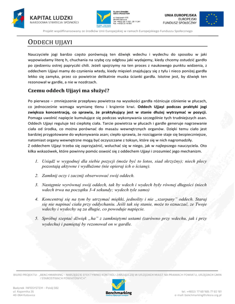 Projekt współfinansowany ze środków Unii Europejskiej w ramach Europejskiego Funduszu Społecznego ODDECH UJJAYI Nauczyciele jogi bardzo często porównują ten dźwięk wdechu i wydechu do sposobu w jaki wypowiadamy literę h, chuchania na szybę czy odgłosu jaki wydajemy, kiedy chcemy ostudzić gardło po zjedzeniu ostrej papryczki chili. Jeżeli spojrzymy na ten proces z naukowego punktu widzenia, z oddechem Ujjayi mamy do czynienia wtedy, kiedy mięsień znajdujący się z tyłu i nieco poniżej gardła lekko się zamyka, przez co powietrze delikatnie muska ścianki gardła. Istotne jest, by dźwięk ten rezonował w gardle, a nie w nozdrzach. Czemu oddech Ujjayi ma służyć? Po pierwsze – zmniejszenie przepływu powietrza na wysokości gardła różnicuje ciśnienie w płucach, co jednocześnie wzmaga wymianę tlenu i krążenie krwi. Oddech Ujjayi podczas praktyki jogi zwiększa koncentrację, co sprawia, że praktykujący jest w stanie dłużej wytrzymać w pozycji. Pomaga uwolnić napięcie kumulujące się podczas wykonywania szczególnie tych trudniejszych asan. Oddech Ujjayi reguluje też ciepłotę ciała. Tarcie powietrza w płucach i gardle generuje nagrzewanie ciała od środka, co można porównać do masażu wewnętrznych organów. Dzięki temu ciało jest bardziej przygotowane do wykonywania asan; ciepło sprawia, że rozciąganie staje się bezpieczniejsze, natomiast organy wewnętrzne mogą być oczyszczane z toksyn, które się w nich nagromadziły. Z oddechem Ujjayi trzeba się zaprzyjaźnić, wsłuchać się w niego, jak w najlepszego nauczyciela. Oto kilka wskazówek, które powinny pomóc oswoić się z oddechem Ujjayi i zrozumieć jego mechanizm. 1. Usiądź w wygodnej dla siebie pozycji (może być to lotos, siad skrzyżny); niech plecy pozostają aktywne i wydłużone (nie opieraj ich o ścianę). 2. Zamknij oczy i zacznij obserwować swój oddech. 3. Następnie wyrównaj swój oddech, tak by wdech i wydech były równej długości (niech wdech trwa na początku 3-4 sekundy; wydech tyle samo) 4. Koncentruj się na tym by utrzymać miękki, jednolity i nie „szarpany” oddech. Staraj się nie napinać ciała przy oddychaniu. Jeśli tak się stanie, może to oznaczać, ze Twoje wdechy i wydechy są za długie, co powoduje napięcie. 5. Spróbuj szeptać dźwięk „ha” z zamkniętymi ustami (zarówno przy wdechu, jak i przy wydechu) i pamiętaj by rezonował on w gardle. Projekt współfinansowany ze środków Unii Europejskiej w ramach Europejskiego Funduszu Społecznego TRÓJSTOPNIOWA PRANAYAMA We wszystkich pozycjach: Siad skrzyżny lub siad japoński (pozycja „diamentowa”). Oczy zamknięte. Oddech Ujjayi. Każdą sekwencję wdech-wydech liczymy 4/4/6/2, a więc: 4 (wdech), 4 (wstrzymaj), 6 (wydech), 2 (wstrzymaj). 1. Pozycja pierwsza. Ręce oparte na kościach biodrowych, łokcie skierowane prostopadle do boków ciała (na boki, równolegle do płaszczyzny ciała — uważać na odgięcie to tyłu lub do przodu.) 8 powtórzeń. 2. Pozycja druga. Kciuki wciśnięte w dołki pachowe. Ramiona i przedramiona zgięte i ustawione równolegle do podłogi — uważać na odgięcie w górę lub w dół. 8 powtórzeń. 3. Pozycja trzecia. Dłonie przeniesione do tyłu i oparte na łopatkach, łokcie celują prosto w sufit. 6 powtórzeń. Po wykonaniu serii oddechów w każdej pozycji, robimy chwilę przerwy; ręce odkładamy na uda, wewnętrzną stroną do góry; przenosimy uwagę do wewnątrz, oddychając swobodnie obserwujemy przez kilkanaście sekund odczucia z ciała. BHASTRIKA Siad skrzyżny lub siad japoński (pozycja „diamentowa”). Oczy zamknięte. Wykonujemy 3 serie po 15 oddechów. 1. Pozycja wyjściowa: Ręce z lekko zaciśniętymi pięściami na boki (jak w geście zwycięstwa lub przy podnoszeniu sztangi). 2. Wdech (przez nos): dynamiczne wyrzucenie rąk w górę (nad głowę) z jednoczesny rozprostowaniem palców. 3. Wydech (przez nos, mocno): dynamiczny powrót do pozycji wyjściowej; ręce opadają pod własnym ciężarem (nie trzeba ich mocno ściągać na dół), łokcie lekko uderzają w boki. Po każdej serii robimy chwilę przerwy; ręce odkładamy na uda, wewnętrzną stroną do góry; przenosimy uwagę do wewnątrz, oddychając swobodnie obserwujemy przez kilkanaście sekund odczucia z ciała.