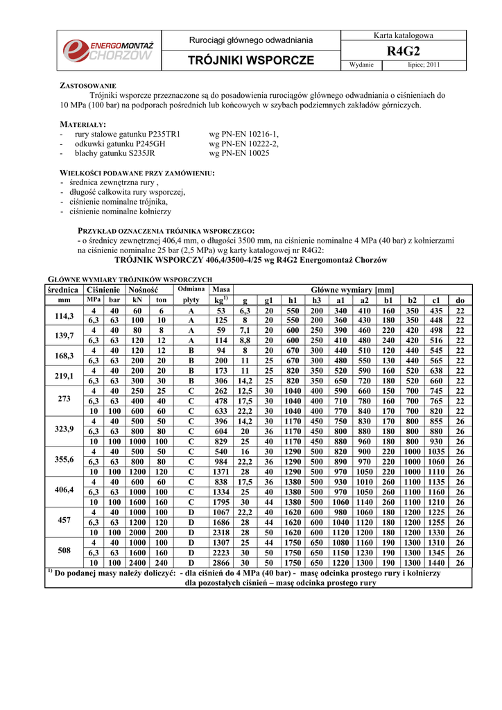 Karta katalogowa Rurociągi głównego odwadniania TRÓJNIKI WSPORCZE R4G2 2 Wydanie lipiec; 2011 ZASTOSOWANIE Trójniki wsporcze przeznaczone są do posadowienia rurociągów głównego odwadniania o ciśnieniach do 10 MPa (100 bar) na podporach pośrednich lub końcowych w szybach podziemnych zakładów górniczych. MATERIAŁY: - rury stalowe gatunku P235TR1 - odkuwki gatunku P245GH - blachy gatunku S235JR wg PN-EN 10216-1, wg PN-EN 10222-2, wg PN-EN 10025 WIELKOŚCI PODAWANE PRZY ZAMÓWIENIU: - średnica zewnętrzna rury , - długość całkowita rury wsporczej, - ciśnienie nominalne trójnika, - ciśnienie nominalne kołnierzy PRZYKŁAD OZNACZENIA TRÓJNIKA WSPORCZEGO: - o średnicy zewnętrznej 406,4 mm, o długości 3500 mm, na ciśnienie nominalne 4 MPa (40 bar) z kołnierzami na ciśnienie nominalne 25 bar (2,5 MPa) wg karty katalogowej nr R4G2: TRÓJNIK WSPORCZY 406,4/3500-4/25 wg R4G2 EnergomontaŜ Chorzów GŁÓWNE WYMIARY TRÓJNIKÓW WSPORCZYCH Odmiana Masa średnica Ciśnienie Nośność Główne wymiary [mm] MPa bar mm kN ton płyty kg1) g g1 h1 h3 a1 a2 b1 b2 c1 4 40 60 6 A 53 6,3 20 550 200 340 410 160 350 435 114,3 6,3 63 100 10 A 125 8 20 550 200 360 430 180 350 448 4 40 80 8 A 59 7,1 20 600 250 390 460 220 420 498 139,7 6,3 63 120 12 A 114 8,8 20 600 250 410 480 240 420 516 4 40 120 12 B 94 8 20 670 300 440 510 120 440 545 168,3 6,3 63 200 20 B 200 11 25 670 300 480 550 130 440 565 4 40 200 20 B 173 11 25 820 350 520 590 160 520 638 219,1 6,3 63 300 30 B 306 14,2 25 820 350 650 720 180 520 660 4 40 250 25 C 262 12,5 30 1040 400 590 660 150 700 745 273 6,3 63 400 40 C 478 17,5 30 1040 400 710 780 160 700 765 10 100 600 60 C 633 22,2 30 1040 400 770 840 170 700 820 4 40 500 50 C 396 14,2 30 1170 450 750 830 170 800 855 323,9 6,3 63 800 80 C 604 20 36 1170 450 800 880 180 800 880 10 100 1000 100 C 829 25 40 1170 450 880 960 180 800 930 4 40 500 50 C 540 16 30 1290 500 820 900 220 1000 1035 355,6 6,3 63 800 80 C 984 22,2 36 1290 500 890 970 220 1000 1060 10 100 1200 120 C 1371 28 40 1290 500 970 1050 220 1000 1110 4 40 600 60 C 838 17,5 36 1380 500 930 1010 260 1100 1135 406,4 6,3 63 1000 100 C 1334 25 40 1380 500 970 1050 260 1100 1160 10 100 1600 160 C 1795 30 44 1380 500 1060 1140 260 1100 1210 4 40 1000 100 D 1067 22,2 40 1620 600 980 1060 180 1200 1225 457 6,3 63 1200 120 D 1686 28 44 1620 600 1040 1120 180 1200 1255 10 100 2000 200 D 2318 28 50 1620 600 1120 1200 180 1200 1330 4 40 1000 100 D 1307 25 44 1750 650 1080 1160 190 1300 1310 508 6,3 63 1600 160 D 2223 30 50 1750 650 1150 1230 190 1300 1345 10 100 2400 240 D 2866 30 50 1750 650 1220 1300 190 1300 1440 1) Do podanej masy naleŜy doliczyć: - dla ciśnień do 4 MPa (40 bar) - masę odcinka prostego rury i kołnierzy dla pozostałych ciśnień – masę odcinka prostego rury do 22 22 22 22 22 22 22 22 22 22 22 26 26 26 26 26 26 26 26 26 26 26 26 26 26 26