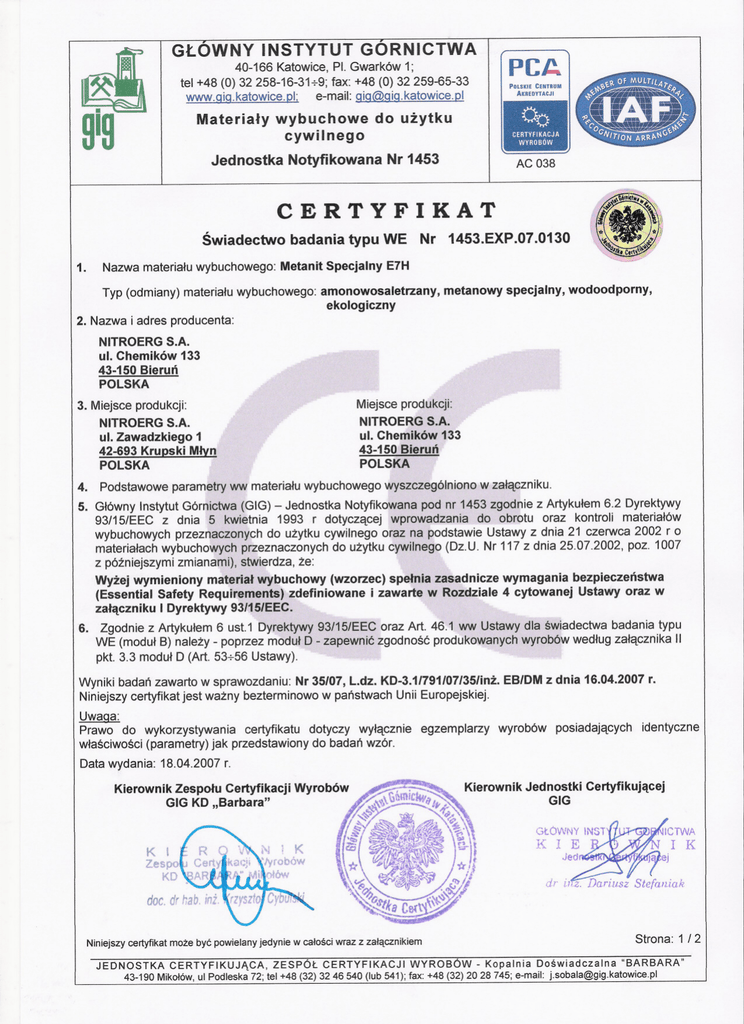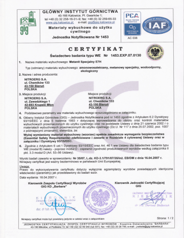 GLOWNY INSTYTUT GORNICTWA 40-166 Katowice, PI. Gwarków 1; tel +48 (O)32 258-16-31+9; fax: +48 (O)32 259-65-33 www.Qiq.katowice.pl: e-mail: [email protected] Materialy wybuchowe cywilnego POLSKIECENTRUM AKREDYTACJI do uzytku Jednostka Notyfikowana Nr 1453 AC 038 CERTYFIKAT Swiadectwo badania typu WE Nr 1453.EXP.07.0130 1. Nazwa materialu wybuchowego: Metanit Specjalny E7H Typ (odmiany)materialuwybuchowego:amonowosaletrzany, metanowyspecjalny,wodoodporny, ekologiczny 2. Nazwa i adres producenta: NITROERG S.A. ul. Chemików 133 43-150 Bierun POLSKA Miejsce produkcji: NITROERG S.A. ul. Chemików 133 43-150 Bierun POLSKA 3. Miejsce produkcji: NITROERG S.A. ul. Zawadzkiego 1 42-693 Krupski Mlvn POLSKA 4. Podstawowe parametry ww materialu wybuchowego wyszczególniono w zalaczniku. 5. Glówny Instytut Górnictwa (GIG) - Jednostka Notyfikowana pod nr 1453 zgodnie z Artykulem 6.2 Dyrektywy 93/15/EEC z dnia 5 kwietnia 1993 r dotyczacej wprowadzania do obrotu oraz kontroli materialów wybuchowych przeznaczonych do uzytku cywilnego oraz na podstawie Ustawy z dnia 21 czerwca 2002 r o materialach wybuchowych przeznaczonych do uzytku cywilnego (Dz.U. Nr 117 z dnia 25.07.2002, poz. 1007 z pózniejszymi zmianami), stwierdza, ze: Wyzej wymieniony material wybuchowy (wzorzec) spelnia zasadnicze wymagania bezpieczenstwa (Essential Safety Requirements) zdefiniowane i zawarte w Rozdziale 4 cytowanej Ustawy oraz w zalaczniku I Dyrektywy 93/15/EEC. 6. Zgodnie z Artykulem 6 ust.1 Dyrektywy 93/15/EEC oraz Art. 46.1 ww Ustawy dla swiadectwa badania typu WE (modul B) nalezy - poprzez modul D - zapewnic zgodnosc produkowanych wyrobów wedlug zalacznika \I pkt. 3.3 modul D (Art. 53+56 Ustawy). Wyniki badan zawarto w sprawozdaniu: Nr 35/07, L.dz. KD-3.11791/07/35/inz.EB/DMz dnia 16.04.2007 r. Niniejszy certyfikat jest wazny bezterminowo w panstwach Unii Europejskiej. Uwaqa: Prawo do wykorzystywania certyfikatu dotyczy wylacznie egzemplarzy wyrobów posiadajacych identyczne wlasciwosci (parametry) jak przedstawiony do badan wzór. Data wydania: 18.04.2007 r. Kierownik Jednostki Certyfikujacej GIG Kierownik Zespolu Certyfikacji Wyrobów GIG KD"Barbara" Strona: 1/2 Niniejszy certyfikat moze byc powielany jedynie w calosci wraz z zalacznikiem JEDNOSTKA CERTYFIKUJACA, ZESPÓL CERTYFIKACJI WYROBÓW - Kopalnia Doswiadczalna 43-190 Miko/ów, ul Podleska 72; tel +48 (32) 32 46 540 (lub 541); fax: +48 (32) 20 28 745; e-mail: "BARBARA" [email protected] GLÓWNY INSTYTUT GÓRNICTWA 40-166 Katowice, PI. Gwarków 1; tel +48 (O)32 258-16-31+9; fax: +48 (O)32259-65-33 www.qiq.katowice.pl: e-mail: qiq(Q).QiQ.katowice.pl Materialy wybuchowe do uzytku cywilnego Jednostka Notyfikowana Nr1453 Zalacz n i k do Certyfi katu Nr 1453.EXP.07.0130 Nazwa materialu wybuchowego: Typ materialu wybuchowego: - Metanit Specjalny E7H - amonowosaletrzany, metanowy specjalny, wodoodporny, ekologiczny Material wybuchowy Metanit Specjalny E7H przeznaczony jest do stosowania w zakladach górniczych podziemnych oraz w zakladach górniczych odkrywkowych jako material wybuchowy metanowy specjalny. Forma fizyczna: srednica 32 mm, masa 125 g - naboje w otoczkach papierowych srednica 36 mm, masa 150 g Srednia gestosc zanabojowania: Minimalna srednica naboju: 1,12 g/cm3 32 mm Cechy zewnetrzne: - struktura materialu - barwa materialu - barwa otoczki - sypka jasnozielona - kremowa Wlasnosci strzelnicze: - predkosc detonacji - wrazliwosc na inicjowanie Stabilnosc termiczna: Warunki ladowania MW do otworu strzalowego: 2100 mIs przy 032 mm detonuje od zapalnika zawierajacego min. 600 mg PETN lub lontu detonujacego z ladunkiem PETN min. 6 glmb 48 h w temperaturze 75 Oc moze byc ladowany do otworów suchych i zawodnionych Zakres stosowania: - temperatura od -20 Ocdo +50 Oc - odpornosc wytrzymuje skladowanie pod woda na glebokosci 0,20 m przez 5 h na wode Magazynowanie: - maksymalny - temperatura okres 6 miesiecy liczac od daty produkcji O Oc do 30 Oc Niszczenie: Szczególne warunki stosowania: Strona: Niniejszy certyfikat moze byc powielany jedynie w calosci wraz z zalacznikiem - 2 I2 JEDNOSTKA CERTYFIKUJACA, ZESPÓL CERTYFIKACJI WYROBÓW Kopalnia Doswiadczalna "BARBARA" 43-190 Mikol6w, ul Podleska 72; tel +48 (32) 3246540 (lub 541); fax: +48 (32) 20 28 745; e-mail: [email protected] GŁÓWNY INSTYTUT GÓRNICTWA 40-166 Katowice, PI. Gwarków 1; tel +48 (O) 32 258-16-3179; fax: +48 (O) 32 259-65-33 www.gig.katowice.pl: e-mail: [email protected] Materiały wybuchowe do użytku cywilnego ••~ Jednostka Notyfikowana Nr 1453 Załącznik do Certyfikatu uzupełniający badania typu .' ~ Nr 1/11 WE Nr 1453.EXP.07.0130 (z dnia 18.04.2007 r) 1. Nazwa materiału wybuchowego: - Metanit Specjalny E7H Typ materiału wybuchowego: - amonowosaletrzany, metanowy specjalny, wodoodporny, ekologiczny 2. Nazwa i adres producenta: NITROERG S.A. ul. Chemików 133 43-150 Bieruń POLSKA 3. Miejsce produkcji: Miejsce produkcji: NITROERG S.A. ul. Zawadzkiego 1 42-693 Krupski Młyn POLSKA NITROERG S.A. ul. Chemików 133 43-150 Bieruń POLSKA 4. Opis zmian Na podstawie 16.03.2011, wyników przeprowadzonych I.dz. KD-3.1/633/15/11/inż. badań zawartych MP/MP zmianie w Sprawozdaniu ulega punkt załącznika nr KD-3.1/15/11 z dnia - Zakres stosowania - temperatura. Punkt otrzymuje nowe brzmienie: Zakres stosowania: - temperatura: Pozostałe parametry materiału wybuchowego Oc do + 50 Oc powyżej +50 Oc do + 60 "c, - od - 20 - przy czym czas przebywania materiału wybuchowego w otworach strzałowych nie może przekroczyć 5 godzin nie ulegają zmianie. 5. Niniejszy Załącznik uzupełniający zachowuje ważność łącznie z Certyfikatem nr 1453.EXP.07.0130 18.04.2007 r oraz Załącznikiem uzupełniającym nr 1/10 z dnia 22.09.2010 r. z dnia 6. Data wydania: 28.03.2011 r. Specjalista do spraw certyfikacji materiałów wybuchowych s~,c ~~g,;l .. - ~ónict ~G.! Wet 1ft (~~ dr inż. Joe k Sabala ~ . ~\ \, u~.~~ ~o '\. ;...F..*"~ /~ 'S1k~ ce,'Y~~ '\t~~",. ··.rvrobO~ Niniejszy załącznik uzupełniający K