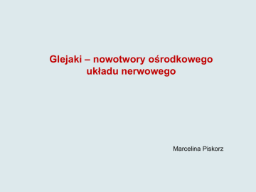 Glejaki – nowotwory ośrodkowego układu nerwowego Marcelina Piskorz Glejaki są guzami pochodzenia neuroepitelialnego, wywodzącymi się z prekursorów komórek glejowych. glej wyściółkowy oligodendroglej makroglej Tkanka glejowa mikroglej http://www.biologia.studies.uj.edu.pl Glejaki… Występują z częstością od 3 do 5 przypadków na 100 000 osób Częściej występują u osób rasy kaukaskiej niż pochodzenia azjatyckiego lub afrykańskiego Są częstsze u mężczyzn niż u kobiet Średni czas przeżycia chorych na glejaki złośliwe nie przekracza 1 roku http://www.google.com/imgres Czynniki sprzyjające występowaniu glejaków Czynniki środowiskowe: Ekspozycja na promieniowanie jonizujące Kontakt z pestycydami, chlorkiem winylu Zatrudnienie w przemyśle gumowym i przy rafinacji ropy naftowej Urazy głowy Czynniki genetyczne: Rodzinne występowanie glejaków mózgu Niektóre choroby dziedziczne: Zespół Turcota, neurofibromatoza typu 1, stwardnienie guzowate http://www.google.com/imgres? Morfologicznie wyróżnia się cztery typy glejaków: Gwiaździaki Skąpodrzewiaki Skąpogwiaździaki Wyściółczaki 1% 21% Gwiaździaki Skąpodrzewiaki 3% Skąpogwiaździaki Wyściółczaki 75% Gwiaździaki (astrocytoma) Wywodzą się z komórek makrogleju - astrocytów Najczęściej występują w przedziale 30 - 60 roku życia, głownie u mężczyzn U gwiaździaków występują wszystkie cztery stopnie zezłośliwienia (wg Światowej Organizacji Zdrowia: I – IV): Stopień złośliwości I II III IV Nazwa gwiaździaki włosowatokomórkowe gwiaździaki rozlane gwiaździaki anaplastyczne glejaki wielopostaciowe Wtórny glejak wielopostaciowy Pierwotny glejak wielopostaciowy Rozwija się z glejaków o niższym stopniu złośliwości Mutacje genów: Jedna lub kilka komórek prekursorowych - TP53 - PDGF Aktywacja szlaków MAPK, PI3K Inaktywacja szlaku p53 Inaktywacja szlaku RB - PTEN - EGFR - IDH Charakterystyczne fenotypowe cechy glejaków wielopostaciowych Inwazyjność Struktury satelitarne Struktury palisadowe HIPOKSJA Zdolność do wytwarzania swoistego unaczynienia Skąpodrzewiaki (oligodendroglioma) Wywodzą się z komórek gleju skąpowypustkowego Najczęściej występują w obrębie płatów czołowych Średni wiek pojawienia się objawów chorobowych wynosi ok. 40 lat Guzy te w 1-2% przypadków mogą rozprzestrzeniać się drogą płynu mózgowo - rdzeniowego http://www.google.com/imgres Skąpogwiaździaki (oligoastrocytoma) Występują najczęściej u dorosłych mężczyzn ze szczytem zapadalności w okresie 35 - 45 roku życia Lokalizują się głownie w płacie czołowym i skroniowym Skąpogwiaździaki to nowotwory anaplastyczne (WHO III), są to nowotwory mieszane o utkaniu histologicznym podobnym do skąpodrzewiaków i gwiaździaków http://www.google.com/imgres Wyściółczak (ependymoma) Bardzo rzadki typ glejaka, wywodzi się z gleju wyściółkowego Rozrasta się wolno, jest dość dobrze ograniczony Występuje w okolicach dna komory IV mózgu Wyściółczaki mogą rozwinąć się u osób w każdym wieku, ale obserwuje się zróżnicowanie lokalizacji zmiany: wewnątrzczaszkowe najczęściej rozwijają się u osób młodych (w pierwszych dwu dekadach życia), wewnątrzrdzeniowe dotyczą zazwyczaj osób dorosłych www.google.com/imgres Jedna lub kilka komórek prekursorowych Mutacje IDH, TP53 Wzrost PDGF Gwiaździak o niskim stopniu złośliwości Amplifikacja CDK4 Mutacje RB1 Nadekspresja MDM2 Gwiaździak anaplastyczny Amplifikacja EGFR, Nadekspresja VEGF Wtórny glejak wielopostaciowy Mutacje IDH Utrata 1p/19q Wzrost PDGF Skąpodrzewiak Mutacje RB1 Mutacja/Utrata PTEN Skąpogwiaździak Wzrost ciśnienia wewnątrzczaszkowego Dezorientacja Bóle głowy Symptomy występujące u chorych na glejaka Nudności Napady padaczkowe Ograniczenie czynności mózgu Metody diagnostyczne Tomografia komputerowa (TK) Rezonans magnetyczny (MRI) Pozytronowa tomografia emisyjna (PET) Komputerowa tomografia emisyjna pojedynczego fotonu (SPECT) http://www.google.com/imgres Metody terapeutyczne Leczenie operacyjne całkowite usunięcie guza zmniejszenie ciasnoty wewnątrzczaszkowej ustalenie rozpoznania histopatologicznego Brachyterapia polega na wprowadzeniu do guza izotopów promieniotwórczych Radioterapia metoda leczenia za pomocą promieniowania jonizującego Chemioterapia klasyczna chemioterapia ma ograniczone zastosowanie w leczeniu glejaków mózgu Temozolomid – lek przeciwnowotworowy o działaniu alkiliującym Cele: - hamowanie aktywności białek szlaków sygnałowych: PDGFR, EGFR (Imatinib) - hamowanie niedotlenienia (Digoksyna) - hamowanie inwazyjności (AMD3100) Rokowanie Czynnikami prognostycznymi dla czasu przeżycia są: rodzaj histopatologiczny nowotworu, lokalizacja guza, zakres operacji Prawdopodobieństwo przeżycia 5 lat po zdiagnozowaniu glejaka złośliwego jest mniejsze od 5%, a średni czas przeżycia rzadko przekracza 12 miesięcy W większości przypadków do wznowy glejaka złośliwego dochodzi w czasie 6 - 12 miesięcy Bibliografia Baluk P.: Cellular abnormalities of blood vessels as targets in cancer Brennan C.: Glioblastoma Subclasses Can Be Defined by Activity among Signal Transduction Pathways and Associated Genomic Alterations Hofer S., Lassman AB.: Molecular markers in gliomas: impact for the clinician Potemski P.: The molecular basis for treatment of gliomas Szala S., Jarosz M.: Tumor blood vessels. Postępy Hig. Med. Dośw., 2011; 65: 437–446 Szala S., Jarosz M., Smolarczyk R., Cichoń T.: Błędne koła glejaków: unaczynienie i inwazyjność Wen P.Y.: Malignant Gliomas in Adults http://www.onkologia.org.pl/pl/p/29 http://85.128.14.124/krn/