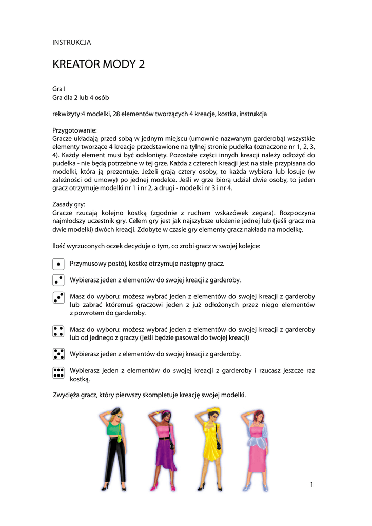 INSTRUKCJA KREATOR MODY 2 Gra I Gra dla 2 lub 4 osób rekwizyty:4 modelki, 28 elementów tworzących 4 kreacje, kostka, instrukcja Przygotowanie: Gracze układają przed sobą w jednym miejscu (umownie nazwanym garderobą) wszystkie elementy tworzące 4 kreacje przedstawione na tylnej stronie pudełka (oznaczone nr 1, 2, 3, 4). Każdy element musi być odsłonięty. Pozostałe części innych kreacji należy odłożyć do pudełka - nie będą potrzebne w tej grze. Każda z czterech kreacji jest na stałe przypisana do modelki, która ją prezentuje. Jeżeli grają cztery osoby, to każda wybiera lub losuje (w zależności od umowy) po jednej modelce. Jeśli w grze biorą udział dwie osoby, to jeden gracz otrzymuje modelki nr 1 i nr 2, a drugi - modelki nr 3 i nr 4. Zasady gry: Gracze rzucają kolejno kostką (zgodnie z ruchem wskazówek zegara). Rozpoczyna najmłodszy uczestnik gry. Celem gry jest jak najszybsze ułożenie jednej lub (jeśli gracz ma dwie modelki) dwóch kreacji. Zdobyte w czasie gry elementy gracz nakłada na modelkę. Ilość wyrzuconych oczek decyduje o tym, co zrobi gracz w swojej kolejce: Przymusowy postój, kostkę otrzymuje następny gracz. Wybierasz jeden z elementów do swojej kreacji z garderoby. Masz do wyboru: możesz wybrać jeden z elementów do swojej kreacji z garderoby lub zabrać któremuś graczowi jeden z już odłożonych przez niego elementów z powrotem do garderoby. Masz do wyboru: możesz wybrać jeden z elementów do swojej kreacji z garderoby lub od jednego z graczy (jeśli będzie pasował do twojej kreacji) Wybierasz jeden z elementów do swojej kreacji z garderoby. Wybierasz jeden z elementów do swojej kreacji z garderoby i rzucasz jeszcze raz kostką. Zwycięża gracz, który pierwszy skompletuje kreację swojej modelki. 1 Gra dla 2 lub 4 osób rekwizyty: 4 modelki, 20 elementów tworzących 4 kreacje, kostka, instrukcja. Przygotowanie: Gracze rozdzielają między siebie 4 modelki i odpowiadające im kreacje (oznaczone nr 5, 6, 7, 8 na tylnej stronie pudełka). Mogą je wybrać lub losować - zgodnie z umową. Jeśli jest dwóch graczy, to mają po 2 modelki, jeżeli czterech - to każdy gracz ma po 1 modelce. Gracze układają przed sobą w jednym miejscu (umownie nazwanym garderobą) wszystkie swoje elementy tak, aby każdy element był widoczny. Pozostałe części innych kreacji należy odłożyć do pudełka - nie będą potrzebne w tej grze. Zasady gry: Gracze rzucają kolejno kostką (zgodnie z ruchem wskazówek zegara). Rozpoczyna najmłodszy uczestnik gry. Liczba wyrzuconych przez niego oczek decyduje o tym, jaki może wybrać element ze swojej ,,garderoby”. Jeżeli gracz wyrzuci np. 2, a w swoich kreacjach wykorzystał już elementy przypisane do tej liczby, to traci szansę na pozyskanie elementu w tej kolejce i oddaje kostkę następnemu z graczy. Celem gry jest jak najszybsze ułożenie jednej lub (jeśli gracz ma dwie modelki) dwóch kreacji. Zdobyte w czasie gry elementy gracz nakłada na modelkę. Przyporządkowanie elementów kreacji do liczby wyrzuconych oczek: buty spodnie lub spódnica (w zależności od kreacji) bluzka nakrycie głowy dodatki - torebka (nr 5, 6), bransoletka (kreacja nr 7), pasek (nr 8) gracz ma do wyboru - może zabrać dowolny element do układanej przez siebie kreacji lub zamiast tego (jeżeli czuje się zagrożony przez przeciwnika) zabrać element z układanej przez przeciwnika kreacji i odłożyć go z powrotem do ,,garderoby” właściciela. Zwycięża gracz, który pierwszy skompletuje kreację swojej modelki. 2