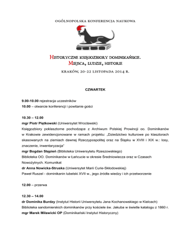 CZWARTEK 9.00-10.00 rejestracja uczestników 10.00 – otwarcie konferencji i powitanie gości 10.30 – 12.00 mgr Piotr Piętkowski (Uniwersytet Wrocławski) Księgozbiory poklasztorne pochodzące z Archiwum Polskiej Prowincji oo. Dominikanów w Krakowie zewidencjonowane w ramach projektu: „Dziedzictwo kulturowe po klasztorach skasowanych na ziemiach dawnej Rzeczypospolitej oraz na Śląsku w XVIII i XIX w.: losy, znaczenie, inwentaryzacja” mgr Bogdan Stępień (Biblioteka Uniwersytetu Rzeszowskiego) Biblioteka OO. Dominikanów w Łańcucie w okresie Średniowiecza oraz w Czasach Nowożytnych. Komunikat dr Anna Nowicka-Struska (Uniwersytet Marii Curie-Skłodowskiej) Paweł Ruszel - dominikanin lubelski XVII w., jego źródła wiedzy i ich przetworzenie 12.00 – przerwa 12.30 – 14.00 dr Dominika Burdzy (Instytut Historii Uniwersytetu Jana Kochanowskiego w Kielcach) Biblioteka sandomierskich dominikanów przy kościele św. Jakuba w świetle katalogu z 1860 r. mgr Marek Miławicki OP (Dominikański Instytut Historyczny) Księgozbiór biblioteki konwentu Bożego Ciała we Lwowie w świetle zachowanych inwentarzy i katalogów dr Katarzyna Zimnoch (Uniwersytet w Białymstoku) Historyczne księgozbiory dominikańskie na ziemiach podlaskich w XVII-XIX w. 14.00 – przerwa 15.00 – 16.30 dr Tomasz Stolarczyk (Uniwersytet Łódzki) Księgozbiór klasztoru Braci Kaznodziejów w Piotrkowie Trybunalskim w XVI-XVIII w. dr Grzegorz Wierzchowski O. Feliks z Sieradza (1537-1602) i jego rola w rozwoju księgozbioru sieradzkich dominikanów dr Iwona Pietrzkiewicz (Uniwersytet Pedagogiczny w Krakowie) Zbiory dominikanów grodzieńskich i ich opiekunowie 16.30 – przerwa 17.00 – 18.00 dr Alicja Szulc (Biblioteka Uniwersytecka w Poznaniu, Oddział Zbiorów Specjalnych) Rękopisy dominikańskie w zbiorach Biblioteki Uniwersyteckiej w Poznaniu. Ich autorzy, właściciele i zawiłe losy mgr Renata Wilgosiewicz-Skutecka (Biblioteka Uniwersytecka w Poznaniu) Ślady dawnych bibliotek dominikańskich w zbiorach starych druków Biblioteki Uniwersyteckiej w Poznaniu 18.15 dla chętnych spacer z przewodnikiem po krużgankach klasztoru oo. Dominikanów ----------------------------------------------------------- PIĄTEK 8.30 – 9.30 rejestracja uczestników 9.30 – 11.00 dr Jacek Partyka (Biblioteka Jagiellońska) Starodruki z bibliotek dominikańskich dawnej Rzeczpospolitej w zbiorach Biblioteki Jagiellońskiej dr Wiktor Szymborski (Instytut Historii, Uniwersytet Jagielloński) Dobrodzieje warszawskiej biblioteki klasztoru Dominikanów w okresie nowożytnym mgr Monika Mydel (Biblioteka Jagiellońska) Tradycja tomistyczna w zbiorach biblioteki Studium OO. Dominikanów w Krakowie. Katalog druków: XV–XVIII w.: powstanie, budowa, metody pracy. Komunikat 11.00 – przerwa 11.30 – 13.00 mgr Marek Bebak (Uniwersytet Jagielloński, Biblioteka oo. Bonifratrów w Krakowie) Z Oświęcimia na Kazimierz. Na marginesie badań proweniencyjnych w zbiorze starych druków krakowskich bonifratrów mgr Katarzyna Płaszczyńska-Herman (Uniwersytet Jagielloński, Biblioteka Kolegium Filozoficzno-Teologicznego Polskiej Prowincji Dominikanów) Oprawy donacyjne Abrahama Bzowskiego OP mgr Anna Jungiewicz (Uniwersytet Jagielloński) Biblioteka Fabiana Birkowskiego OP 13.00 – 14.30 przerwa 14.30 – 16.00 mgr Paulina Szklanna Repertuar XVIII-wiecznej kapeli dominikańskiej ze zbiorów offertoriów zachowanych w Gidlach dr Clarinda Calma (Wyższa Szkoła Europejska im. ks. J. Tischnera) Ecclesiae Militantis Triumphi: Unikatowy egzemplarz u oo. Dominikanów dr Gerard Kilroy (University College London) Edmund Campion’s Rationes Decem, and European book culture [Rationes Decem Edmunda Campiona oraz europejska kultura książki] (referat w języku angielskim, tłumaczony równolegle na j. polski) 16.00 - przerwa 16.30 – 17.30 Sępowe ślady – o sławie pośmiertnej Mikołaja Sępa Szarzyńskiego – wykład połączony z prezentacją jedynego zachowanego autografu Mikołaja Sępa Szarzyńskiego, odnalezionego niedawno w Bibliotece oo. Dominikanów. Wykład wygłosi dr hab. Janusz S. Gruchała, prof. UJ, autor m.in. naukowej edycji krytycznej poezji Mikołaja Sępa (M. Sęp Szarzyński, Poezje, oprac. i wstęp J. S. Gruchała, Kraków 1997 (Biblioteka Polska)) 17.30 – 20.00 BANKIET dla uczestników konferencji 20.15 – 21.00 KONCERT Jako rzecz piękna w wykonaniu zespołu wokalnego Collegium Palestrinae (w programie m.in. G. P. da Palestrina, C. de Morales, A. Lobo, H. Isaac, Wacław z Szamotuł, M. Gomółka); Bazylika Świętej Trójcy, ul. Stolarska 12 ---------------------------------------------------- SOBOTA 9.00 – 10.30 dr Mariusz Leńczuk (Instytut Języka Polskiego PAN w Krakowie, Pracownia Języka Staropolskiego) Staropolskie zaklęcie przeciwko jadowitym robakom dr Anna Ledzińska (Instytut Języka Polskiego PAN w Krakowie) Zachowany w rękopisie L XV 11 - żywot świętego Wojciecha i jego miejsce w tradycji dr Anna Zajchowska (Uniwersytet Kardynała Stefana Wyszyńskiego w Warszawie) Anonimowe zbiory kazań w średniowiecznych rękopisach z Archiwum Polskiej Prowincji Dominikanów w Krakowie 10.30 – przerwa 11.00 – 12.30 mgr Fryderyk Rozen (Biblioteka Narodowa) Druki łuckiej oficyny dominikanów w zbiorach Biblioteki Narodowej dr hab. Michał Kuran (Uniwersytet Łódzki, Katedra Literatury Staropolskiej i Nauk Pomocniczych) Drukowane oracje na obłóczyny i profesje zakonne dominikanek lwowskich w XVIII wieku — adresatki, autorzy, walory literackie, funkcje społeczne i kulturowe lic. Dominika Malinowska (Uniwersytet Mikołaja Kopernika w Toruniu) Dzieła autorów klasycznych w księgozbiorach dominikańskich w średniowiecznych miastach pruskich 12.30 – przerwa 13.00 – 14.30 Perspektywy badawcze bibliotek kościelnych - PANEL DYSKUSYJNY z udziałem zaproszonych gości ok. 14.30 – zakończenie konferencji (program może ulec zmianie)