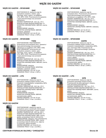 WĉĩE DO GAZÓW WĉĩE DO GAZÓW – SPAWANIE WĉĩE DO GAZÓW – SPAWANIE GAC ZASTOSOWAN IE: elastyczny w do przesyłania acetylenu, wodoru, gazu ziemnego, azotu, argonu, za wyjtkiem LPG, MPS i CNG. Przeznaczony do spawania i cicia płomieniowego oraz procesów pokrewnych. ZAKRES TEMPERATUR: -30 C do +70 C. WSPÓŁCZYNNIK BEZPIECZESTWA: 3:1 WARSTWA WEWNTRZNA: SBR/NR, czarna, gładka. WZMOCNIENIE: tekstylne. WARSTWA ZEWNTRZNA: SBR/NR, czerwona, ryflowana. ZAKRES REDNIC: od 4 do 25 mm. CINIENIE PRACY: 20 bar ( 2 MPa ). WĉĩE DO GAZÓW – SPAWANIE GOX ZASTOSOWANIE: elastyczny w do przesyłania tlenu. Przeznaczony do spawania i cicia płomieniowego oraz procesów pokrewnych za wyjtkiem LPG, MPS i CNG. ZAKRES TEMPERATUR: -30 C do +70 C. WSPÓŁCZYNNIK BEZPIECZESTWA: 3:1 WARSTWA WEWNTRZNA: SBR/NR, czarna, gładka. WZMOCNIENIE: tekstylne. WARSTWA ZEWNTRZNA: SBR/NR, niebieska, ryflowana. ZAKRES REDNIC: od 4 do 25 mm. CINIENIE PRACY: 20 bar ( 2 MPa ). WĉĩE DO GAZÓW – SPAWANIE TWIN ZASTOSOWANIE: W NIEBIESKI: przeznaczony do przesyłania tlenu, spawania i cicia płomieniowego oraz procesów pokrewnych za wyjtkiem LPG, MPS i CNG. W CZERWONY: przeznaczony do przesyłania acetylenu, wodoru, gazu ziemnego, azotu, argonu, za wyjtkiem LPG, MPS i CNG. Przeznaczony do spawania I cicia płomieniowego oraz procesów pokrewnych. ZAKRES TEMPERATUR: -30 C do +70 C. WSPÓŁCZYNNIK BEZPIECZESTWA: 3:1 WARSTWA WEWNTRZNA: SBR/NR, czarna, gładka. WZMOCNIENIE: tekstylne. WARSTWA ZEWNTRZNA: NR/EPDM, niebieska i czerwona, gładka. ZAKRES REDNIC: od 4 do 10 mm. CINIENIE PRACY: 20 bar ( 2 MPa ). WĉĩE DO GAZÓW – LPG GWPB ZASTOSOWANIE: elastyczny w do przesyłania ciekłego propanu-butanu LPG, mieszanki metyloacetylenu i propandienu MPS, gazu ziemnego CNG. Przeznaczony do spawania, cicia płomieniowego i procesów pokrewnych. ZAKRES TEMPERATUR: -30 C do +70 C. WSPÓŁCZYNNIK BEZPIECZESTWA: 3:1 WARSTWA WEWNTRZNA: NBR/SBR, czarna, gładka. WZMOCNIENIE: tekstylne. WARSTWA ZEWNTRZNA: SBR/NR, pomara czowa, gładka. ZAKRES REDNIC: od 4 do 20 mm. CINIENIE PRACY: 20 bar ( 2 MPa ). WĉĩE DO GAZÓW – LPG GPBD ZASTOSOWANIE: elastyczny w do przesyłania ciekłego propanu-butanu LPG, mieszanki metyloacetylenu i propandienu MPS, gazu ziemnego CNG. ZAKRES TEMPERATUR: -30 C do +70 C. WSPÓŁCZYNNIK BEZPIECZESTWA: 3:1 WARSTWA WEWNTRZNA: NBR/SBR, czarna, gładka. WZMOCNIENIE: tekstylne. WARSTWA ZEWNTRZNA: SBR/NR, pomara czowa, gładka. ZAKRES REDNIC: od 4 do 10 mm. CINIENIE PRACY: 6 bar ( 0,6 MPa ). GPB ZASTOSOWANIE: elastyczny w do przesyłania gazowego propanu-butanu. Przeznaczony do piecy gazowych, chłodnic, lamp dmuchaw przemysłowych. ZAKRES TEMPERATUR: -30 C do +70 C. WSPÓŁCZYNNIK BEZPIECZESTWA: 3:1 WARSTWA WEWNTRZNA: NBR/SBR, czarna, gładka. WZMOCNIENIE: tekstylne. WARSTWA ZEWNTRZNA: SBR/NR, pomara czowa, gładka. ZAKRES REDNIC: od 5 do 10 mm. CINIENIE PRACY: 12 bar ( 1,2 MPa ). WĉĩE DO GAZÓW GSS ZASTOSOWANIE: elastyczny w do przesyłania azotu w przemyle chemicznym, do czyszczenia zbiorników i cystern azotem. ZAKRES TEMPERATUR: -30 C do +60 C. WSPÓŁCZYNNIK BEZPIECZESTWA: 4:1 WARSTWA WEWNTRZNA: SBR, czarna, gładka, przewodzca ładunki elektryczne. WZMOCNIENIE: tekstylne, linka antystatyczna. WARSTWA ZEWNTRZNA: SBR, czarna, przewodzca ładunki elektryczne, odporna na cieranie, odbicie bandau. ZAKRES REDNIC: od 13 do 25 mm. CINIENIE PRACY: 6 bar ( 0,6 MPa ). CENTRUM HYDRAULIKI SIŁOWEJ “CHRZĄSTEK” Strona 39
