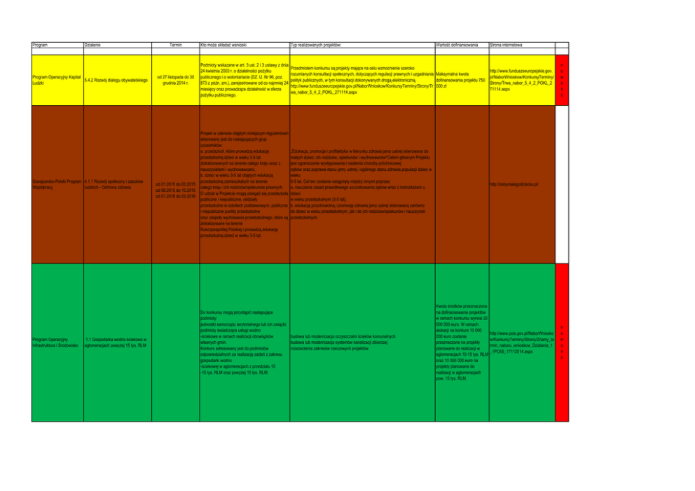 Program Działanie Program Operacyjny Kapitał 5.4.2 Rozwój dialogu obywatelskiego Ludzki Szwajcarsko-Polski Program 4.1.1 Rozwój społeczny i zasobów Współpracy ludzkich - Ochrona zdrowia Program Operacyjny Infrastruktura i Środowisko 1.1 Gospodarka wodno-ściekowa w aglomeracjach powyżej 15 tys. RLM Termin od 27 listopada do 30 grudnia 2014 r. od 01.2015 do 03.2015 od 08.2015 do 10.2015 od 01.2016 do 03.2016 Kto może składać wsnioski Typ realizowanych projektów: Podmioty wskazane w art. 3 ust. 2 i 3 ustawy z dnia 24 kwietnia 2003 r. o działalności pożytku publicznego i o wolontariacie (DZ. U. Nr 96, poz. 873 z późn. zm.), zarejestrowane od co najmniej 24 miesięcy oraz prowadzące działalność w sferze pożytku publicznego. Przedmiotem konkursu są projekty mające na celu wzmocnienie szeroko rozumianych konsultacji społecznych, dotyczących regulacji prawnych i uzgadniania Maksymalna kwota polityk publicznych, w tym konsultacji dokonywanych drogą elektroniczną. dofinansowania projektu 750 http://www.funduszeeuropejskie.gov.pl/NaborWnioskow/KonkursyTerminy/Strony/Tr 000 zł wa_nabor_5_4_2_POKL_271114.aspx http://www.funduszeeuropejskie.gov. pl/NaborWnioskow/KonkursyTerminy/ Strony/Trwa_nabor_5_4_2_POKL_2 71114.aspx Projekt w zakresie objętym niniejszym regulaminem skierowany jest do następujących grup uczestników: a. przedszkoli, które prowadzą edukację przedszkolną dzieci w wieku 3-5 lat zlokalizowanych na terenie całego kraju wraz z nauczycielami i wychowawcami, b. dzieci w wieku 3-5 lat objętych edukacją przedszkolną zamieszkałych na terenie całego kraju i ich rodziców/opiekunów prawnych. O udział w Projekcie mogą ubiegać się przedszkola publiczne i niepubliczne, oddziały przedszkolne w szkołach podstawowych, publiczne i niepubliczne punkty przedszkolne oraz zespoły wychowania przedszkolnego, które są zlokalizowane na terenie Rzeczpospolitej Polskiej i prowadzą edukację przedszkolną dzieci w wieku 3-5 lat. „Edukacja, promocja i profilaktyka w kierunku zdrowia jamy ustnej skierowana do małych dzieci, ich rodziców, opiekunów i wychowawców"Celem głównym Projektu jest ograniczenie występowania i nasilenia choroby próchnicowej zębów oraz poprawa stanu jamy ustnej i ogólnego stanu zdrowia populacji dzieci w wieku 0-5 lat. Cel ten zostanie osiągnięty między innymi poprzez: a. nauczanie zasad prawidłowego szczotkowania zębów wraz z instruktażem u dzieci w wieku przedszkolnym (3-5 lat), b. edukację prozdrowotną i promocję zdrowia jamy ustnej skierowaną zarówno do dzieci w wieku przedszkolnym, jak i do ich rodziców/opiekunów i nauczycieli przedszkolnych. http://zebymalegodziecka.pl/ Do konkursu mogą przystąpić następujące podmioty: jednostki samorządu terytorialnego lub ich związki; podmioty świadczące usługi wodno budowa lub modernizacja oczyszczalni ścieków komunalnych -ściekowe w ramach realizacji obowiązków własnych gmin. budowa lub modernizacja systemów kanalizacji zbiorczej Konkurs adresowany jest do podmiotów rozszerzenia zakresów rzeczowych projektów odpowiedzialnych za realizację zadań z zakresu gospodarki wodno -ściekowej w aglomeracjach z przedziału 10 -15 tys. RLM oraz powyżej 15 tys. RLM. Wartość dofinansowania Kwota środków przeznaczona na dofinansowanie projektów w ramach konkursu wynosi 20 000 000 euro. W ramach alokacji na konkurs 10 000 000 euro zostanie przeznaczone na projekty planowane do realizacji w aglomeracjach 10-15 tys. RLM oraz 10 000 000 euro na projekty planowane do realizacji w aglomeracjach pow. 15 tys. RLM. Strona internetowa http://www.pois.gov.pl/NaborWniosko w/KonkursyTerminy/Strony/Znamy_te rmin_naboru_wnioskow_Dzialania_1 _1POIiS_17112014.aspx n o w o ś ć n o w o ś ć 1.1.Gospodarka wodno-ściekowa w aglomeracjach Część 1) Współfinansowanie I osi POIiŚ Nabór ciągły od 1 stycznia każdego roku do wyczerpania budżetu programu na dany rok 1) budowa i modernizacja systemów kanalizacji zbiorczej; 2) budowa, rozbudowa lub modernizacja oczyszczalni ścieków komunalnych. W 1) jednostki samorządu terytorialnego i ich związki; przypadku kompeleksowych realizacji projektów może zostać włączona budowa i 2) podmioty świadczące usługi publiczne w ramach modernzacja systemów zaopatrzenia w wodę oraz budowa kanalizacji deszczowej, realizacji zadań własnych jednostek samorządu pod warunkiem przyczyniania się do spełnienia dyrektywy 91/271EWG oraz terytorialnego. spełnienie warunków, iż co najmniej 50% kosztów całkowitych przedsięwzięcia dot. kanalizacji sanitarnej i oczyszczania ścieków 1) dopłaty do oprocentowania kredytów bankowych; 2) dopłaty do ceny wykupu obligacji; 3) pożyczki 1) budowa, rozbudowa lub modernizacja oczyszczalni ścieków komunalnych (także 1) jednostki samorządu terytorialnego i ich związki; w zakresie dotyczącym przetwarzania osadów ściekowych); 2) podmioty świadczące usługi publiczne w ramach 2) budowa, rozbudowa lub modernizacja zbiorczych systemów kanalizacji sanitarnej realizacji zadań własnych jednostek samorządu (zakres przedsięwzięć zgodny z rozporządzeniem Ministra Środowiska w sprawie terytorialnego. sposobu wyznaczania obszaru i granic aglomeracji). 1) dopłaty do oprocentowania kredytów bankowych; 2) dopłaty do ceny wykupu obligacji; 3) pożyczki 1.1.Gospodarka wodno-ściekowa w aglomeracjach Część 2) Gospodarka ściekowa w ramach Krajowego Programu Oczyszczania Ścieków Komunalnych Nabór ciągły od 1 stycznia każdego roku do wyczerpania budżetu programu na dany rok 1.1 Gospodarka wodno-ściekowa Konkurs zamknięty nr 15/POIiŚ/1.1/12/2014 jednostki samorządu terytorialnego lub ich związki; budowa lub modernizacja oczyszczalni ścieków komunalnych, budowa lub od 15 grudnia 2014 r. do podmioty świadczące usługi wodno-ściekowe w modernizacja systemów kanalizacji zbiorczej, rozszerzenia zakresów rzeczowych 19 stycznia 2015 r ramach realizacji obowiązków w