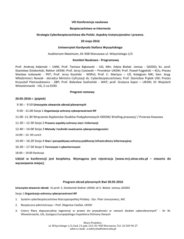 VIII Konferencja naukowa Bezpieczeństwo w Internecie Strategia Cyberbezpieczeństwa dla Polski. Aspekty instytucjonalne i prawne. 20 maja 2016 Uniwersytet Kardynała Stefana Wyszyńskiego Auditorium Maximum, 01-938 Warszawa ul. Wóycickiego 1/3 Komitet Naukowo - Programowy Prof. Andrzej Adamski – UMK; Prof. Tomasz Bąkowski - UG; Min. Edyta Bielak- Jomaa - GIODO; Ks. prof. Stanisław Dziekoński, Rektor UKSW; Prof. Jerzy Cytowski – Prorektor UKSW; Prof. Paweł Fajgielski – KUL; Prezes Wacław Iszkowski - PIIT; Prof. Jerzy Kosiński - WSPol; Prof. C. Martysz – UŚ, Kolegium NIK; Gen. bryg. Włodzimierz Nowak - doradca Ministra Cyfryzacji ds. Cyberbezpieczeństwa; Prof. Stanisław Piątek UW; Prezes Krzysztof Pietraszkiewicz - ZBP; Prof. Bolesław Szafrański - WAT; prof. Grażyna Szpor – UKSW; Dr Wojciech Wiewiórowski - UG, Z-ca EIOD. Program ramowy 20.05.2016 r. (piątek) 9 30 – 9 50 Uroczyste otwarcie obrad plenarnych 9.50 - 11.00 Sesja 1 Organizacja ochrony cyberprzestrzeni RP 11.00 -11.30 Wręczenie Dyplomów Studiów Podyplomowych ODOiN/ Briefing prasowy/ / Przerwa Kawowa 11.30 – 12.30 Sesja 2 Prawne aspekty ochrony sieci i informacji 12.40 – 14.00 Sesja 3 Metody i techniki zwalczania cyberprzestępczości 14.00 – 14. 40 Lunch 14.40 – 16.20 Sesja 4 Stan i perspektywy ochrony publicznej infrastruktury informacyjnej 16.30 – 17.50 Sesja 5 Terroryzm i cyberterroryzm 18.00 – 19.00 Dyskusja Udział w konferencji jest bezpłatny. Wymagana jest rejestracja [www.mrj.uksw.edu.pl – otwarta do wyczerpania miejsc]. Program obrad plenarnych BwI 20.05.2016 Uroczyste otwarcie obrad: Ks.prof. S. Dziekoński Rektor UKSW; dr E. Bielak- Jomaa, GIODO Sesja 1 Organizacja ochrony cyberprzestrzeni RP 1. System cyberbezpieczeństwa Rzeczypospolitej Polskiej - Dyr. Piotr Januszewicz, MC 2. Bezpieczna administracja – Prof. Zbigniew Cieślak, UKSW 3. Cztery filary dopuszczalnej ingerencji w prawo do prywatności w ramach działań cyberobronnych” - Dr W. Wiewiórowski, UG, Zastępca Europejskiego Inspektora Ochrony Danych Biuro Projektu : ul. Wóycickiego 1/3, bud. 21 pok. 313, 01-938 Warszawa. Tel. 22 569 96 27 adres e-mail: [email protected] 4. Partnerstwo publiczno – prywatne na rzecz cyberbezpieczeństwa - Prezes ZBP K. Pietraszkiewicz 5. Rola organizacji pozarządowych w budowie cyberbezpieczeństwa Państwa - Prezes PIIT W. Iszkowski Sesja 2 Prawne aspekty ochrony sieci i informacji 6. Europejskie standardy ochrony sieci i informacji oraz ich implementacja do prawa polskiego - Prof. A. Adamski, UMK 7. Ochrona sieci i informacji w normach Prawa telekomunikacyjnego - Prof. B Fajgielski, KUL 8. Regulacja rozwoju Internetu rzeczy w prawie telekomunikacyjnym - Jacek Kowalski, Biuro BEREC, UKSW 9. Dostosowanie regulacji informatyzacji wykonywania zadań publicznych do nowych zagrożeń - Prof. T. Bąkowski, UG 10. Prawo a etos cyberprzestrzeni - Dr Karol Dobrzeniecki, UMK Sesja 3 Metody i techniki zwalczania cyberprzestępczości 11. Zwalczanie cyberprzestępczości a statystyczne zastosowania baz danych - Prof. B. Szafrański, WAT 12. Neutralność sieci a bezpieczeństwo - Dyr. P. Durbajło, UKE 13. Publiczne rejestry i zasoby danych a cyberprzestępczość - Dr inż. M. Kiedrowicz, WAT 14. Kradzież tożsamości a metody jej identyfikacji - Dr K. Czaplicki, UKSW 15. Struktura cyberprzestępczości - Dr inż. A. Gryszczyńska, UKSW 16. Próba oceny zwalczania cyberprzestępczości w Polsce – Prof. J. Kosiński, WSPol Sesja 4 Stan i perspektywy ochrony publicznej infrastruktury informacyjnej 17. Zarządzanie bezpieczeństwem informacji w urzędach - M. Szmit, dr inż. D. Lisiak-Felicka, UŁ 18. Przeciwdziałanie cyberatakom przez przedsiębiorstwa - Dr Jowita Sobczak KSOIN. 19. Dostęp do informacji publicznej a cyberbezpieczeństwo - dr Piotr Sitniewski, KSAP 20. Nowe trendy w ochronie cyberprzestrzeni - P. Trąbiński NCSS Sesja 5 Terroryzm i cyberterroryzm 21. Mapy zagrożenia terroryzmem - P. Niemczyk 22. Geolokalizacja a cyberbezpieczeństwo - M. Badowski, UOsnabruck 23. Profilowanie a cyberbezpieczeństwo - E. Niezgódka 24. Wystąpienia doktorantów i KN Forum Prawa Publicznego 25. Polski model regulacji jawności i jej ograniczeń a obronność i bezpieczeństwo państwa - Prof. G. Szpor, UKSW W dotychczasowych konferencjach uczestniczyło średnio około trzystu osób, w tym pracownicy naukowi wielu uczelni, przedstawiciele administracji publicznej, wymiaru sprawiedliwości i organizacji pozarządowych. Dorobek kolejnych edycji konferencji ukazują książki: „Internet. Ochrona wolności własności bezpieczeństwa” 2011; „Internet. Sieci, portale, e-usługi” 2012; „Internet. Cloud computing. Przetwarzanie w Chmurach” 2013; „Internet. Publiczne bazy danych i Big data” 2014; „Internet rzeczy. Bezpieczeństwo Smart city” 2015; oraz strona internetowa: www.mrj.uksw.edu.pl Biuro Projektu : ul. Wóycickiego 1/3, bud. 21 pok. 313, 01-938 Warszawa. Tel 22 569 96 27 adres e-mail: [email protected]