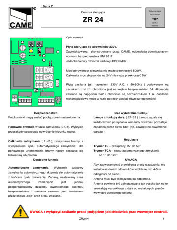 Seria Z Dokumentacja Centrala sterująca techniczna ZR 24 T07 ver 0.1 03/2002 Opis centrali Płyta sterująca do siłowników 230V. Zaprojektowana i skonstruowany przez CAME, odpowiada obowiązującym normom bezpieczeństwa UNI 8612 Jednokanałowy odbiornik radiowy 433,92MHz Moc sterowanego siłownika nie może przekroczyć 500W. Całkowita moc akcesoriów na 24V nie może przekroczyć 5W. Płyta zasilana jest napięciem 230V A.C. ( 50-60Hz ) podawanym na zaciskach L1-l L2 i chroniona jest na wejściu bezpiecznikiem 5A. Akcesoria zasilane są napięciem 24V i chronione są bezpiecznikiem 1 A. Zasilanie niskonapięciowe może w razie potrzeby zasilać również fotokomórki. Inne wybieralne funkcje Bezpieczeństwo Fotokomórki mogą zostać podłączone i nastawione na: Lampa z funkcją stałą. ( E1-E3 ) Lampa zapala się każdorazowo po wydaniu komendy otwarcia i pozostaje Ponowne otwarcie w fazie zamykania (2-C1). Wykrycie zapalona przez okres 130’’ (np. zewnętrzne oświetlenie przeszkody spowoduje odwrócenie kierunku ruchu. garażu ) Regulacje Całkowite zatrzymanie ( 1 –2 ), zatrzymanie bramy, z wyłączeniem cyklu automatycznego zamykania; Dla Trymer TL – czas pracy 15’’ do 50’’ ponownego uruchomienia bramy należy posłużyć się Trymer TCA – czasu automatycznego zamykania od 1’’ do 120’’ klawiaturą lub pilotem UWAGA Dostępne funkcje Automatyczne Aby zagwarantować prawidłową pracę urządzenia, nie zamykanie. Wyłącznik czasowy zamykania automatycznego aktywuje się automatycznie z końcem cyklu otwierania. Zadany, nastawiany czas automatycznego podporządkowany zamknięcia działaniu jest ewentualnego jednak osprzętu bezpieczeństwa i nastawa czasowa jest anulowana instalować dwóch odbiorników w bliższej niż 4-5 m odległości od siebie. Antena musi być podłączona do odbiornika. Antena powinna być zainstalowana tak wysoko jak na to zezwalają warunki oraz z dala od metalowych prętów wewnątrz zbrojonego betonu. przez impuls „stop” oraz braku zasilania . UWAGA : wyłączyć zasilanie przed podjęciem jakichkolwiek prac wewnątrz centrali. ZR24N 1 PŁYTA GŁÓWNA GŁÓWNE ELEMENTY 1 – Listwa podłączeniowa 2 – Bezpiecznik 5A ( wejście ) 3 – Bezpiecznik 1A ( zasilanie akcesoriów ) 4 – Przycisk programowania sterowania radiowego 5 – Trymer TL : regulacja czasu pracy . 6 – Trymer TCA : regulacja czasu automatycznego zamykania 7 - Przełącznik dip-switch (patrz opis funkcji) 8 – Gniazdo do podłączenia karty radiowej 9 - LED sygnalizacyjna WYBÓR FUNKCJI 1 – ON aktywowane zamykanie automatyczne 2 - ON aktywne OTWÓRZ – STOP- ZAMKNIJ – STOP sterownie z zacisku 2-7 / wpięta karta radiowa AF 2 - OFF aktywne ZAMKNIJ – OTWÓRZ sterownie z zacisku 2-7 / wpięta karta radiowa AF REGULACJE Trymer TL regulacja czasu pracy od 15 ‘’ do 50 ‘’ Uwaga : funkcja „operator obecny „ aktywna przy ustawieniu trymera „TL” na minimum Trymer TCA ZR24N regulacja czasu automatycznego zamykania (od 1’’ do 120 ‘’) 2 PODŁĄCZENIA ELEKTRYCZNE L1 L2 Zasilanie 230V A.C. U V W Jednofazowy silnik 220-230V W E1 Wyjście 230V A.C. podczas ruchu ( np. lampa ostrzegawcza ) E1 E3 Lampa z funkcją stałą ( max 25W ) 10 11 Wyjście 24V- akcesoria( max 5 W ) 1 2 Przycisk stop ( N.C. ) jeżeli nie używany zmostkować 2 7 Przycisk „otwieranie - zamykanie” ( N.O. ) 2 C1 Zestyk FOTO (N.C.) ponownego otwierania w fazie zamykania Podłączenie anteny ZR24N 3 INSTALOWANIE STEROWANIA RADIOWEGO A. Umieścić kartę radiową w gnieździe na płycie głównej ( dotyczy zarówno AF4S jak i AF43SP) Kartę radiową instalować przy wyłączonym zasilaniu ! A. B. Zakodować piloty PILOTY TOP (Piloty TOP432NA, TOP434NA) Ustaw we wszystkich pilotach taki sam kod, przekopiuj go z jednego pilota na pozostałe. Kopiowanie kodu z pilota MASTER do innego pilota 1) wciśnij i trzymaj wciśnięte dwa przyciski pilota jednocześnie do momentu kiedy dioda zacznie migać szybciej 2) wtedy naciśnij przycisk programowanego kanału 3) w ciągu 10 sek. nadaj sygnał z działającego pilota, naciskając przycisk danego kanału na ok. 1 sek. Piloty ułożyć dokładnie jak na rys.3 Po zapisaniu kodu kodowany pilot zasygnalizuje to trzema mignięciami diodą LED. STEROWANIE RADIOWE SPACE (piloty SP2, SP4) ZR24N 4 Wpisz piloty do pamięci karty radiowej AF43SP. W tym celu : - naciśnij i przytrzymaj przez 2 sek. przycisk 1 na karcie radiowej (jeżeli programowany przycisk ma obsługiwać kanał 1) lub przycisk 2 (jeżeli programowany przycisk pilota ma obsługiwać kanał 2) – dioda LED zacznie pulsować. - w ciągu 20 sek. naciśnij przycisk pilota , który ma zostać wpisany-dioda LED na chwilę zaświeci światłem ciągłym sygnalizując odebranie poprawnego sygnału pilota. - w celu zaakceptowania , nacisnąć przycisk CLR na karcie radiowej lub poczekać aż dioda LED zgaśnie. - dla wpisania kolejnych przycisków lub innych pilotów postępuj zgodnie wg pkt 1…3. - karta AF43SP zapamietuje max 15 pilotów, próba wpisania 16 pilot zakończy się niepowodzeniem. Po wpisaniu wszystkich pilotów do karty radiowej AF43SP wpisać dowolneg pilota SPACE do karty głównej. C. Zapisz piloty w pamięci płyty głównej . Aby zapisać piloty do pamięci elektroniki należy : - wcisnąć i trzymać wciśnięty przycisk programowania CH1; dioda będzie migać. - trzymając wciśnięty przycisk CH1 wciśnij przycisk pilota wysyłając sygnał ; dioda zapali się swatałem stałym co będzie sygnalizować zapisanie kodu w pamięci płayty głównej. Wszystkie dane przytoczone w niniejszej instrukcji są orientacyjne. CAME S.A. zastrzega sobie prawo wprowadzenia ewentualnych zmian wiążących się z rozwojem technologicznym produktów ZR24N 5