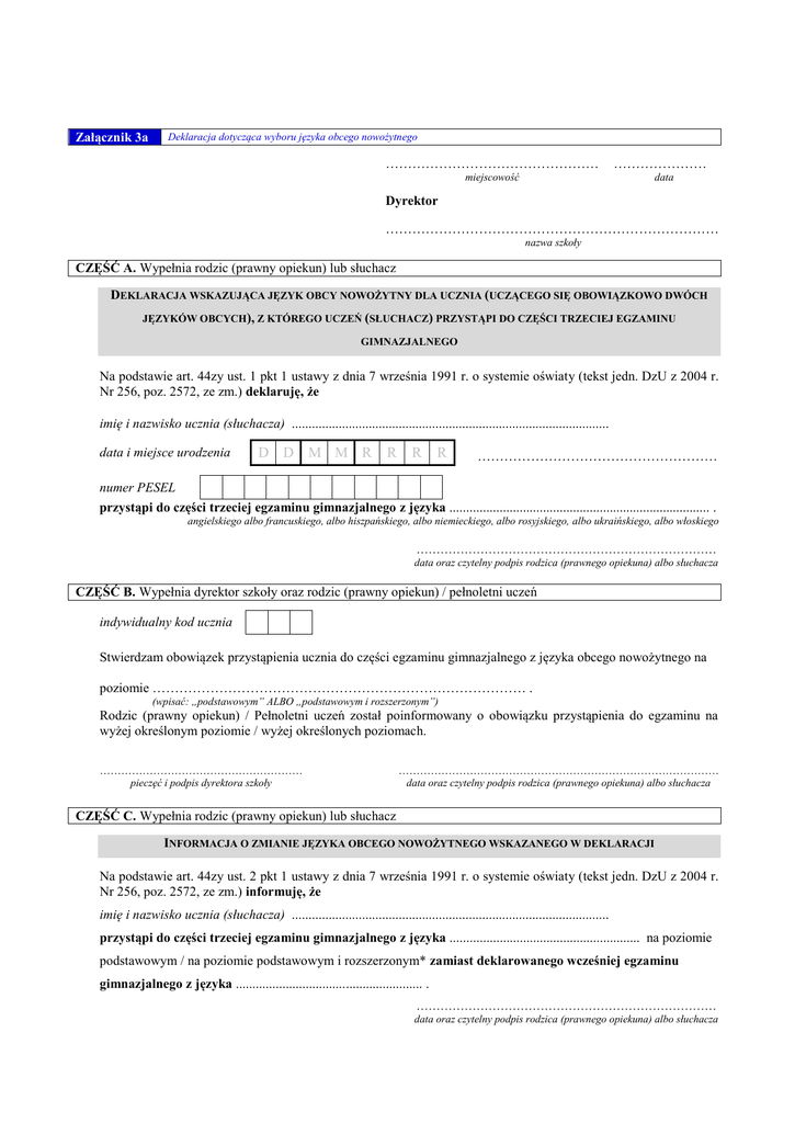 Załącznik 3a Deklaracja dotycząca wyboru języka obcego nowożytnego ………………………………………… ………………… miejscowość data Dyrektor ………………………………………………………………… nazwa szkoły CZĘŚĆ A. Wypełnia rodzic (prawny opiekun) lub słuchacz DEKLARACJA WSKAZUJĄCA JĘZYK OBCY NOWOŻYTNY DLA UCZNIA (UCZĄCEGO SIĘ OBOWIĄZKOWO DWÓCH JĘZYKÓW OBCYCH), Z KTÓREGO UCZEŃ (SŁUCHACZ) PRZYSTĄPI DO CZĘŚCI TRZECIEJ EGZAMINU GIMNAZJALNEGO Na podstawie art. 44zy ust. 1 pkt 1 ustawy z dnia 7 września 1991 r. o systemie oświaty (tekst jedn. DzU z 2004 r. Nr 256, poz. 2572, ze zm.) deklaruję, że imię i nazwisko ucznia (słuchacza) ............................................................................................... data i miejsce urodzenia D D M M R R R R ……………………………………………… numer PESEL przystąpi do części trzeciej egzaminu gimnazjalnego z języka .............................................................................. . angielskiego albo francuskiego, albo hiszpańskiego, albo niemieckiego, albo rosyjskiego, albo ukraińskiego, albo włoskiego ………………………………………………………………… data oraz czytelny podpis rodzica (prawnego opiekuna) albo słuchacza CZĘŚĆ B. Wypełnia dyrektor szkoły oraz rodzic (prawny opiekun) / pełnoletni uczeń indywidualny kod ucznia Stwierdzam obowiązek przystąpienia ucznia do części egzaminu gimnazjalnego z języka obcego nowożytnego na poziomie ………………………………………………………………………… . (wpisać: „podstawowym” ALBO „podstawowym i rozszerzonym”) Rodzic (prawny opiekun) / Pełnoletni uczeń został poinformowany o obowiązku przystąpienia do egzaminu na wyżej określonym poziomie / wyżej określonych poziomach. ………………………………………………… pieczęć i podpis dyrektora szkoły ……………………………………………………………………………… data oraz czytelny podpis rodzica (prawnego opiekuna) albo słuchacza CZĘŚĆ C. Wypełnia rodzic (prawny opiekun) lub słuchacz INFORMACJA O ZMIANIE JĘZYKA OBCEGO NOWOŻYTNEGO WSKAZANEGO W DEKLARACJI Na podstawie art. 44zy ust. 2 pkt 1 ustawy z dnia 7 września 1991 r. o systemie oświaty (tekst jedn. DzU z 2004 r. Nr 256, poz. 2572, ze zm.) informuję, że imię i nazwisko ucznia (słuchacza) ............................................................................................... przystąpi do części trzeciej egzaminu gimnazjalnego z języka ......................................................... na poziomie podstawowym / na poziomie podstawowym i rozszerzonym* zamiast deklarowanego wcześniej egzaminu gimnazjalnego z języka ........................................................ . ………………………………………………………………… data oraz czytelny podpis rodzica (prawnego opiekuna) albo słuchacza