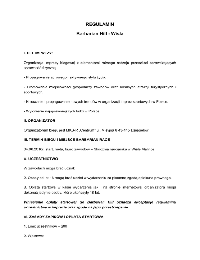REGULAMIN Barbarian Hill - Wisła I. CEL IMPREZY: Organizacja imprezy biegowej z elementami różnego rodzaju przeszkód sprawdzających sprawność fizyczną. - Propagowanie zdrowego i aktywnego stylu życia. - Promowanie miejscowości gospodarzy zawodów oraz lokalnych atrakcji turystycznych i sportowych. - Kreowanie i propagowanie nowych trendów w organizacji imprez sportowych w Polsce. - Wyłonienie najsprawniejszych ludzi w Polsce. II. ORGANIZATOR Organizatorem biegu jest MKS-R „Centrum” ul. Misyjna 8 43-445 Dzięgielów. III. TERMIN BIEGU I MIEJSCE BARBARIAN RACE 04.06.2016r. start, meta, biuro zawodów – Skocznia narciarska w Wiśle Malince V. UCZESTNICTWO W zawodach mogą brać udział: 2. Osoby od lat 16 mogą brać udział w wydarzeniu za pisemną zgodą opiekuna prawnego. 3. Opłata startowa w kasie wydarzenia jak i na stronie internetowej organizatora mogą dokonać jedynie osoby, które ukończyły 18 lat. Wniesienie opłaty startowej do Barbarian Hill oznacza akceptację regulaminu uczestnictwa w imprezie oraz zgodę na jego przestrzeganie. VI. ZASADY ZAPISÓW I OPŁATA STARTOWA 1. Limit uczestników – 200 2. Wpisowe: -Kwiecień/Maj 58 PLN -W dniu imprezy –88 PLN 2. Przyjmowanie zgłoszeń odbywa się za pośrednictwem formularza na stronie internetowej zawodów –www.barbarianrace.pl Dopuszczeni do startu zostaną zawodnicy, którzy wniosą stosowną opłatę startową. 6. Opłata startowa nie może być przeniesiona na innego zawodnika. 7. Raz wniesiona opłata startowa nie podlega zwrotowi. VII. PROGRAM. 10:00 – 14:30 wydawanie numerów startowych oraz przyjmowanie zapisów, 15:00 - start pierwszej fali, 18:00 – start fali finałowej, 18.30 – podsumowanie i wręczenie nagród VIII. ŚWIADCZENIA. W ramach opłaty startowej uczestnicy otrzymują: 1. Możliwość wzięcia udziału w biegu, Organizator zachowuje sobie prawo do zmiany godziny startu i przesunięcia uczestników pomiędzy seriami. 2. Pamiątkowy medal, bądź inny upominek poświadczający fakt ukończenia biegu (warunek dotarcie do mety) IX. KLASYFIKACJE I NAGRODY Wyróżnienia i nagrody rzeczowe będą przyznawane w następujących kategoriach: 1. Kobiety – miejsca I-III, 2. Mężczyźni – miejsca I-III, X. DANE OSOBOWE Wszyscy uczestnicy startując w zawodach wyrażają zgodę na przetwarzanie danych osobowych do celów związanych z realizacją zawodów. XI. OCHRONA WIZERUNKU Uczestnicy biegu Barbarian Hill wyrażają zgodę na publikację ich wizerunku w relacjach z imprezy zamieszczonych na stronie, w mediach (w tym społecznościowych) oraz materiałach promocyjnych biegu. XII. INNE 1. Wszystkich uczestników obowiązuje bezwzględne przestrzeganie przepisów porządkowych i bezpieczeństwa oraz doraźnych zarządzeń Organizatora imprezy lub służb ochrony. 2. Organizator nie ponosi odpowiedzialności za pozostawione lub zgubione przedmioty na terenie imprezy. 3. Na teren imprezy nie będą wpuszczane osoby: nietrzeźwe, będące pod wpływem środków odurzających, zachowujące się agresywnie 4. Osoby obecne na imprezie są zobowiązane zachowywać się w sposób nie zagrażający bezpieczeństwu, w szczególności życiu oraz zdrowiu innych osób obecnych na tej imprezie, a w szczególności przestrzegać niniejszego regulaminu. 5. Uczestnicy imprezy odpowiadają majątkowo za szkody wyrządzone organizatorowi albo innym uczestnikom podczas imprezy. 6. Organizator zastrzega sobie prawo do zmian w przebiegu imprezy z przyczyn nie dających się przewidzieć (np. nagłej zmiany pogody.) 7. Zakazane jest startowanie w butach z kolcami. 8. Fale będą 20-30 osobowe. Do finału kwalifikuje się: -2 osoby z fali ( 2 kobiety i 2 mężczyzn) -10 kobiet i 10 mężczyzn z najlepszymi czasami . 9. O przynależności do określonej fali decyduje szybkość wpłaty ( im szybciej tym wcześniejsza fala) oraz wybór fali w formularzu rejestracyjnym. XIII. POSTANOWIENIA KOŃCOWE 1. Ostateczna interpretacja niniejszego regulaminu należy wyłącznie do organizatora. 2. Pytania dotyczące regulaminu oraz samej Imprezy należy kierować e-mailowo na adres: [email protected] ewentualnie poprzez Fanpage na Facebook’u https://www.facebook.com/race.barbarian.