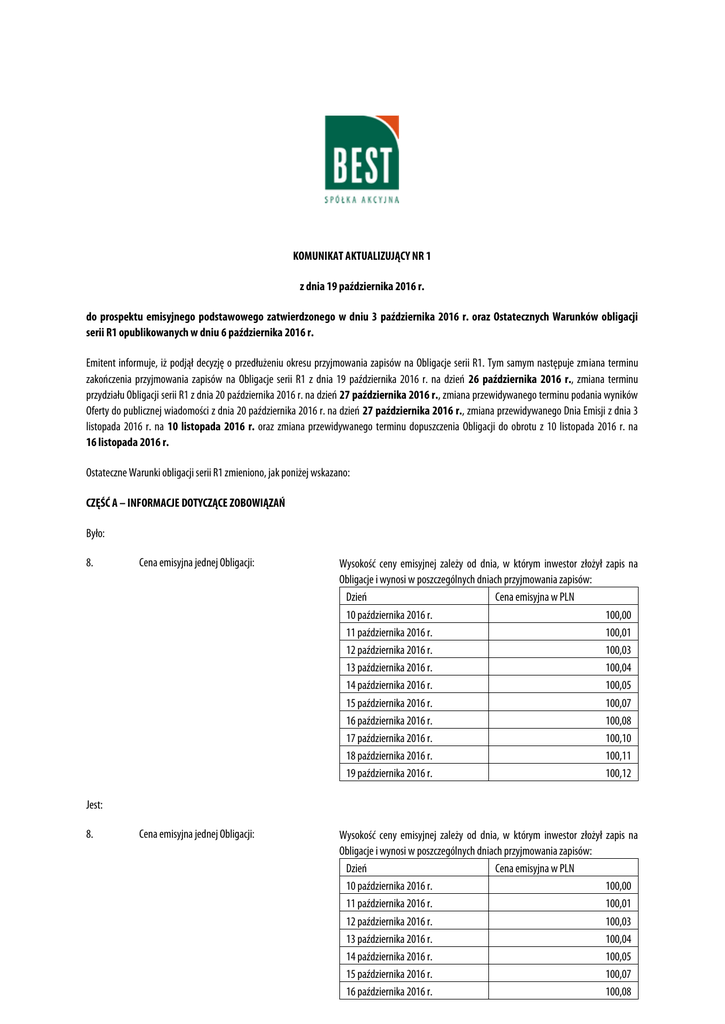 KOMUNIKAT AKTUALIZUJĄCY NR 1 z dnia 19 października 2016 r. do prospektu emisyjnego podstawowego zatwierdzonego w dniu 3 października 2016 r. oraz Ostatecznych Warunków obligacji serii R1 opublikowanych w dniu 6 października 2016 r. Emitent informuje, iż podjął decyzję o przedłużeniu okresu przyjmowania zapisów na Obligacje serii R1. Tym samym następuje zmiana terminu zakończenia przyjmowania zapisów na Obligacje serii R1 z dnia 19 października 2016 r. na dzień 26 października 2016 r., zmiana terminu przydziału Obligacji serii R1 z dnia 20 października 2016 r. na dzień 27 października 2016 r., zmiana przewidywanego terminu podania wyników Oferty do publicznej wiadomości z dnia 20 października 2016 r. na dzień 27 października 2016 r., zmiana przewidywanego Dnia Emisji z dnia 3 listopada 2016 r. na 10 listopada 2016 r. oraz zmiana przewidywanego terminu dopuszczenia Obligacji do obrotu z 10 listopada 2016 r. na 16 listopada 2016 r. Ostateczne Warunki obligacji serii R1 zmieniono, jak poniżej wskazano: CZĘŚĆ A – INFORMACJE DOTYCZĄCE ZOBOWIĄZAŃ Było: 8. Cena emisyjna jednej Obligacji: Wysokość ceny emisyjnej zależy od dnia, w którym inwestor złożył zapis na Obligacje i wynosi w poszczególnych dniach przyjmowania zapisów: Dzień Cena emisyjna w PLN 10 października 2016 r. 100,00 11 października 2016 r. 100,01 12 października 2016 r. 100,03 13 października 2016 r. 100,04 14 października 2016 r. 100,05 15 października 2016 r. 100,07 16 października 2016 r. 100,08 17 października 2016 r. 100,10 18 października 2016 r. 100,11 19 października 2016 r. 100,12 Cena emisyjna jednej Obligacji: Wysokość ceny emisyjnej zależy od dnia, w którym inwestor złożył zapis na Obligacje i wynosi w poszczególnych dniach przyjmowania zapisów: Dzień Cena emisyjna w PLN 10 października 2016 r. 100,00 11 października 2016 r. 100,01 12 października 2016 r. 100,03 13 października 2016 r. 100,04 14 października 2016 r. 100,05 15 października 2016 r. 100,07 16 października 2016 r. 100,08 Jest: 8. 17 października 2016 r. 18 października 2016 r. 19 października 2016 r. 20 października 2016 r. 21 października 2016 r. 22 października 2016 r. 23 października 2016 r. 24 października 2016 r. 25 października 2016 r. 26 października 2016 r. 100,10 100,11 100,12 100,14 100,15 100,16 100,18 100,19 100,21 100,22 *** CZĘŚĆ B – POZOSTAŁE INFORMACJE INFORMACJE DOTYCZĄCE OFERTY Było: 27. Okres oferty: 10 października 2016 r. – 19 października 2016 r. Jest: 27. Okres oferty: 10 października 2016 r. – 26 października 2016 r. *** Było: 28. Terminy związane z ofertą: Termin rozpoczęcia przyjmowania zapisów (Dzień Subskrypcji): 10 października 2016 r. Termin zakończenia przyjmowania zapisów: 19 października 2016 r. Termin przydziału: 20 października 2016 r. Przewidywany Dzień Emisji: 3 listopada 2016 r. Przewidywany termin podania wyników Oferty do publicznej wiadomości: 20 października 2016 r. Przewidywany termin dopuszczenia Obligacji do obrotu: 9 listopada 2016 r. Jest: 28. Terminy związane z ofertą: Termin rozpoczęcia przyjmowania zapisów (Dzień Subskrypcji): 10 października 2016 r. Termin zakończenia przyjmowania zapisów: 26 października 2016 r. Termin przydziału: 27 października 2016 r. Przewidywany Dzień Emisji: 10 listopada 2016 r. Przewidywany termin podania wyników Oferty do publicznej wiadomości: 27 października 2016 r. Przewidywany termin dopuszczenia Obligacji do obrotu: 16 listopada 2016 r. *** ZAŁĄCZNIK PODSUMOWANIE Dział E – Oferta Było: E.3 Opis warunków oferty. (…) Cena emisyjna jednej Obligacji wynosi: Wysokość ceny emisyjnej zależy od dnia, w którym inwestor złożył zapis na Obligacje i wynosi w poszczególnych dniach przyjmowania zapisów: Dzień Cena emisyjna w PLN 10 października 2016 r. 100,00 11 października 2016 r. 100,01 12 października 2016 r. 100,03 13 października 2016 r. 100,04 14 października 2016 r. 100,05 15 października 2016 r. 100,07 16 października 2016 r. 100,08 17 października 2016 r. 100,10 18 października 2016 r. 100,11 19 października 2016 r. 100,12 Okres oferty: 10 października 2016 r. – 19 października 2016 r. (…) Jest: E.3 Opis warunków oferty. (…) Cena emisyjna jednej Obligacji wynosi: Wysokość ceny emisyjnej zależy od dnia, w którym inwestor złożył zapis na Obligacje i wynosi w poszczególnych dniach przyjmowania zapisów: Dzień Cena emisyjna w PLN 10 października 2016 r. 100,00 11 października 2016 r. 100,01 12 października 2016 r. 100,03 13 października 2016 r. 100,04 14 października 2016 r. 100,05 15 października 2016 r. 100,07 16 października 2016 r. 100,08 17 października 2016 r. 100,10 18 października 2016 r. 100,11 19 października 2016 r. 100,12 20 października 2016 r. 100,14 21 października 2016 r. 100,15 22 października 2016 r. 100,16 23 października 2016 r. 100,18 24 października 2016 r. 100,19 25 października 2016 r. 100,21 26 października 2016 r. 100,22 Okres oferty: 10 października 2016 r. – 26 października 2016 r. (…)