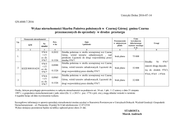 Ustrzyki Dolne 2016-07-14 GN.6840.7.2016 Wykaz nieruchomości Skarbu Państwa położonych w Czarnej Górnej gmina Czarna przeznaczonych do sprzedaży w drodze przetargu Opis i położenie Przeznaczenie w miejscowym planie Cena wywoławcza dzierżawnego czynszu rocznego w zł. Uwagi 4 5 6 7 8 0.2832 Działka położona w strefie zewnętrznej wsi Czarna Górna, wśród terenów zabudowanych , nad potokiem. Łączność do drogi wojewódzkiej przez działkę 974/7. Działka położona w strefie zewnętrznej wsi Czarna brak planu 75 000 Oznaczenie nieruchomości Lp. 1 1. 2 3 KW Nr działki 2 3 974/4 +1/5 cz. dz. 974/7 974/5 +1/5 KS2E/00018142/0 cz. dz. 974/7 974/6 +1/5 cz. dz. 974/7 Pow. w ha 0.1326 0.0988 0.1326 0.0965 0.1326 Górna, wśród terenów zabudowanych. Łączność do Działka brak planu 32 000 drogi wojewódzkiej przez działkę 974/7. 974/7 stanowi drogę dojazdową do działek 974/3, 974/4, 974/5 i 974/6 Działka położona w strefie zewnętrznej wsi Czarna Górna, wśród terenów zabudowanych. Łączność do Nr brak planu 32 000 drogi wojewódzkiej przez działkę 974/7. Osoby, którym przysługuje pierwszeństwo w nabyciu nieruchomości na podstawie art. 34 ust. 1 pkt. 1 i 2 ustawy z dnia 21 sierpnia 1997 r. o gospodarce nieruchomościami ( jedn. tekst (Dz. U. z 2015 r. poz. 1774 z póź. zm.), mogą składać wnioski w terminie 6 tygodni licząc od dnia wywieszenia wykazu. Szczegółowe informacje w sprawie sprzedaży nieruchomości można uzyskać w Starostwie Powiatowym w Ustrzykach Dolnych: Wydział Geodezji i Gospodarki Nieruchomościami – ul. Pionierska 10 pokój Nr 8 lub telefonicznie 13 4712534 Wykaz niniejszy pozostawać będzie na tablicy ogłoszeń przez okres 21 dni. STAROSTA Marek Andruch