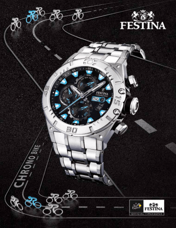 CHRONO BIKE 16527/3 1 099 zł collection 16526/3 999 zł 16525/1 1 099 zł 16525/4 1 099 zł 16526/6 999 zł Na okładce znajduje się model 16527/5, cena 1 099 zł. 16527/1 1 099 zł 16527/6 1 099 zł 16527/8 1 099 zł 16527/4 1 099 zł CHRONO BIKE Bezwzględne warunki, wytrzymałość, precyzja – tak można określić prestiżowy wyścig kolarski Tour de France. Festina jest Oficjalnym pomiarem czasu tego najbardziej znanego wyścigu. Teraz i Ty możesz poczuć ekstremalne emocje. Załóż jeden z wyjątkowych chronografów i stań na najwyższym podium. Wyróżnij się, wybierz nowy Festina CHRONO BIKE FullBlack – to wyjątkowy design, podekscytowanie i smak zwycięstwa. 16539/1 1 999 zł 16528/7 999 zł 16528/8 999 zł SPORT collection 16488/3 669 zł 16488/1 669 zł 16488/5 669 zł 16489/1 669 zł 16489/5 669 zł 16298/A 669 zł 16298/B 669 zł 16490/1 449 zł 16490/6 449 zł Szukasz zegarka, który będzie Ci towarzyszył na co dzień? Przygotuj się i stań na linię startu, odmierz najlepsze chwile chronografem lub podróżuj z zegarkiem z drugą strefą czasową. Antyalergiczne koperty i bransolety ze stali szlachetnej oraz precyzyjne kwarcowe mechanizmy dadzą Ci poczucie bezpieczeństwa. Koniec z nudnym stylem, pokaż swój charakter – zegarek dla prawdziwego mężczyzny. 16363/2 659 zł 16358/5 599 zł 16358/6 599 zł 16393/1 829 zł 16393/3 829 zł 16363/6 659 zł Fashion collection 16362/1 499 zł 16362/3 499 zł 16524/3 519 zł 16537/1 389 zł 16537/2 389 zł 16362/2 499 zł 16524/4 519 zł Na okładce znajduje się model: 16396/1, cena 779 zł, 16394/1, cena 659 zł. 16395/1 749 zł 16397/1 1 089 zł 16395/2 749 zł 16396/2 779 zł 16394/3 659 zł 16394/2 659 zł FASHION COLLECTION Podkreśl swój styl i pokaż światu, jaka jesteś wyjątkowa. Stylowa prostokątna koperta, wysadzana kamieniami i modne kolory uwiodą każdego. Koniec z małymi zegarkami z nieczytelnymi wskazówkami. Wybierz jeden z modeli z nowoczesnymi elementami ceramicznymi w wersji analogowej lub 16492/2 419 zł 16492/3 419 zł 16530/1 689 zł 16530/2 689 zł Sugerowane ceny detaliczne z VAT na dzień 14. 11. 2010. multifunkcyjnej, który pozwoli Ci kontrolować każdą chwilę. www.festina.pl Infolinia 0801 011 423* * ERA, PLUS GSM 0717845652