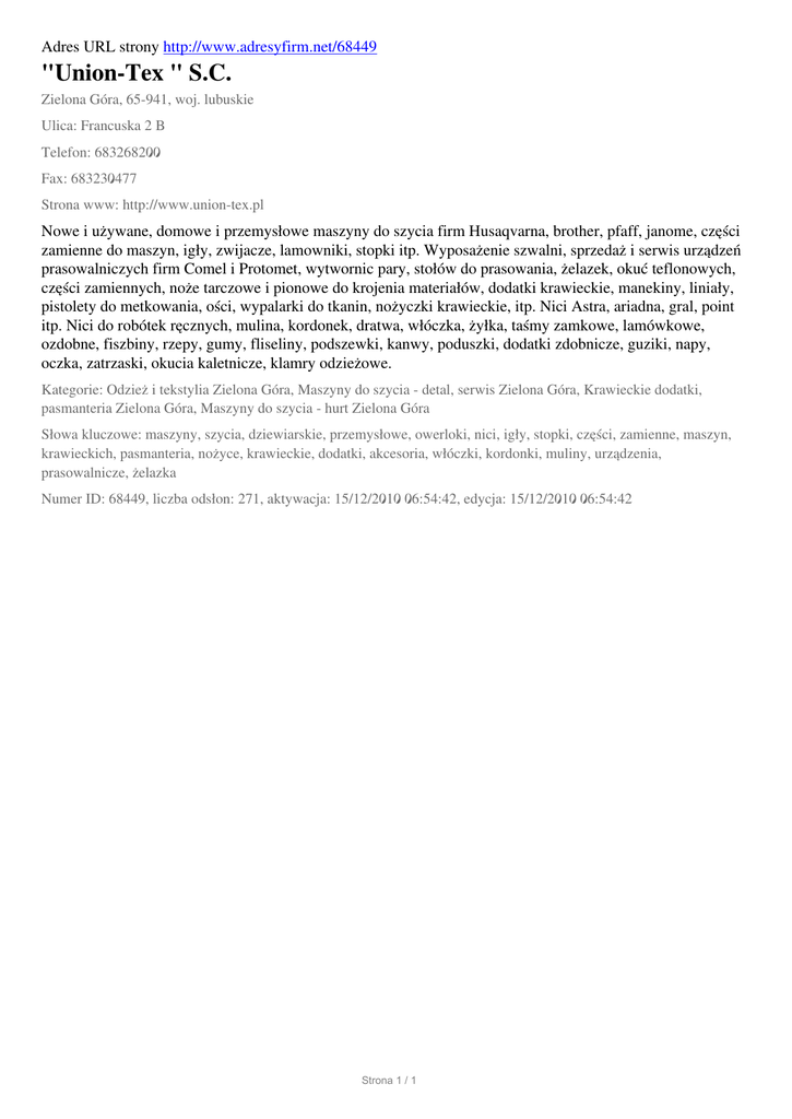 "Union-Tex " SC, Zielona Gora, Francuska 2 B