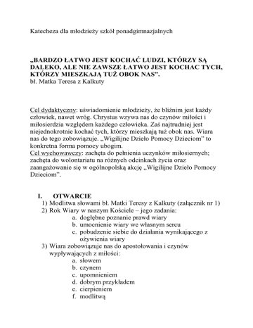 Katecheza dla młodzieży szkół ponadgimnazjalnych „BARDZO ŁATWO JEST KOCHAĆ LUDZI, KTÓRZY SĄ DALEKO, ALE NIE ZAWSZE ŁATWO JEST KOCHAC TYCH, KTÓRZY MIESZKAJĄ TUŻ OBOK NAS”. bł. Matka Teresa z Kalkuty Cel dydaktyczny: uświadomienie młodzieży, że bliźnim jest każdy człowiek, nawet wróg. Chrystus wzywa nas do czynów miłości i miłosierdzia względem każdego człowieka. Zaś najtrudniej jest niejednokrotnie kochać tych, którzy mieszkają tuż obok nas. Wiara nas do tego zobowiązuje. „Wigilijne Dzieło Pomocy Dzieciom” to konkretna forma pomocy ubogim. Cel wychowawczy: zachęta do pełnienia uczynków miłosiernych; zachęta do wolontariatu na różnych odcinkach życia oraz zaangażowanie się w ogólnopolską akcję „Wigilijne Dzieło Pomocy Dzieciom”. I. OTWARCIE 1) Modlitwa słowami bł. Matki Teresy z Kalkuty (załącznik nr 1) 2) Rok Wiary w naszym Kościele – jego zadania: a. dogłębne poznanie prawd wiary b. umocnienie wiary we własnym sercu c. pobudzenie siebie do działania wynikającego z ożywienia wiary 3) Wiara zobowiązuje nas do apostołowania i czynów wypływających z miłości: a. słowem b. czynem c. upomnieniem d. dobrym przykładem e. cierpieniem f. modlitwą 4) Pouczenie z listu św. Jakuba: „wiara, jeśli nie byłaby połączona z uczynkami, martwa jest sama w sobie” (Jk 2,17). II. ORĘDZIE 1) "Bardzo łatwo jest kochać ludzi, którzy są daleko, ale nie zawsze łatwo jest kochać tych, którzy mieszkają tuż obok nas” (bł. Matka Teresa z Kalkuty) 2) Trudne wezwania Jezusa: a. „Zbliżył się także jeden z uczonych w Piśmie, który im się przysłuchiwał, gdy rozprawiali ze sobą. Widząc, że Jezus dobrze im odpowiedział, zapytał Go: «Które jest pierwsze ze wszystkich przykazań?» Jezus odpowiedział: «Pierwsze jest: Słuchaj, Izraelu, Pan Bóg nasz, Pan jest jeden. Będziesz miłował Pana, Boga swego, całym swoim sercem, całą swoją duszą, całym swoim umysłem i całą swoją mocą. Drugie jest to: Będziesz miłował swego bliźniego jak siebie samego. Nie ma innego przykazania większego od tych». (Mk 12, 28-31) b. „Miłujcie waszych nieprzyjaciół; dobrze czyńcie tym, którzy was nienawidzą; błogosławcie tym, którzy was przeklinają, i módlcie się za tych, którzy was oczerniają.” Łk 6,27-38 (załącznik nr 2) 3) „Nie można miłować Boga, jeśli nie miłuje się braci i nie tworzy z nimi głębokiej i trwałej komunii miłości” - Jan Paweł II, miłość bliźniego, audiencja generalna 20.10.1999 (załącznik nr 3) 4) Jezus powiedział do Siostry Faustyny: „Żądam od ciebie uczynków miłosierdzia, które mają wypływać z miłości ku Mnie. Miłosierdzie masz okazywać zawsze i wszędzie bliźnim, nie możesz się od tego usunąć ani wymówić, ani uniewinnić. Podaję ci trzy sposoby czynienia miłosierdzia bliźnim: pierwszy – czyn, drugi – słowo, trzeci – modlitwa; w tych trzech stopniach zawiera się pełnia miłosierdzia i jest niezbitym dowodem miłości ku Mnie. W ten sposób dusza wysławia i oddaje cześć miłosierdziu Mojemu”. (Dzienniczek 742). 5) Przykłady osób, które umiały kochać i uczą nas trudnej sztuki miłości bliźniego: a. bł. Jan Paweł II (przebaczył zamachowcy) b. bł. Matka Teresa z Kalkuty (opiekowała się najuboższymi) c. św. Gwalbert (przebaczył zabójcy brata - załącznik nr 4) d. św. Rita (uczy zawrzenia Bogu i trudnej sztuki przebaczenia - załącznik nr 5) III. ODPOWIEDŹ 1) Ja i „ci, którzy mieszkają obok mnie” (relacje, konflikty, plusy i minusy): a. moja rodzina (rodzice i rodzeństwo) b. moja szkoła (nauczyciele, wychowawcy, koledzy i koleżanki) c. moi sąsiedzi d. ludzie, których spotykam codziennie 2) Adwent to szczególny czas otwarcia się na Boga i bliźnich poprzez: a. modlitwę (codzienna modlitwa, udział w roratach, śpiew godzinek o Niepokalanym Poczęciu NMP; spowiedź adwentowa i świąteczna); b. słowo (pozdrowienia chrześcijańskie; rozmowy z bliźnimi; zażegnanie konfliktów; umiem przeprosić, podziękować itp.); c. czyn (pomoc w domu; pomoc w sąsiedztwie; odwiedzanie samotnych, chorych, pomoc niepełnosprawnym w dotarciu do kościoła; zgłoszenie chorych w kancelarii parafialnej do domowej wizyty kapłana z posługą sakramentalną, itp.); 3) Świeca wigilijna „Caritas” – „Wigilijne Dzieło Pomocy Dzieciom” – akcja ogólnopolska: a. cel akcji: pomoc ubogim dzieciom, dofinansowania wyjazdów feryjnych i wakacyjnych, oaz (zachęta do skorzystania ze stron internetowych Caritas Polska i oddziałów diecezjalnych: www.caritas.pl); b. parafialny oddział „Caritas” (cele i sposoby działania); c. moje zaangażowanie w „Caritas” (np. pomoc w rozprowadzaniu świec przy parafii; współorganizowanie z oddziałem „Caritas” pomocy najuboższym, itp). 4) Zapis do zeszytu: Przeżywany w Kościele Rok Wiary, jak również Adwent przypominają nam o potrzebie realizacji Jezusowego przykazania miłości. „Będziesz miłował Pana, Boga swego, całym swoim sercem, całą swoją duszą, całym swoim umysłem i całą swoją mocą. (…) Będziesz miłował swego bliźniego jak siebie samego”. Mk 12, 29-31. Przykazanie miłości obejmuje wszystkich ludzi, nawet naszych nieprzyjaciół: „Miłujcie waszych nieprzyjaciół; dobrze czyńcie tym, którzy was nienawidzą; błogosławcie tym, którzy was przeklinają, i módlcie się za tych, którzy was oczerniają.” Łk 6,27-38. „Nie można miłować Boga, jeśli nie miłuje się braci i nie tworzy z nimi głębokiej i trwałej komunii miłości" – bł. Jan Paweł II. „Podaję ci trzy sposoby czynienia miłosierdzia bliźnim: pierwszy – czyn, drugi – słowo, trzeci – modlitwa; w tych trzech stopniach zawiera się pełnia miłosierdzia i jest niezbitym dowodem miłości ku Mnie.” (Dzienniczek s. Faustyny 742). „Wigilijne Dzieło Pomocy Dzieciom” to konkretna forma i sposób pomocy ubogim. 5) Zadanie: Nap