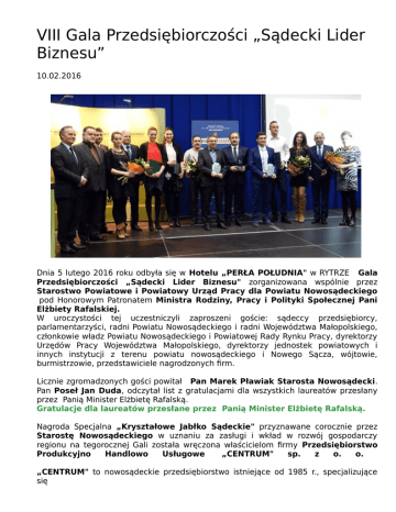 VIII Gala Przedsiębiorczości „Sądecki Lider Biznesu” 10.02.2016 Dnia 5 lutego 2016 roku odbyła się w Hotelu „PERŁA POŁUDNIA" w RYTRZE Gala Przedsiębiorczości „Sądecki Lider Biznesu" zorganizowana wspólnie przez Starostwo Powiatowe i Powiatowy Urząd Pracy dla Powiatu Nowosądeckiego pod Honorowym Patronatem Ministra Rodziny, Pracy i Polityki Społecznej Pani Elżbiety Rafalskiej. W uroczystości tej uczestniczyli zaproszeni goście: sądeccy przedsiębiorcy, parlamentarzyści, radni Powiatu Nowosądeckiego i radni Województwa Małopolskiego, członkowie władz Powiatu Nowosądeckiego i Powiatowej Rady Rynku Pracy, dyrektorzy Urzędów Pracy Województwa Małopolskiego, dyrektorzy jednostek powiatowych i innych instytucji z terenu powiatu nowosądeckiego i Nowego Sącza, wójtowie, burmistrzowie, przedstawiciele nagrodzonych firm. Licznie zgromadzonych gości powitał Pan Marek Pławiak Starosta Nowosądecki. Pan Poseł Jan Duda, odczytał list z gratulacjami dla wszystkich laureatów przesłany przez Panią Minister Elżbietę Rafalską. Gratulacje dla laureatów przesłane przez Panią Minister Elżbietę Rafalską. Nagroda Specjalna „Kryształowe Jabłko Sądeckie" przyznawane corocznie przez Starostę Nowosądeckiego w uznaniu za zasługi i wkład w rozwój gospodarczy regionu na tegorocznej Gali została wręczona właścicielom firmy Przedsiębiorstwo Produkcyjno Handlowo Usługowe „CENTRUM" sp. z o. o. „CENTRUM" to nowosądeckie przedsiębiorstwo istniejące od 1985 r., specjalizujące się w przetwórstwie tworzy w sztucznych. Podstawową działalnością jest produkcja wyrobów z tworzyw sztucznych dla budownictwa. Ponadto firma prowadzi działalność usługową w branży hotelarskiej i turystycznej oraz działalność handlową w branży spożywczej. Podstawowy asortyment produkowanych przez P.P.H.U. „CENTRUM" wyrobów stanowią wanny i brodziki różnych rozmiarów i kształtów - wykonane ze wzmacnianych kompozytem płyt akrylowych lub wylewane z polimerobetonu. Spływ Łodziami Doliną Popradu, który od roku 2000 organizuje firma CENTRUM, jest jedną z największych atrakcji regionu. Firma prowadzi także na terenie Nowego Sącza i okolic 6 sklepów spożywczo-przemysłowych w ramach sieci franczyzowej DELIKATESY CENTRUM i Hotel Beskid****. Na Gali przyznane zostały również nagrody Starosty Nowosądeckiego Pracodawca Roku 2015r. w kategoriach małych, średnich i dużych przedsiębiorstw przypadły w udziale firmom: - w kategorii małych przedsiębiorstw: Aquaforest Sp. Z O.O., ul. Magazynowa , 33-300 Nowy Sącz Firma powstała w 1995 roku w Wielkiej Brytanii. Początkowo zajmowała się produkcją podłoży oraz nawozów dla roślin wodnych. Produkty były stosowane w ogrodach zoologicznych, oceanariach i profesjonalnych hodowlach roślin. W 2006 roku rozpoczęto własną hodowlę roślin akwariowych oraz ryb i koralowców, głównie SPS. Wraz z jej rozwojem zwiększyło się zapotrzebowanie na profesjonalne produkty do akwarystyki morskiej. - w kategorii średnich przedsiębiorstw : MOTO SOWA Wojciech Sowa Wielopole 140, 33-311 Wielogłowy Firma została założona przez Wojciecha Sowę z lokalizacją w Dąbrowej i pierwotnie specjalizowała się w usługach lakierowania pojazdów, by później pod nową nazwą Expres Auto Serwis poszerzyć swoją działalność o naprawy blacharskie i mechaniczne wszystkich marek pojazdów. Aktualny zakres działalności Firmy obejmuje: sprzedaż samochodów osobowych i ciężarowych marki FIAT, serwis gwarancyjny i pogwarancyjny pomoc i doradztwo przy likwidacji szkody komunikacyjnej oraz kompleksowe naprawy blacharsko - lakiernicze samochodów. - w kategorii dużych przedsiębiorstw: P.P.H.U. „CENTRUM" ul. Batorego 81, 33-300 Nowy Sącz - Laureat Nagrody Specjalnej „Kryształowe Jabłko Sądeckie". Podczas tegorocznej Gali wyłoniono laureatów VIII edycji konkursu „Start w Biznes z Urzędem Pracy". Powiatowy Urząd Pracy dla Powiatu Nowosądeckiego wyróżnił i nagrodził najlepiej i najprężniej rozwijające się firmy, które założyli bezrobotni mieszkańcy powiatu nowosądeckiego przy udziale dotacji z Urzędu Pracy. Swoją działalnością promują oni dobre praktyki w zakresie przedsiębiorczości i udowadniają, że „chcieć to móc". Kapituła konkursu, na podstawie opracowanego regulaminu, spośród wszystkich zgłoszonych, wybrała 9 firm, które w 2014 r. otrzymały dotację na podjęcie działalności gospodarczej. Spośród 9 finalistów – kapituła konkursu „Start w biznes z Urzędem Pracy" przyznała 3 nagrody oraz 6 wyróżnień. NAGRODY OTRZYMALI: Miejsce I Aleksandra Słaby Ośrodek Jazdy Konnej „MAGÓRY" ul. Magóry 11, 33-350 Piwniczna-Zdrój „Ośrodek Jazdy Konnej MAGÓRY" Pani Aleksandra prowadzi górski obóz jeździecki gdzie uczy nauki jazdy konnej dla początkujących i oprowadzania koni dla najmłodszych. Od lata 2015 roku do oferty ośrodka wprowadzono także krótkie 1-2 dniowe konne rajdy terenowe, oraz letnie obozy dla dzieci i młodzieży od 10 roku życia. Miejsce II Małgorzata Magiera Restauracja Marysieńka Rynek 12, 33-349 Stary Sącz Restauracja „Marysieńka" Pani Małgorzaty Magiery. W ramach prowadzonej działalności pani Małgorzata serwuje swoim klientom potrawy regionalne oraz tradycyjne potrawy kuchni polskiej. Miejsce III Mira Cięciwa „MIRACLE" ul. Nadbrzeżna 49, 33-300 Nowy Sącz Salon fryzjerski „MIRACLE". Jest to niepowtarzalne miejsce, w którym każdy klient będzie obsługiwany w sposób indywidualny i wyjątkowy. WYRÓŻNIENIA: Paweł Zwoliński Akademia bramkarska ul. Bandurskiego 14a, 33-340 Stary Sącz Pan Paweł prowadzi pierwszą profesjonalną prywatną Akademię szkolącą bramkarzy na terenie Powiatu Nowosądeckiego. Wioletta Rosińska Gabinet Kosmetyczny BELLISSIMA ul. Kościuszki 14, 33-330 Grybów W Gabinecie Kosmetycznym BELLISSIMA", każdy może poczuć się zadbanym, młodym i odprężonym. Karolina Magiera flow