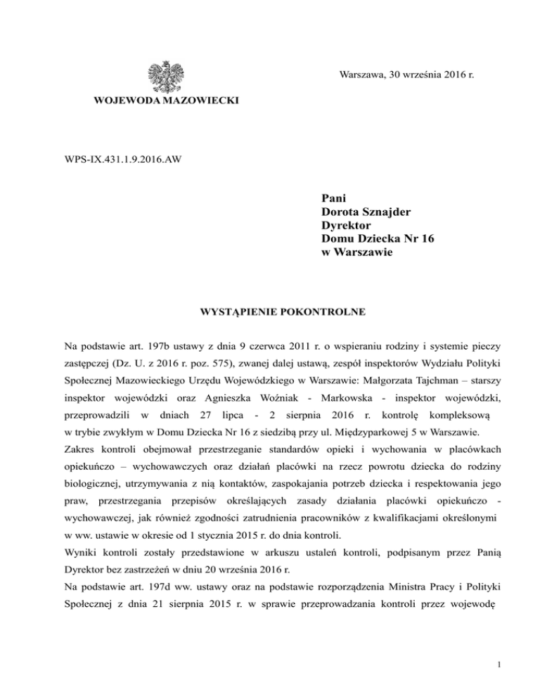 Warszawa, 30 września 2016 r. WOJEWODA MAZOWIECKI WPS-IX.431.1.9.2016.AW Pani Dorota Sznajder Dyrektor Domu Dziecka Nr 16 w Warszawie WYSTĄPIENIE POKONTROLNE Na podstawie art. 197b ustawy z dnia 9 czerwca 2011 r. o wspieraniu rodziny i systemie pieczy zastępczej (Dz. U. z 2016 r. poz. 575), zwanej dalej ustawą, zespół inspektorów Wydziału Polityki Społecznej Mazowieckiego Urzędu Wojewódzkiego w Warszawie: Małgorzata Tajchman – starszy inspektor wojewódzki oraz Agnieszka Woźniak - Markowska - inspektor wojewódzki, przeprowadzili w dniach 27 lipca - 2 sierpnia 2016 r. kontrolę kompleksową w trybie zwykłym w Domu Dziecka Nr 16 z siedzibą przy ul. Międzyparkowej 5 w Warszawie. Zakres kontroli obejmował przestrzeganie standardów opieki i wychowania w placówkach opiekuńczo – wychowawczych oraz działań placówki na rzecz powrotu dziecka do rodziny biologicznej, utrzymywania z nią kontaktów, zaspokajania potrzeb dziecka i respektowania jego praw, przestrzegania przepisów określających zasady działania placówki opiekuńczo wychowawczej, jak również zgodności zatrudnienia pracowników z kwalifikacjami określonymi w ww. ustawie w okresie od 1 stycznia 2015 r. do dnia kontroli. Wyniki kontroli zostały przedstawione w arkuszu ustaleń kontroli, podpisanym przez Panią Dyrektor bez zastrzeżeń w dniu 20 września 2016 r. Na podstawie art. 197d ww. ustawy oraz na podstawie rozporządzenia Ministra Pracy i Polityki Społecznej z dnia 21 sierpnia 2015 r. w sprawie przeprowadzania kontroli przez wojewodę 1 oraz wzoru legitymacji uprawniającej do przeprowadzania kontroli (Dz. U. z 2015 r. poz. 1477) przekazuję niniejsze wystąpienie pokontrolne. Dom Dziecka Nr 16 jest placówką opiekuńczo – wychowawczą typu socjalizacyjnego. Placówka działa na podstawie Decyzji Wojewody Mazowieckiego Nr 9/2011 z dnia 17.01.2011 r. zmienionej Decyzją Wojewody Mazowieckiego Nr 1330/2013 z dnia 4.07.2013 r. Placówka jest wpisana do Rejestru placówek opiekuńczo – wychowawczych, regionalnych palcówek opiekuńczo – terapeutycznych oraz interwencyjnych ośrodków preadopcyjnych województwa mazowieckiego pod pozycją 171. Podmiotem prowadzącym placówkę jest m.st. Warszawa. Dyrektorem placówki w kontrolowanym okresie była Pani Dorota Sznajder. Limit miejsc w placówce wynosi 30. W okresie objętym kontrolą w placówce przebywało 90 wychowanków, natomiast w dniu kontroli na listę wychowanków placówki wpisanych było 42 dzieci w wieku od 5 miesięcy do 6 roku życia. Na dzień kontroli wszyscy wychowankowie z uregulowaną sytuacją prawną byli zgłoszeni do ośrodka adopcyjnego. Placówka działa na podstawie: Statutu Domu Dziecka Nr 16 przyjętego Uchwałą Nr XLIX/1387/2013 Rady Miasta Stołecznego Warszawy z dnia 17 stycznia 2013 r. oraz Regulaminu Organizacyjnego Domu Dziecka Nr 16 wprowadzonego Zarządzeniem Nr 1/2015 Dyrektora Domu Dziecka Nr 16 z dnia 04.02.2015 r. Dokumenty regulujące pracę placówki zostały opracowane na podstawie aktualnie obowiązujących przepisów prawnych. W kontrolowanym okresie w placówce odbyła się kontrola Powiatowej Stacji Sanitarno Epidemiologicznej w m.st. Warszawie. Po kontroli nie wydano zaleceń. W wyniku kontroli ustalono, że zrealizowano 3 z 5 zaleceń pokontrolnych wydanych po kontroli problemowej przeprowadzonej w dniach 18 - 19 września 2012 r. przez pracowników Wydziału Polityki Społecznej Mazowieckiego Urzędu Wojewódzkiego. Zalecenie dotyczące skracania czasu pobytu wychowanków w placówce interwencyjnej zgodnie z art. 103 ust. 6 ww. ustawy jest nieaktualne z uwagi na zmianę struktury placówki od lipca 2013 r. Nie zostało zrealizowane zalecenie dotyczące dostosowania liczby dzieci w placówce do limitu określonego w art. 230 ww. ustawy. Standard świadczonych usług. Sprawdzono na podstawie oględzin placówki, rozmowy z dyrektorem, pedagogiem i opiekunką dziecięcą oraz na podstawie analizy dokumentacji. W dniu kontroli na listę wychowanków placówki wpisanych było 42 dzieci, co jest niezgodne z art. 230 ust. 1 ww. ustawy, zgodnie z którym liczba dzieci umieszczonych w placówkach 2 opiekuńczo – wychowawczych, o których mowa w art. 229 ust. 1-3, po upływie okresu, o którym mowa w art. 229 ust. 8, nie dłużej jednak niż do dnia 1 stycznia 2021 r., nie może być wyższa niż 30. Przepisy art. 103 ust. 3 stosuje się odpowiednio. W okresie objętym kontrolą placówka dwukrotnie wystąpiła do Wojewody z wnioskiem o przyjęcie dzieci ponad limit, w obu przypadkach wydano decyzje odmowne z uwagi na brak zasadności zastosowania art. 230 ust. 2 a ww. ustawy. Na dzień kontroli w placówce umieszczone były dzieci w wieku od 5 miesiąca do 6 roku życia. Sytuacja taka jest niezgodna z uregulowaniami art. 95 ust. 1 oraz art. 231 ww. ustawy. Stosownie do treści art. 95 ust. 1 ustawy w placówce opiekuńczo – wychowawczej typu socjalizacyjnego, interwencyjnego lub specjalistyczno – terapeutycznego są umieszczane dzieci powyżej 10. roku życia, wymagające szczególnej opieki lub mające trudności w przystosowaniu się do życia w rodzinie. Natomiast zgodnie z art. 231 ww. ustawy w placówkach opiekuńczo – wychowawczych, o których mowa w art. 229 ust. 1-3, w okresie 4 lat od dnia wejścia w życie niniejszej ustawy (tj. do 31 grudnia 2015 r.) mogą być umieszczane dzieci powyżej 7. roku życia. W kontrolowanej placówce funkcjonują 3 grupy wychowawcze, każda po 10 miejsc, wyodrębnione ze względu na wiek wychowanków. Dla każdej grupy przeznaczony jest jeden pokój dzienny oraz jedna sypialnia, z których korzystają wszystkie dzieci w danej grupie. W dniu kontroli w sypialniach zamieszkiwało 16, 13 i 13 dzieci odpowiednio w każdej grupie. Jest to niezgodne z § 18 ust. 3 pkt 1) rozporządzenia Ministra Pracy i Polityki Społecznej z dnia 22 grudnia 2011 r. w sprawie instytucjonalnej pieczy zastępczej (Dz. U. Nr 292, poz. 1720). Zgodnie z tym przepisem placówka zape