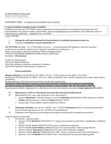 dr hab. Robert Grzeszczak Katedra Prawa Europejskiego Wydział Prawa i Administracji UW KONSPEKT ZAJĘĆ – przepływ pracowników (trzy części): I część swobody przepływu pracowników: Podstawy prawne (art. 45 TFUE), osoby uprawnione do korzystania ze swobody przemieszczania się; obywatelstwo UE, pojęcie unijne „pracownik”, prawa przysługujące pracownikom i ich rodzinom, praca w administracji publicznej – wyjątek od art. 45 TFUE Część I: WSTĘP I. II. Kategorie osób uprawnionych do korzystania ze swobody przemieszczania się Podstawy traktatowe i prawo pochodne UE: Art. 45 TFUE, ale także - art. 3 TUE (cele) a tu m.in. (…) wysoki poziom zatrudnienia i ochrony socjalnej, podnoszenie standardu i jakości życia i spójność gospodarczą i społeczna (…). Stąd w pozostałych częściach (tytułach) TFUE uszczegółowienie: TYTUŁ IV SWOBODNY PRZEPŁYW OSÓB, USŁUG I KAPITAŁU Rozdział 1: Pracownicy TYTUŁ IX: Zatrudnienie Tytuł X: Polityka społeczna; Tytuł XII: edukacja, szkolenia zawodowe i młodzież Tytuł XVIII: Spójność ekonomiczna i społeczna Prawo pochodne: Rozporządzenie 1612/68 (OJ Sp. Ed. 1968, L 257/2, s. 475), prawa pracowników i ich rodzin Dyrektywa 68/360 (OJ Sp. Ed. 1968, L 257/13, s. 485), formalności dot. wjazdu i pobytu pracownika i jego rodziny (uchylona) Rozporządzenie 1251/70, prawo pozostania po okresie zatrudnienia Dyrektywa 2004/38/WE w sprawie prawa obywateli UE i członków ich rodzin do swobodnego przemieszczania się i pobytu na terytorium państw członkowskich (Dz. Urz. UE 2004 L 158/77) Sytuację pracowników migrujących w odniesieniu do sfery zatrudnienia precyzuje rozporządzenie 492/2011 III. IV. Rynki pracy w EOG i w Szwajcarii oraz kwestia okresów przejściowych Obywatelstwo UE – por. odp. konspekt z sem. zimowego!!!! Sprawa Micheletti C-369/90; Sprawa C-413/99 Baumbast [2002] ECR I-7091; Sprawa C-138/02 Collins [2003]; Sprawa C-456/02 Trojani [2004], 7.09.04 Sprawa Zhu i Chen (2002) i sprawa Zambrano (2011) V. Elementy swobody z art. 45 ust. 3 TFUE – spr. C-292/89 Antonissen [1991]: wyliczenie uprawnień pracowników migrujących w art. 45 TFUE jest przykładowe Podmioty zobowiązane do przestrzegania przepisów dotyczących swobody pracowniczej VI. Część II: pojęcie pracownika I. Pracownik – pojęcie unijne: Sprawa 75/63 Hoekstra [1964] ECR 177: pojęcie pracownika ma charakter wspólnotowy, definiuje je ETS Sprawa 53/81 Levin [1982] ECR 1035: praca w niepełnym wymiarze Sprawa 66/85 Lawrie-Blum [1986] ECR 2121:staż nauczycielski, niskie wynagrodzenie Sprawa 196/87 Steymann [1988] ECR 6159: praca dla wspólnoty religijnej Sprawa 344/87 Bettray [1989] ECR 1621: NIE - praca w ramach terapii anty-narkotykowej Sprawa C-357/89 Raulin [1992] ECR I-1027: niewielka ilość przepracowanych godzin II. Sprawa C-188/00 Kurz [2002] ECR I-10691: rodzaj i wysokość wynagrodzenia Sprawa C-138/02 Collins [2003]; status osób poszukujących pracy Swoboda i wyjątek – praca w administracji publicznej Zatrudnienie w administracji publicznej musi być oparte na stosunku lojalności wobec państwa oraz więzi narodowej (spr. 149-79 Komisja/Belgia; C-290/94 Komisja/Grecja). ETS sprecyzował 2 przesłanki: (1) bezpośredni lub pośredni udział w sprawowaniu władzy; oraz (2) ochrona ogólnych interesów państwa lub władz publicznych. Spr. 152/73 Giovanni Maria Sotgiu p. Poczta Niemiecka Spr. C-15/96 – Schöning-Kougebetopoulou Spr. C-473/93 – Komisja/Luksemburg III. Zakaz dyskryminacji migrującego pracownika, Dyskryminacja pracownika – przykład z orzecznictwa „ polskiego” TSUE: Orzeczenie TSUE w spr. połączonych C-611/10; Hudziński i C-612/10; Wawrzyniak z 29.11.2011r. Zob także spr. C-281/98 Roman Angonese p. Cassa di Risparmio di Bolzano Problem – tzw. dyskryminacji odwrotna Prawo do korzyści socjalnych - korzyści socjalne – sprawa 207/78 Even Sprawa Trojani (C-456/02) Odmowa wypłaty zasiłku i spr. Wenda Geven p. Land Nordrhein-Westfalen, C-213/05 Przyznawanie dodatków rodzicielskich: spr. C-137/04 Rockler 2006 r. Nabywana nieruchomości spr. 305/87, Komisja przeciwko Grecji Dumping socjalny spr. z 4 kwietnia 1975r. spr.167/73, Komisja przeciwko Francji oraz spr. z 17 marca 1993 r. w spr. Sloman Neptun Ochrona osób dotkniętych kalectwem przed wypowiedzeniem pracy, zob. wyrok z 13 grudnia 1972 w spr. 44/72, Marsman Pozamałżeńskie wspólnoty życiowe: spr. z 17 kwietnia 1986 r. 59/85, Reed Służba wojskowa: spr. z 15 października 1969 r. 15/69 Ugliola I inne (por. Orzeczenie ETS w spr. połączonych C-611/10; Hudziński i C-612/10; Wawrzyniak z 29.11.2011r.) II część swobody przepływu pracowników: praca nad tekstem dyrektywy 2004/38 z 29 kwietnia 2004 r. o prawie obywateli Unii oraz członków ich rodzin do swobodnego przemieszczania się i pobytu na terytorium państw czł. UWAGA: Proszę mieć tekst dyrektywy I. Charakterystyka dyrektywy 2004/38 sprawy C-482/01 i C-493/01 Orfanopoulos and Oliveri (pkt 97-98) oraz C-127/08 Metock Wyjątki dyrektywy – zawężająco: sprawy 139/85 Kempf (pkt 13) i C-33/07 Jipa (pkt 23). II. Uprawnieni z dyrektywy spr. C-370/90 Singh spr. C-291/05 Eind spr. C-60/00 Carpenter spr. C-112/91, Werner Pochodne prawo UE – sytuacja studentów III. Sytuacja obywateli Unii Europejskiej w świetle dyrektywy 2004/38 zakres podmiotowy: obywatele UE oraz członkowie ich rodzin niezależnie od przynależności państwowej, prawo opuszczenia kraju ojczystego i wjazdu na terytorium innego państwa członkowskiego, prawo pobytu w dowolnym państwie członkowskim na okres do 3 miesięcy – bez żadnych formalności, jedynie za okazaniem dowodu tożsamości, prawo pobytu na okres powyżej 3 miesięcy: przysługuje pracownikom, osobom prowadzącym działalność gospodarczą, innym osobom posiadającym wystarczające środki finansowe, członkom rodzin obywateli UE, prawo stałego pobytu: przysługuje wszystkim obywatelom UE, którzy w państwie przyjmującym prz