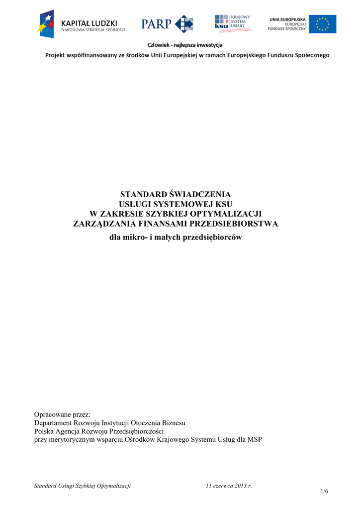 STANDARD ŚWIADCZENIA USŁUGI SYSTEMOWEJ KSU W ZAKRESIE SZYBKIEJ OPTYMALIZACJI ZARZĄDZANIA FINANSAMI PRZEDSIEBIORSTWA dla mikro- i małych przedsiębiorców Opracowane przez: Departament Rozwoju Instytucji Otoczenia Biznesu Polska Agencja Rozwoju Przedsiębiorczości przy merytorycznym wsparciu Ośrodków Krajowego Systemu Usług dla MSP Standard Usługi Szybkiej Optymalizacji 11 czerwca 2013 r. 1/6 Projekt współfinansowany ze środków Unii Europejskiej w ramach Europejskiego Funduszu Społecznego Standard Usługi Szybkiej Optymalizacji 11 czerwca 2013 r. 2/6 Standard świadczenia doradczo-szkoleniowej usługi systemowej KSU w zakresie szybkiej optymalizacji zarządzania finansami przedsiębiorstwa Definicja: Usługa szybkiej optymalizacji zarządzania finansami przedsiębiorstwa (dalej Usługa Szybkiej Optymalizacji) to usługa doradczo-szkoleniowa, której celem jest rozwój przedsiębiorstw poprzez poprawę zarządzania ich finansami, w tym w szczególności optymalizację relacji przychodów do kosztów, przy zastosowaniu prostych i szybkich do wdrożenia działań lub procedur. Zakres usługi systemowej KSU w zakresie szybkiej optymalizacji zarządzania finansami przedsiębiorstwa: 1. Usługa Szybkiej Optymalizacji składa się z dwóch Etapów: 1.1 Etap I – Audyt optymalizacyjny; 1.2 Etap II – Doradztwo we wdrożeniu rekomendowanych rozwiązań lub usprawnień; 2. Etap I – audyt optymalizacyjny – polega na analizie funkcjonowania przedsiębiorstwa, w następujących obszarach: 2.1 Sprzedaż i marketing – analizy mają na celu zbadanie możliwości: 2.1.1 Uproszczenia lub optymalizacji procesów; 2.1.2 Racjonalizacji sprzedaży, w tym jej kosztów; 2.1.3 Optymalizacji strategii marketingowej; 2.2 IT / telekomunikacja – analizy mają na celu zbadanie możliwości: 2.2.1 Uproszczenia lub optymalizacji procesów; 2.2.2 Dopasowania taryf telekomunikacyjnych do potrzeb Klienta; 2.2.3 Zlecenia procesów na zewnątrz (np. outsourcing obsługi i konserwacji systemów IT, sprzętu komputerowego); 2.2.4 Wykorzystania technologii informacyjnych w celu uzyskiwania przejrzystych informacji na temat funkcjonowania całego przedsiębiorstwa Klienta i poprawy efektywności jego prowadzenia; 2.3 Finanse – analizy mają na celu zbadanie możliwości: 2.3.1 Poprawy warunków finansowania; 2.3.2 Bardziej efektywnego zarządzania kapitałem obrotowym, w tym kontroli należności, zobowiązań, zapasów; 2.3.3 Optymalizacji ewidencji kosztów; 2.3.4 Poprawy rentowności; 2.3.5 Poprawy efektywności zakupów i gospodarki magazynowej; 2.3.6 Uproszczenia lub automatyzacji procesów; 2.3.7 Efektywnego planowania finansowego; 2.4 Księgowość– analizy mają na celu: 2.4.1 Zbadanie poprawności stosowanych zasad rachunkowości; 2.4.2 Weryfikację systemu ewidencji księgowej; 2.4.3 Wzmocnienie systemu kontroli wewnętrznej; 2.4.4 Uproszczenie lub optymalizację procesów; 2.5 Podatki – analizy mają na celu: 2.5.1 Ograniczenie ryzyka podatkowego; Standard Usługi Szybkiej Optymalizacji 11 czerwca 2013 r. 3/6 2.5.2 Weryfikację prawidłowości stosowanych rozliczeń podatkowych dla wybranych podatków; 2.5.3 Ograniczenie ryzyka transakcji pomiędzy podmiotami powiązanymi; 2.5.4 Uproszczenie lub optymalizację procesów; 2.6 Prawo – analiza ma na celu: 2.6.1 Weryfikację umów z kontrahentami, w tym warunków ich wykonania i zabezpieczenia płatności; 2.6.2 Weryfikację umów z pracownikami i osobami współpracującymi; 2.6.3 Weryfikację stosowanych form zabezpieczenia wierzytelności; 2.6.4 Analiza możliwości zmiany formy prawnej przedsiębiorstwa Klienta; 2.6.5 Ograniczenie ryzyka prawnego w działalności przedsiębiorstwa Klienta; Standard Usługi Szybkiej Optymalizacji 11 czerwca 2013 r. 4/6 Załącznik nr 1 do Standardu – przykładowe działania w ramach realizacji usługi systemowej KSU w zakresie szybkiej optymalizacji zarządzania finansami przedsiębiorstwa: 1. 2. 3. 4. 5. 6. 7. 8. 9. 10. 11. 12. 13. 14. 15. 16. 17. 18. 19. 20. 21. 22. 23. 24. Analiza kosztów – analiza nośników kosztów (w układzie rodzajowym lub kalkulacyjnym lub kosztów zmiennych i stałych, kontrola kosztów); Analiza relacji: koszty – przychody – zysk (w celu określenia progu rentowności dla bieżącej sprzedaży produktów lub usług oraz planowanej sprzedaży); Analiza sprzedaży i kanałów dystrybucji; Analiza kosztów sprzedaży i marketingu; Analiza SWOT (określenie mocnych i słabych stron szans i zagrożeń); Analiza wskaźnikowa obejmująca między innymi: − wskaźniki rentowności; − wskaźniki płynności; − wskaźniki sprawności działania (wykorzystania zasobów); − wskaźniki zadłużenia (analiza źródeł finansowania działalności); Analiza struktury kapitału obrotowego i przepływów pieniężnych; Analiza czynników (np. przewagi kosztowej przedsiębiorstwa) dotycząca między innymi: − efektu skali (w miarę zwiększania skali produkcji następuje rozłożenie na większą liczbę wyrobów kosztów stałych, w wyniku czego koszt jednostkowy spada); − efektu specjalizacji(koncentrując się na jednym rodzaju działalności rośnie wydajność pracy, w wyniku czego koszty robocizny na jednostkę produkcji ulegają zmniejszeniu); − efektu innowacji oraz substytucji kapitału i pracy (wprowadzenie nowych technologii produkcji); Weryfikacja istnienia, sprawowania kontroli, kompletności, prawidłowości wyceny, prezentacji wybranych pozycji bilansowych; Weryfikacja prowadzonych działań marketingowych; Planowanie działań promocyjnych; Ocena wykorzystywanych kanałów dystrybucji; Outsourcing działań marketingowych; Zarzadzanie bazą klientów; Identyfikacja obszarów ryzyka podatkowego w wybranych obszarach, np. podatek od towarów i usług, podatek dochodowy od osób fizycznych, podatek dochodowy od osób prawnych, podatek od czynności cywilnoprawnych, inne podatki i opłaty; Ocena właściwego klasyfikowania wydatków i prawidłowości ich podzia