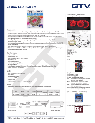 Zestaw LED RGB 2m 1) S zesnaście różnych kolorów świecenia, cztery programy sekwencyjne. Przeznaczenie: • Szerokie zastosowanie oraz łatwość montażu pozwalają na nieograniczone możliwości aranżacyjne zestawu LED RGB. • Miniaturowe wymiary umożliwiają wklejenie taśmy praktycznie wszędzie, zarówno w pomieszczeniach mieszkalnych jak również 2) Zestaw LED RGB. użytkowych np. podświetlenie sufitów, szafek, pułek, wnętrz pubów lub dyskotek itp. • Główną zaletą zestawu jest niepowtarzalny efekt wizualny. Za pomocą pilota dołączonego do zestawu ustawiamy szesnaście różnych kolorów świecenia oraz 4 programy sekwencyjne (zdj. nr. 3). • Taśma LED podklejona jest dwustronną taśmą samoprzylepną, która pozwala na montaż na wielu podłożach, także bezpośrednio na ścianie. • Taśma została umieszczona w specjalnym rękawie silikonowym, zabezpieczającym moduł przed uszkodzeniem, wilgocią (IP65) i niskimi temperaturami. • Dzięki starannemu wykonaniu i doskonałej przejrzystości silikon ma znikomy wpływ na walory oświetleniowe. • Większa ilość taśm LED RGB bardzo dobrze sprawdza się w branży reklamowej, dyskotekach, klubach oraz wszędzie tam gdzie animacje świetlne odgrywają kluczową rolę. Charakterystyka: • Zasilanie ~230V. • Stopień ochrony - IP65. • Liczba diod 30 sztuk na metr, łącznie 60 sztuk. • Długość taśmy 2m. • Taśma osłonięta silikonem. • Możliwość cięcia taśmy co 3 diody. • Kąt świecenia <(1200. • Zestaw składa się z: zasilacz LED, sterownik LED, 2m pokrytej silikonem taśmy RGB, czujnik podczerwieni, pilot, Opakowanie RGB DC 12V 2m 0,40 kg a) taśma LED RGB b) sterownik LED c) czujnik podczerwieni d) wyłącznik e) zasilacz LED f) pilot c d a) wybór koloru b) dostosowanie jasności c) włączanie/ wyłączanie d) wybór schematu kolorystycznego: flash - szybka skokowa zmiana kolorów (przeskok z jednego koloru na drugi) strobe - skokowa zmiana kolorów (trzy krótkie mignięcia danego koloru - zmiana) fade - płynna zmiana kolorów (przejście na inny kolor poprzez odcienie) smooth - powolna płynna zmiana kolorów (przejście na inny kolor poprzez odcienie) Karton Waga netto Waga brutto (ilość sztuk) (1 sztuka) (1 sztuka) 10 f 4) Kontroler LED RGB (index: LD-KONRGB-00). 0,43 kg 70 LD-ZL2RGB-00 LED RGB Zasilanie a a Uwagi: • Do podłączenia większej ilości taśm LED RGB zaleca się wykorzystanie kontrolera LED RGB (zdj. nr 4). Kolor b c b Zalety: • Łatwy montaż (taśma samoprzylepna). • Prosta obsługa. • Niezawodność w działaniu. • Czas pracy do 50 000h. • Niski pobór mocy. • Produkt nagrodzony tytułem HIT Produkcji Mebli 2010. Model d 3) Pilot komplet przewodów z wyłącznikiem. Index e 220 wymiary zestawu 0 18 wymiary opakowania IP 65 GTV, ul. Przejazdowa 21, 05-800 Pruszków; tel. 22 444 75 00; fax 22 444 75 01; www.gtv.com.pl 5) Produkt nagrodzony tytułem Hit Produkcji Mebli 2010.