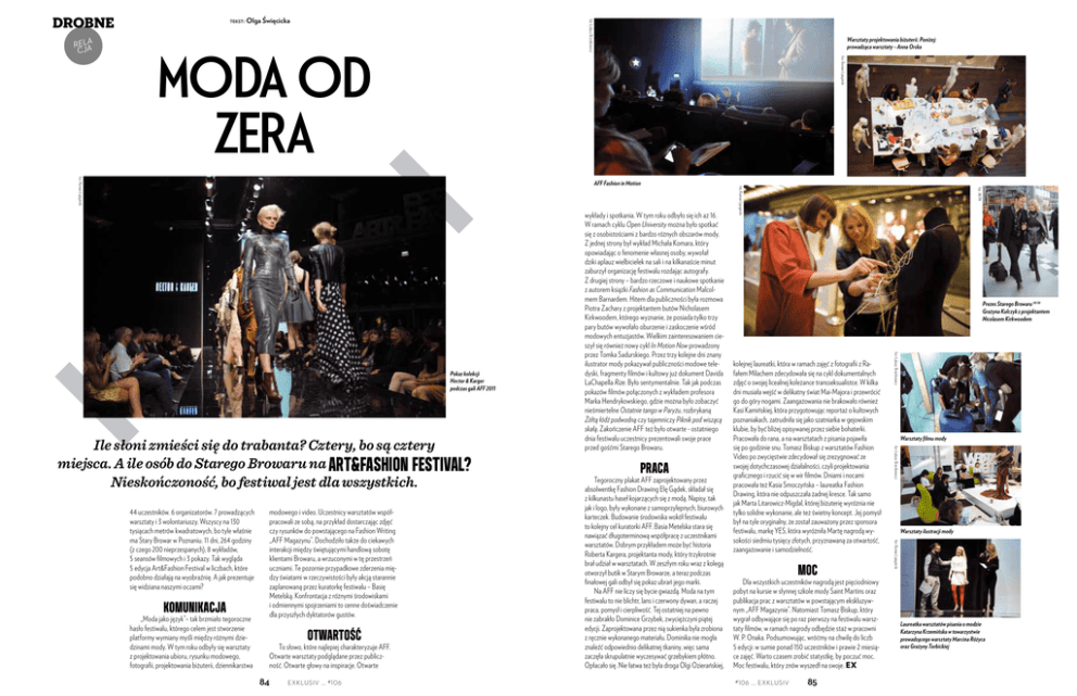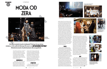 a rela cj tekst: Olga Święcicka fot. Łukasz Brześkiewicz DROBNE fot. Roman Lipigórski Moda od zera Warsztaty projektowania biżuterii. Poniżej: prowadząca warsztaty – Anna Orska Candy Girl i Tomasz Lubert Otwartość To słowo, które najlepiej charakteryzuje AFF. Otwarte warsztaty podglądane przez publiczność. Otwarte głowy na inspiracje. Otwarte 84 exklusiv ... #106 fot. AKPA Komunikacja „Moda jako język”– tak brzmiało tegoroczne hasło festiwalu, którego celem jest stworzenie platformy wymiany myśli między różnymi dziedzinami mody. W tym roku odbyły się warsztaty z projektowania ubioru, rysunku modowego, fotografii, projektowania biżuterii, dziennikarstwa modowego i video. Uczestnicy warsztatów współpracowali ze sobą, na przykład dostarczając zdjęć czy rysunków do powstającego na Fashion Writing „AFF Magazynu”. Dochodziło także do ciekawych interakcji między świętującymi handlową sobotę klientami Browaru, a wrzuconymi w tę przestrzeń uczniami. Te pozornie przypadkowe zderzenia między światami w rzeczywistości były akcją starannie zaplanowaną przez kuratorkę festiwalu – Basię Metelską. Konfrontacja z różnymi środowiskami i odmiennymi spojrzeniami to cenne doświadczenie dla przyszłych dyktatorów gustów. Moc Dla wszystkich uczestników nagrodą jest pięciodniowy pobyt na kursie w słynnej szkole mody Saint Martins oraz publikacja prac z warsztatów w powstającym ekskluzywnym „AFF Magazynie”. Natomiast Tomasz Biskup, który wygrał odbywające się po raz pierwszy na festiwalu warsztaty filmów, w ramach nagrody odbędzie staż w pracowni W. P. Onaka. Podsumowując, wróćmy na chwilę do liczb 5 edycji: w sumie ponad 150 uczestników i prawie 2 miesiące zajęć. Warto czasem zrobić statystkę, by poczuć moc. Moc festiwalu, który znów wyszedł na swoje. EX #106 ... exklusiv 85 Warsztaty filmu mody Warsztaty ilustracji mody fot. Roman Lipigórski 44 uczestników. 6 organizatorów. 7 prowadzących warsztaty i 3 wolontariuszy. Wszyscy na 130 tysiącach metrów kwadratowych, bo tyle właśnie ma Stary Browar w Poznaniu. 11 dni, 264 godziny (z czego 200 nieprzespanych), 8 wykładów, 5 seansów filmowych i 3 pokazy. Tak wygląda 5 edycja Art&Fashion Festival w liczbach, które podobno działają na wyobraźnię. A jak prezentuje się widziana naszymi oczami? Praca Tegoroczny plakat AFF zaprojektowany przez absolwentkę Fashion Drawing Elę Gądek, składał się z kilkunastu haseł kojarzących się z modą. Napisy, tak jak i logo, były wykonane z samoprzylepnych, biurowych karteczek. Budowanie środowiska wokół festiwalu to kolejny cel kuratorki AFF. Basia Metelska stara się nawiązać długoterminową współpracę z uczestnikami warsztatów. Dobrym przykładem może być historia Roberta Kargera, projektanta mody, który trzykrotnie brał udział w warsztatach. W zeszłym roku wraz z kolegą otworzył butik w Starym Browarze, a teraz podczas finałowej gali odbył się pokaz ubrań jego marki. Na AFF nie liczy się bycie gwiazdą. Moda na tym festiwalu to nie blichtr, lans i czerwony dywan, a raczej praca, pomysł i cierpliwość. Tej ostatniej na pewno nie zabrakło Dominice Grzybek, zwyciężczyni piątej edycji. Zaprojektowana przez nią sukienka była zrobiona z ręcznie wykonanego materiału. Dominika nie mogła znaleźć odpowiednio delikatnej tkaniny, więc sama zaczęła skrupulatnie wyczesywać grzebykiem płótno. Opłacało się. Nie łatwa też była droga Olgi Ozierańskiej, kolejnej laureatki, która w ramach zajęć z fotografii z Rafałem Milachem zdecydowała się na cykl dokumentalnych zdjęć o swojej licealnej koleżance transseksualistce. W kilka dni musiała wejść w delikatny świat Mai-Majora i przewrócić go do góry nogami. Zaangażowania nie brakowało również Kasi Kamińskiej, która przygotowując reportaż o kultowych poznaniakach, zatrudniła się jako szatniarka w gejowskim klubie, by być bliżej opisywanej przez siebie bohaterki. Pracowała do rana, a na warsztatach z pisania pojawiła się po godzinie snu. Tomasz Biskup z warsztatów Fashion Video po zwycięstwie zdecydował się zrezygnować ze swojej dotychczasowej działalności, czyli projektowania graficznego i rzucić się w wir filmów. Dniami i nocami pracowała też Kasia Smoczyńska – laureatka Fashion Drawing, która nie odpuszczała żadnej kresce. Tak samo jak Marta Litarowicz-Migdal, której biżuterię wyróżnia nie tylko solidne wykonanie, ale też świetny koncept. Jej pomysł był na tyle oryginalny, że został zauważony przez sponsora festiwalu, markę YES, która wyróżniła Martę nagrodą wysokości siedmiu tysięcy złotych, przyznawaną za otwartość, zaangażowanie i samodzielność. fot. Łukasz Brześkiewicz Ile słoni zmieści się do trabanta? Cztery, bo są cztery miejsca. A ile osób do Starego Browaru na Art&Fashion Festival? Nieskończoność, bo festiwal jest dla wszystkich. Prezes Starego Browaru 50 50 Grażyna Kulczyk z projektantem Nicolasem Kirkwoodem fot. Łukasz Brześkiewicz Pokaz kolekcji Hector & Karger podczas gali AFF 2011 wykłady i spotkania. W tym roku odbyło się ich aż 16. W ramach cyklu Open University można było spotkać się z osobistościami z bardzo różnych obszarów mody. Z jednej strony był wykład Michała Komara, który opowiadając o fenomenie własnej osoby, wywołał dziki aplauz wielbicielek na sali i na kilkanaście minut zaburzył organizację festiwalu rozdając autografy. Z drugiej strony – bardzo rzeczowe i naukowe spotkanie z autorem książki Fashion as Communication Malcolmem Barnardem. Hitem dla publiczności była rozmowa Piotra Zachary z projektantem butów Nicholasem Kirkwoodem, którego wyznanie, że posiada tylko trzy pary butów wywołało oburzenie i zaskoczenie wśród modowych entuzjastów. Wielkim zainteresowaniem cieszył się również nowy cykl In Motion Now prowadzony przez Tomka Sadurskiego. Przez trzy kolejne dni zn