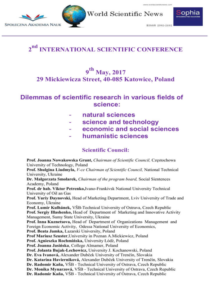 nd 2 INTERNATIONAL SCIENTIFIC CONFERENCE th 9 May, 2017 29 Mickiewicza Street, 40-085 Katowice, Poland Dilemmas of scientific research in various fields of science: - natural sciences science and technology economic and social sciences humanistic sciences Scientific Council: Prof. Joanna Nowakowska Grunt, Chairman of Scientific Council, Częstochowa University of Technology, Poland Prof. Shulgina Liudmyla, V-ce Chairman of Scientific Council, National Technical University, Ukraine Dr. Małgorzata Smolarek, Chairman of the program board, Social Sientences Academy, Poland Prof. dr hab. Viktor Petrenko,Ivano-Frankivsk National University Technical University of Oil an Gas Prof. Yuriy Daynovski, Head of Marketing Department, Lviv University of Trade and Economy, Ukraine Prof. Lumír Kulhánek, VŠB-Technical University of Ostrava, Czech Republic Prof. Sergiy Illashenko, Head of Department of Marketing and Innovative Activity Management, Sumy State University, Ukraine Prof. Inna Kuznetsova, Head of Department of Organizations Management and Foreign Economic Activity, Odessa National University of Economics, Prof. Beata Jamka, Łazarski University, Poland Prof Mariusz Szuster,University in Poznan A.Mickiewicz, Poland Prof. Agnieszka Rochmińska, University Łódź, Poland Prof. Joanna Jasińska, College Almamer, Poland Prof. Jolanta Bujak-Lechowicz, University J. Kochanowski, Poland Dr. Eva Ivanová, Alexander Dubček University of Trenčín, Slovakia Dr. Katarína Havierniková, Alexander Dubček University of Trenčín, Slovakia Dr. Radomir Kaňa, VŠB - Technical University of Ostrava, Czech Republic Dr. Monika Mynarzová, VŠB - Technical University of Ostrava, Czech Republic Dr. Radomir Kaňa, VŠB - Technical University of Ostrava, Czech Republic Dr. Sergii Vasylyk, Simon Kuznets Kharkiv National University of Economics, Ukraine Dr. Justyna Malkuch-Switalska, Université de Lorraine, France Dr. Tetyana Pasko, Vincent Pol University in Lublin, Poland Dr. Nina Szczygieł, Universidade de Aveiro, Portugal Dr. Tomasz Borowski, Editor-in-Chief, World Scientific News, Poland Dr inż. Kamil Maciuk, AGH University of Science and Technology, Poland Dr Malwina Zamojska-Król,AGH University of Science and Technology, Poland Dr. Malgorzata Rutkowska-Podołowska, Wrocław University of Technology, Poland Dr. Irenuesz Miciuła, Editor-in-Chief, Scientific Publishing House „SOPHIA”, Szczecin University, Poland Dr. Jarosław Czaja, Wrocław University of Economics, Poland Dr. Agnieszka Kurc-Lisiecka, Higher School of Business in Olkusz, Poland Dr. Jadwiga Bakonyi, Humanitas University in Sosnowiec, Poland Dr. Joanna Dzieńdziora, Higher School of Business in Dąbrowa Górnicza, Poland Dr. Izabela Turek, Częstochowa University of Technology, Poland Dr. Anna Lemańska-Majdzik, Częstochowa University of Technology, Poland Dr. Małgorzata Okręglicka, Częstochowa University of Technology, Poland Dr. Judyta Kabus, Częstochowa University of Technology, Poland Dr. Agnieszka Kańczukowska-Stadnik, Gniezno Higher School of Millenium, Poland Dr. Monika Sipa, Częstochowa University of Technology, Poland Dr. Anna Bęczkowska, Gniezno Higher School of Millenium, Poland Dr. Małgorzata Hordyńska, Silesian University of Technology, Poland Dr. Małgorzata Rutkowska- Podołowska, Wrocław University of Technology, Poland Dr. Agnieszka Kurc-Lisiecka, Higher School of Business in Olkusz, Poland Dr. Wojciech J. Janik, The Elblag University of Humanities and Economy, Poland Dr. inż. Piotr Lenik, State Higher Vocational School them. S. Pigonia in Krosno, Poland Dr. Rafał Mazur, West Pomeranian University of Technology, Poland Dr. Agnieszka Malkowska, Szczecin University, Poland Dr. Arkadiusz Malkowski, West Pomeranian University of Technology, Poland Dr. Piotr Nowaczyk, West Pomeranian University of Technology, Poland Dr. Dariusz Kotarski, Koszalin University of Technology, Poland Dr. Michał Czuba, University of Silesia In Katowice, Poland Dr. Joanna Łodziana-Grabowska, Bielska Higher School, Poland Dr. Błażej Kmieciak, Medical University of Łódź, Poland Dr. Monika Michalska, Zielona Góra University, Poland Dr. Andrzej Łączak, State Higher Vocational School in Sulechow, Poland Dr. Marzena Kruk, Maria Curie-Skłodowska University in Lublin, Poland Organizing Committee: Dr. Ireneusz Miciuła, Chairman of Organizational Advice, Szczecin University, Poland Ms. Anna Kowalczyk, Częstochowa University of Technology, Poland Ms. Anna Nurzyńska, Siedlce University of Natural Sciences and Humanities, Poland Mr. Henryk Wojtaszek, Częstochowa University of Technology, Poland Ms. Żaneta Nejman, Częstochowa University of Technology, Poland Organizer: Scientific Publishing SOPHIA Training and Scientific Center SOPHIA Institute of Finance and Management of Innovations Partners: International journal: World Scientific News Faculty of Applied Sciences in Krakow, Social Academy of Sciences, Patronage: Creative Business Cluster Association of Doctoral POLDOC Silesian Marketing Association Kraków Association of Speakers Conference fee: Participation in conference - 60 Euro The participation in conference as well as the publication of article - 100 Euro The publication of article - 60 Euro, (article of minimum 6 pages) (Conference proceedings are marked as international paper) Post-conference publication: - articles in international journal of World Scientific News (ISSN 2392-2192) http://www.worldscientificnews.com/ Conference venue: Scientific Publishing SOPHIA in Katowice 29 Mickiewicza Street, 40-085 Katowice, Poland E-mail: [email protected] http://www.sophiabauty.pl/konferencje-miedzynarodowe.html Payments recipient: Centre of Training-Scientific ”SOPHIA” 29 Mickiewicza Street, 40-085 Katowice, Poland Account number: PL 17 1050 1230 1000 0092 1485 4086 SWIFT/BIC: INGBPLPW Important dates: Application for participation fee payment: 15 January 2016 Publication in scientific journal: 10 March 2017