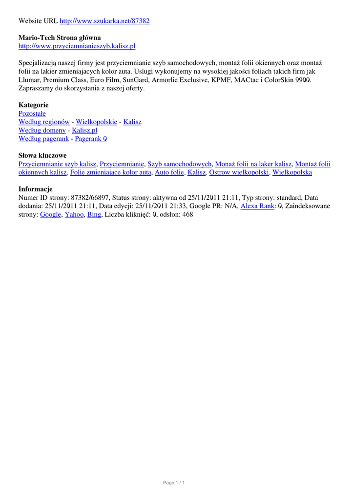Website URL http://www.szukarka.net/87382 Mario-Tech Strona główna http://www.przyciemnianieszyb.kalisz.pl Specjalizacją naszej firmy jest przyciemnianie szyb samochodowych, montaż folii okiennych oraz montaż folii na lakier zmieniajacych kolor auta. Uslugi wykonujemy na wysokiej jakości foliach takich firm jak Llumar, Premium Class, Euro Film, SunGard, Armorlie Exclusive, KPMF, MACtac i ColorSkin 9900. Zapraszamy do skorzystania z naszej oferty. Kategorie Pozostałe Według regionów - Wielkopolskie - Kalisz Według domeny - Kalisz.pl Według pagerank - Pagerank 0 Słowa kluczowe Przyciemnianie szyb kalisz, Przyciemnianie, Szyb samochodowych, Monaż folii na laker kalisz, Montaż folii okiennych kalisz, Folie zmieniajace kolor auta, Auto folie, Kalisz, Ostrow wielkopolski, Wielkopolska Informacje Numer ID strony: 87382/66897, Status strony: aktywna od 25/11/2011 21:11, Typ strony: standard, Data dodania: 25/11/2011 21:11, Data edycji: 25/11/2011 21:33, Google PR: N/A, Alexa Rank: 0, Zaindeksowane strony: Google, Yahoo, Bing, Liczba kliknięć: 0, odsłon: 468 Page 1 / 1