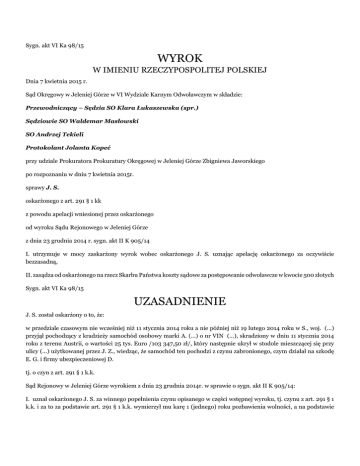 Sygn. akt VI Ka 98/15 WYROK W IMIENIU RZECZYPOSPOLITEJ POLSKIEJ Dnia 7 kwietnia 2015 r. Sąd Okręgowy w Jeleniej Górze w VI Wydziale Karnym Odwoławczym w składzie: Przewodniczący – Sędzia SO Klara Łukaszewska (spr.) Sędziowie SO Waldemar Masłowski SO Andrzej Tekieli Protokolant Jolanta Kopeć przy udziale Prokuratora Prokuratury Okręgowej w Jeleniej Górze Zbigniewa Jaworskiego po rozpoznaniu w dniu 7 kwietnia 2015r. sprawy J. S. oskarżonego z art. 291 § 1 kk z powodu apelacji wniesionej przez oskarżonego od wyroku Sądu Rejonowego w Jeleniej Górze z dnia 23 grudnia 2014 r. sygn. akt II K 905/14 I. utrzymuje w mocy zaskarżony wyrok wobec oskarżonego J. S. uznając apelację oskarżonego za oczywiście bezzasadną, II. zasądza od oskarżonego na rzecz Skarbu Państwa koszty sądowe za postępowanie odwoławcze w kwocie 500 złotych Sygn. akt VI Ka 98/15 UZASADNIENIE J. S. został oskarżony o to, że: w przedziale czasowym nie wcześniej niż 11 stycznia 2014 roku a nie później niż 19 lutego 2014 roku w S., woj. (...) przyjął pochodzący z kradzieży samochód osobowy marki A. (...) o nr VIN (...), skradziony w dniu 11 stycznia 2014 roku z terenu Austrii, o wartości 25 tys. Euro /103 347,50 zł/, który następnie ukrył w stodole mieszczącej się przy ulicy (...) użytkowanej przez J. Z., wiedząc, że samochód ten pochodzi z czynu zabronionego, czym działał na szkodę E. G. i firmy ubezpieczeniowej D. tj. o czyn z art. 291 § 1 k.k. Sąd Rejonowy w Jeleniej Górze wyrokiem z dnia 23 grudnia 2014r. w sprawie o sygn. akt II K 905/14: I. uznał oskarżonego J. S. za winnego popełnienia czynu opisanego w części wstępnej wyroku, tj. czynu z art. 291 § 1 k.k. i za to za podstawie art. 291 § 1 k.k. wymierzył mu karę 1 (jednego) roku pozbawienia wolności, a na podstawie art. 33 § 2 i 3 k.k. wymierzył mu karę 150 (stu pięćdziesięciu) stawek dziennych grzywny ustalając wysokość jednej stawki dziennej na kwotę 10 (dziesięć) złotych każda; II. na podstawie art. 69 § 1 i § 2 k.k. wykonanie wymierzonej oskarżonemu J. S. kary pozbawienia wolności warunkowo zawiesił ustalając na podstawie art. 70 § 1 pkt 1 k.k. okres próby na 4 (cztery) lata; III. na podstawie art. 63 § 1 k.k. na poczet wymierzonej oskarżonemu J. S. kary grzywny zaliczył okres zatrzymania w dniu 2 kwietnia 2014r.; IV. na podstawie art. 624 § 1 k.p.k. zwolnił w całości oskarżonego J. S. od kosztów sądowych obciążając nimi Skarb Państwa, w tym na podstawie art. 17 ust. 1 ustawy z dnia 23 czerwca 1973r. o opłatach w sprawach karnych nie wymierzył mu opłaty. Apelację od powyższego wyroku wywiódł oskarżony, który kwestionował poczynione przez Sąd ustalenia faktyczne podnosząc, iż opierają się one na fałszywych zeznaniach J. Z., podczas gdy oskarżony nie ma z przedmiotem sprawy nic wspólnego. Ponadto skarżący argumentował, iż zabezpieczony podczas przeszukania laptop nie należał do niego, służył bowiem p. J. do wykonywania działalności gospodarczej i „nic podejrzanego na nim nie znaleziono”. Oskarżony podniósł także, iż informacje z (...) nie wskazują, iż aukcje dotyczą tego konkretnego przedmiotu oraz że nie zabezpieczono żadnych przedmiotów z aukcji internetowych. Nadto, powołując się na sporządzoną w sprawie opinię mechanoskopijną skarżący podniósł, iż nie zabezpieczono jego odcisków palców na żadnym z przedmiotów przestępstwa. Kwestionując zasadność przypisania mu popełnienia zarzucanego czynu J. S. argumentował, iż niniejsza sprawa „to klasyczny przypadek słowa przeciwko słowu”, a mimo to w zaskarżonym wyroku sędzia orzekł wyższą karę, niż wnioskował prokurator. Podnosząc powyższe zarzuty oskarżony stwierdził, iż czuje się pokrzywdzony wyrokiem i wniósł o „ponowne rozpatrzenie jego sprawy”. Sąd Okręgowy zważył, co następuje: Apelację oskarżonego uznać należało za bezzasadną w stopniu oczywistym. Chociaż oskarżony konsekwentnie nie przyznawał się do popełnienia zarzucanego mu czynu, celowym wydaje się przytoczenie sposobu wnioskowania, który pozwolił na przypisanie J. S. popełnienie zarzucanego mu czynu z art. 291 § 1 k.k. W przekonaniu Sądu Odwoławczego bowiem materiał dowodowy zgromadzony w niniejszej sprawie, który to Sąd Rejonowy ocenił zgodnie z zasadami określonymi w art. 7 k.p.k., wskazuje jednoznacznie na sprawstwo i winę J. S. w zakresie przypisanego mu czynu. Okolicznością bezsporną w niniejszej sprawie było dokonanie na terenie Austrii w dniu 11 stycznia 2014r. kradzieży samochodu marki A. (...) o nr VIN (...). Następnie właściciel utraconego pojazdu zidentyfikował pochodzące z niego felgi oferowane na portalu (...) przez użytkownika „(...)” na aukcji internetowej nr (...), bowiem posiadały one cechy charakterystyczne. Z informacji otrzymanych z serwisu (...) (k. 102-104) wynika, iż posiadaczem konta „(...)” jest J. S. zam. przy ul. (...) w S., nr tel. (...). Użytkownik ten we wskazanej aukcji jako numer telefonu kontaktowego wskazał (...). Ponadto ujawniono powiązanie tego konta z adresem e-mail (...). Użytkownik „(...)”, poza wskazanymi felgami do A. (...) (wystawionymi wcześniej na aukcjach nr (...) i (...)), oferował na aukcjach internetowych także inne części A. (...), tj. przód karoserii (aukcje nr (...) i (...)), tył karoserii (aukcja nr (...)), klapę tylną (aukcje nr (...) i (...)), dach z podsufitką (aukcja nr (...)), zderzak (aukcja nr (...) oraz (...), na której wystawiono także lampy, maskę i błotniki), drzwi z lusterkami (aukcja nr (...)), komplet foteli (aukcje nr (...), (...) i (...)), skrzynię biegów (aukcje nr (...) i (...)), deskę rozdzielczą (aukcje nr (...) i (...)). Aukcje internetowe z w/w przedmiotami były zamieszczane przez użytkownika „(...)” w okresie od 23 stycznia 2014r. do 2 marca 2014r. Wobec powyższego za całkowicie chybiony należy uznać zarzut osk