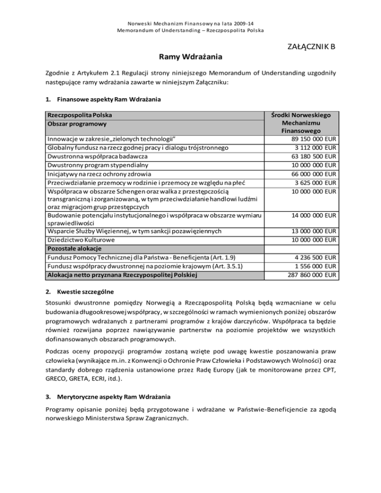Norwes ki Mecha ni zm Fi na ns owy na l a ta 2009-14 Memora ndum of Unders ta ndi ng – Rzeczpos pol i ta Pol s ka ZAŁĄCZNIK B Ramy Wdrażania Zgodnie z Artykułem 2.1 Regulacji strony niniejszego Memorandum of Understanding uzgodniły następujące ramy wdrażania zawarte w niniejszym Załączniku: 1. Finansowe aspekty Ram Wdrażania Rzeczpospolita Polska Obszar programowy Innowacje w zakresie„zielonych technologii” Globalny fundusz na rzecz godnej pracy i dialogu trójstronnego Dwustronna współpraca badawcza Dwustronny program stypendialny Inicjatywy na rzecz ochrony zdrowia Przeciwdziałanie przemocy w rodzinie i przemocy ze względu na płeć Współpraca w obszarze Schengen oraz walka z przestępczością transgraniczną i zorganizowaną, w tym przeciwdziałanie handlowi ludźmi oraz migracjom grup przestępczych Budowanie potencjału instytucjonalnego i współpraca w obszarze wymiaru sprawiedliwości Wsparcie Służby Więziennej, w tym sankcji pozawięziennych Dziedzictwo Kulturowe Pozostałe alokacje Fundusz Pomocy Technicznej dla Państwa - Beneficjenta (Art. 1.9) Fundusz współpracy dwustronnej na poziomie krajowym (Art. 3.5.1) Alokacja netto przyznana Rzeczypospolitej Polskiej Środki Norweskiego Mechanizmu Finansowego 89 150 000 EUR 3 112 000 EUR 63 180 500 EUR 10 000 000 EUR 66 000 000 EUR 3 625 000 EUR 10 000 000 EUR 14 000 000 EUR 13 000 000 EUR 10 000 000 EUR 4 236 500 EUR 1 556 000 EUR 287 860 000 EUR 2. Kwestie szczególne Stosunki dwustronne pomiędzy Norwegią a Rzecząpospolitą Polską będą wzmacniane w celu budowania długookresowej współpracy, w szczególności w ramach wymienionych poniżej obszarów programowych wdrażanych z partnerami programów z krajów darczyńców. Współpraca ta będzie również rozwijana poprzez nawiązywanie partnerstw na poziomie projektów we wszystkich dofinansowanych obszarach programowych. Podczas oceny propozycji programów zostaną wzięte pod uwagę kwestie poszanowania praw człowieka (wynikające m.in. z Konwencji o Ochronie Praw Człowieka i Podstawowych Wolności) oraz standardy dobrego rządzenia ustanowione przez Radę Europy (jak te monitorowane przez CPT, GRECO, GRETA, ECRI, itd.). 3. Merytoryczne aspekty Ram Wdrażania Programy opisanie poniżej będą przygotowane i wdrażane w Państwie-Beneficjencie za zgodą norweskiego Ministerstwa Spraw Zagranicznych. Norweski M echanizm Finansowy na lata 2009-14 M emorandum of Understanding – Rzeczpospolita Polska A. Obszar programowy: Innowacje w zakresie„zielonych technologii” (obszar programowy nr 21) Program 1: Dostosowanie przedsiębiorstw do wymogów ochrony środowiska i redukcja emisji CO2 Rezultaty: Zmniejszenie produkcji zanieczyszczeń i redukcja ich emisji do powietrza, gleby i wód Operator Programu: Ministerstwo Środowiska z pomocą Narodowego Funduszu Ochrony Środowiska i Gospodarki Wodnej Kwestia szczególna: Program będzie wdrażany łącznie z programem objętym finansowaniem w ramach obszaru programowego nr 5 Mechanizmu Finansowego Europejskiego Obszaru Gospodarczego. Alokacja na ten program wynosi 69 150 000 EUR. Program 2: Innowacje w zakresie„zielonych technologii” Rezultaty: Do uzgodnienia Operator Programu: Innovation Noraway Kwestia szczególna: Alokacja na ten program wynosi 20 000 000 EUR B. Obszar programowy: Globalny fundusz na rzecz godnej pracy i dialogu trójstronnego (obszar programowy nr 22) Program: Globalny fundusz na rzecz godnej pracy i dialogu trójstronnego Cel: Promowanie godnej pracy i poprawa współpracy trójstronnej między organizacjami pracodawców, związkami zawodowymi i władzami publicznymi przy wspieraniu sprawiedliwego i zrównoważonego rozwoju gospodarczego i społecznego Rezultaty: Poprawa struktur i praktyk w zakresie dialogu społecznego i dialogu trójstronnego Lepsze zrozumienie korzyści płynących z godnej pracy Lepszy dostęp do zatrudnienia i uczestnictwo na rynku pracy Większa koncentracja na wymiarze społecznym mobilności siły roboczej Wspieranie równości płci i zwalczanie dyskryminacji w miejscu pracy Poprawa równowagi między pracą a życiem prywatnym i rodzinnym Większe zdolności adaptacyjne i możliwości kształcenia ustawicznego pracownika Operator Programu: Innovation Norway C. Obszar programowy: Dwustronna współpraca badawcza (obszar programowy nr 23) 2 Norweski M echanizm Finansowy na lata 2009-14 M emorandum of Understanding – Rzeczpospolita Polska Program: Norwesko - Polska Współpraca Badawcza (program partnerski z darczyńcami) Operator Programu: Narodowe Centrum Badań i Rozwoju, Warszawa Partner(-zy) programu z krajów darczyńców: Norweska Rada Nauki Kwestie szczególne: Wsparcie w obszarze ochrony środowiska i zmian klimatycznych, w tym badań polarnych, oraz technologii wychwytywania i składowania CO2, ochrony zdrowia i nauk społecznych, z uwzględnieniem tematyki migracji W ramach alokacji programu kwota 3 000 000 EUR zostanie przeznaczona na badania naukowe w obszarze „Promowanie równości płci oraz równowagi między życiem zawodowym a prywatnym” Co najmniej 26 000 000 EUR zostanie przeznaczone na obszar ochrona środowiska i zmiany klimatyczne, z czego do 10 000 000 EUR zostanie w pierwszej kolejności przeznaczone na obszar „Technologie wychwytywania i składowania CO 2” D. Obszar programowy: Dwustronny program stypendialny (obszar programowy nr 24) Program: Norwesko - polski program stypendialny (program partnerski z darczyńcami) Rezultaty: Zwiększona mobilność studentów oraz pracowników szkolnictwa wyższego pomiędzy Państwami - Beneficjentami a Norwegią Rozszerzona i wzmocniona współpraca instytucjonalna w sektorze szkolnictwa wyższego pomiędzy Państwami - Beneficjentami a Norwegią Operator Programu: Fundacja Rozwoju Systemu Edukacji Partner(-zy) programu z kraju darczyńców: Norweskie Centrum Współpracy Międzynarodowej w Szkolnictwie Wyższym (SIU) Kwestia szczególna: Program będzie wdrażany łącznie z p