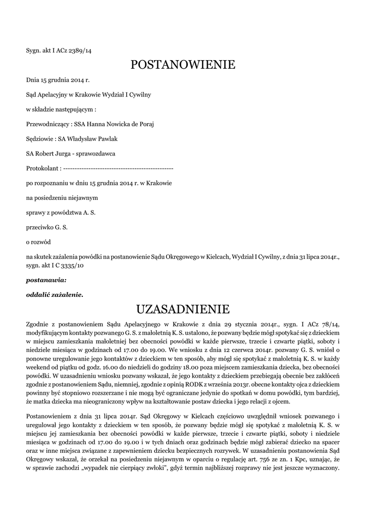 Sygn. akt I ACz 2389/14 POSTANOWIENIE Dnia 15 grudnia 2014 r. Sąd Apelacyjny w Krakowie Wydział I Cywilny w składzie następującym : Przewodniczący : SSA Hanna Nowicka de Poraj Sędziowie : SA Władysław Pawlak SA Robert Jurga - sprawozdawca Protokolant : -----------------------------------------------po rozpoznaniu w dniu 15 grudnia 2014 r. w Krakowie na posiedzeniu niejawnym sprawy z powództwa A. S. przeciwko G. S. o rozwód na skutek zażalenia powódki na postanowienie Sądu Okręgowego w Kielcach, Wydział I Cywilny, z dnia 31 lipca 2014r., sygn. akt I C 3335/10 postanawia: oddalić zażalenie. UZASADNIENIE Zgodnie z postanowieniem Sądu Apelacyjnego w Krakowie z dnia 29 stycznia 2014r., sygn. I ACz 78/14, modyfikującym kontakty pozwanego G. S. z małoletnią K. S. ustalono, że pozwany będzie mógł spotykać się z dzieckiem w miejscu zamieszkania małoletniej bez obecności powódki w każde pierwsze, trzecie i czwarte piątki, soboty i niedziele miesiąca w godzinach od 17.00 do 19.00. We wniosku z dnia 12 czerwca 2014r. pozwany G. S. wniósł o ponowne uregulowanie jego kontaktów z dzieckiem w ten sposób, aby mógł się spotykać z małoletnią K. S. w każdy weekend od piątku od godz. 16.00 do niedzieli do godziny 18.00 poza miejscem zamieszkania dziecka, bez obecności powódki. W uzasadnieniu wniosku pozwany wskazał, że jego kontakty z dzieckiem przebiegają obecnie bez zakłóceń zgodnie z postanowieniem Sądu, niemniej, zgodnie z opinią RODK z września 2013r. obecne kontakty ojca z dzieckiem powinny być stopniowo rozszerzane i nie mogą być ograniczane jedynie do spotkań w domu powódki, tym bardziej, że matka dziecka ma nieograniczony wpływ na kształtowanie postaw dziecka i jego relacji z ojcem. Postanowieniem z dnia 31 lipca 2014r. Sąd Okręgowy w Kielcach częściowo uwzględnił wniosek pozwanego i uregulował jego kontakty z dzieckiem w ten sposób, że pozwany będzie mógł się spotykać z małoletnią K. S. w miejscu jej zamieszkania bez obecności powódki w każde pierwsze, trzecie i czwarte piątki, soboty i niedziele miesiąca w godzinach od 17.00 do 19.00 i w tych dniach oraz godzinach będzie mógł zabierać dziecko na spacer oraz w inne miejsca związane z zapewnieniem dziecku bezpiecznych rozrywek. W uzasadnieniu postanowienia Sąd Okręgowy wskazał, że orzekał na posiedzeniu niejawnym w oparciu o regulację art. 756 ze zn. 1 Kpc, uznając, że w sprawie zachodzi „wypadek nie cierpiący zwłoki”, gdyż termin najbliższej rozprawy nie jest jeszcze wyznaczony. Sąd zważył, iż zabezpieczenie kontaktów pozwanego z córką jest konieczne, by nie doszło do rozluźnienia więzi emocjonalnych, zwłaszcza że strony pozostają w ostrym konflikcie, a dziecko jest uczuciowo związane z matką, w warunkach przez nią stworzonych czuje się pewnie. Sąd podkreślił, że małoletnia pozytywnie reaguje na obecność ojca, chętnie z nim przebywa, podejmuje różne formy aktywności zabawowej, niemniej jednak wyjście poza swoje miejsce zamieszkania dziewczynka kojarzy z radykalnymi zmianami w jej życiu, włącznie z rozdzieleniem jej z matką. Sąd Okręgowy wskazał, że niechęć dziecka do wyjazdów z ojcem do jego środowiska jest złożona, uwarunkowana postawą matki i działaniami ojca oraz konfliktowymi, rywalizacyjnymi relacjami rodziców. Sąd meriti podkreślił, że dla prawidłowego rozwoju emocjonalnego małoletniej konieczny jest kontakt z obojgiem rodziców. Małoletnia generalnie powinna mieć zapewniony kontakt z ojcem w jej miejscu zamieszkania, a rozszerzanie tych kontaktów poza obecne miejsce zamieszkania winno następować stopniowo, stąd należało uznać, że na obecnym etapie należy umożliwić ojcu zabieranie córki na spacery, ale bez możliwości zabierania jej poza miejsce zamieszkania dziecka. Zażalenie na powyższe postanowienie wniosła powódka zaskarżając je w całości i zarzucając: 1. sprzeczność istotnych ustaleń Sądu z treścią zebranego w sprawie materiału dowodowego poprzez uznanie, że pozwany może spotykać się z małoletnią córką poza miejscem zamieszkania dziecka, pomimo że jest to sprzeczne z dobrem dziecka, co wynika wprost z wniosków opinii RODK z dnia 19.09.2013r. sporządzonej między innymi na okoliczność zalecanych form kontaktu ojca z córką; 2. naruszenie przepisów prawa procesowego, które miało wpływ na treść orzeczenia tj. art. 742 § 1 Kpc poprzez dokonanie zmiany prawomocnego postanowienia, którym udzielono zabezpieczenia, pomimo braku przesłanek w postaci odpadnięcia lub zmiany przyczyn tegoż zabezpieczenia; 3. naruszenie art. 756 1 Kpc poprzez wydanie postanowienia na posiedzeniu niejawnym, w sytuacji gdy, wbrew twierdzeniom Sądu, termin rozprawy jest wyznaczony, a dobro dziecka nie jest zagrożone gdyż kontakty córki z ojcem są uregulowane i nie ma żadnych przeszkód do ich realizacji. W oparciu o powyższe zarzuty powódka wniosła o zmianę postanowienia poprzez oddalenie wniosku o zmianę zabezpieczenia. Sąd Apelacyjny zważył, co następuje. Zażalenie nie zasługiwało na uwzględnienie. W pierwszej kolejności należy wskazać na bezzasadność zarzutów powódki naruszenia przez Sąd Okręgowy przepisów prawa procesowego, a to art. 742§1 Kpc oraz art. 756 1 Kpc Zgodnie z treścią art. 742§1 Kpc obowiązany może w każdym czasie żądać uchylenia lub zmiany prawomocnego postanowienia, którym udzielono zabezpieczenia, gdy odpadnie lub zmieni się przyczyna zabezpieczenia. Jak słusznie wskazuje się w judykaturze zasadność żądania dłużnika uchylenia lub zmiany prawomocnego postanowienia udzielającego zabezpieczenia, opartego na twierdzeniu, że odpadła lub zmieniła się przyczyna zabezpieczenia, uwarunkowana jest wykazaniem zmian, jakie nastąpiły w stanie faktycznym sprawy stanowiącym podstawę udzielenia zabezpieczenia ( tak w postanowieniu SN z 23 sierpnia 1989 r., II CZ 135/89, LexisNexis nr 320716). W swo