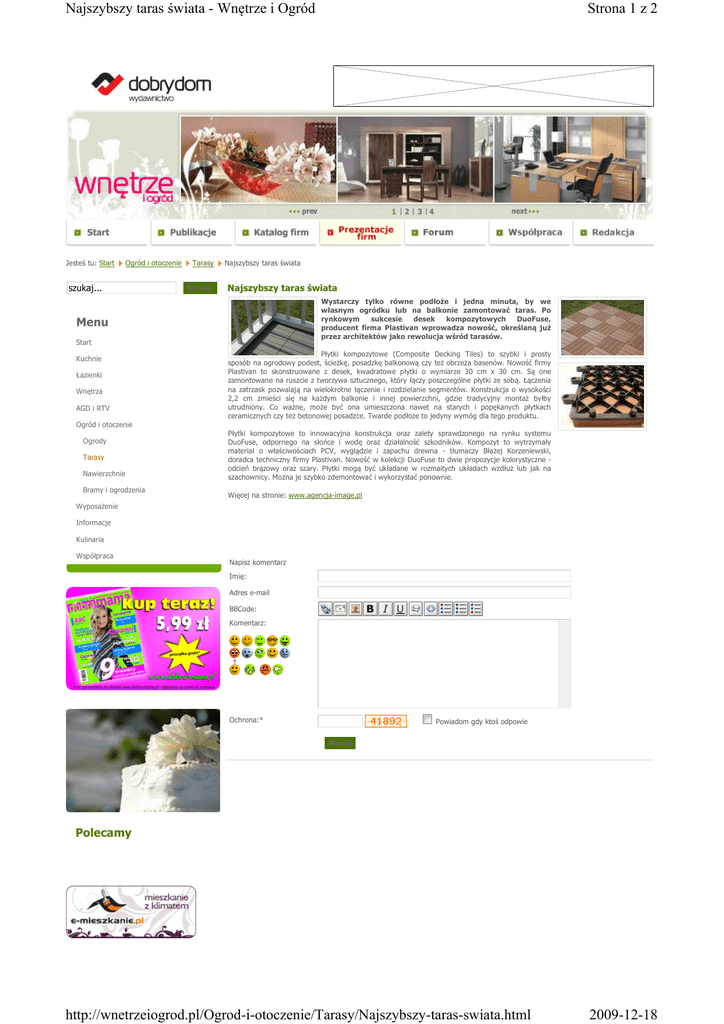 Najszybszy taras świata - Wnętrze i Ogród Jesteś tu: Start Ogród i otoczenie szukaj... Tarasy Szukaj Najszybszy taras świata Najszybszy taras świata Wystarczy tylko równe podłoże i jedna minuta, by we własnym ogródku lub na balkonie zamontować taras. Po rynkowym sukcesie desek kompozytowych DuoFuse, producent firma Plastivan wprowadza nowość, określaną już przez architektów jako rewolucja wśród tarasów. Menu Start Kuchnie Łazienki Wnętrza AGD i RTV Strona 1 z 2 Płytki kompozytowe (Composite Decking Tiles) to szybki i prosty sposób na ogrodowy podest, ścieżkę, posadzkę balkonową czy też obrzeża basenów. Nowość firmy Plastivan to skonstruowane z desek, kwadratowe płytki o wymiarze 30 cm x 30 cm. Są one zamontowane na ruszcie z tworzywa sztucznego, który łączy poszczególne płytki ze sobą. Łączenia na zatrzask pozwalają na wielokrotne łączenie i rozdzielanie segmentów. Konstrukcja o wysokości 2,2 cm zmieści się na każdym balkonie i innej powierzchni, gdzie tradycyjny montaż byłby utrudniony. Co ważne, może być ona umieszczona nawet na starych i popękanych płytkach ceramicznych czy też betonowej posadzce. Twarde podłoże to jedyny wymóg dla tego produktu. Ogród i otoczenie Ogrody Tarasy Nawierzchnie Bramy i ogrodzenia Płytki kompozytowe to innowacyjna konstrukcja oraz zalety sprawdzonego na rynku systemu DuoFuse, odpornego na słońce i wodę oraz działalność szkodników. Kompozyt to wytrzymały materiał o właściwościach PCV, wyglądzie i zapachu drewna - tłumaczy Błażej Korzeniewski, doradca techniczny firmy Plastivan. Nowość w kolekcji DuoFuse to dwie propozycje kolorystyczne odcień brązowy oraz szary. Płytki mogą być układane w rozmaitych układach wzdłuż lub jak na szachownicy. Można je szybko zdemontować i wykorzystać ponownie. Więcej na stronie: www.agencja-image.pl Wyposażenie Informacje Kulinaria Współpraca Napisz komentarz Imię: Adres e-mail BBCode: Komentarz: Ochrona:* Powiadom gdy ktoś odpowie Wyślij Polecamy http://wnetrzeiogrod.pl/Ogrod-i-otoczenie/Tarasy/Najszybszy-taras-swiata.html 2009-12-18 Najszybszy taras świata - Wnętrze i Ogród start Strona 2 z 2 publikacje katalog firm Wydawnictwo DOBRY DOM 35-061 Rzeszów ul. Króla Kazimierza 8/3 tel.: +48 17 852 52 20 tel.: +48 17 852 52 30 fax: +48 17 852 42 68 e-mail: [email protected] http://wnetrzeiogrod.pl/Ogrod-i-otoczenie/Tarasy/Najszybszy-taras-swiata.html 2009-12-18
