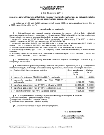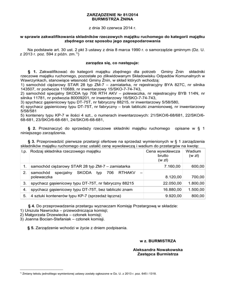 ZARZĄDZENIE Nr 81/2014 BURMISTRZA ŻNINA z dnia 30 czerwca 2014 r. w sprawie zakwalifikowania składników rzeczowych majątku ruchomego do kategorii majątku zbędnego oraz sposobu jego zagospodarowania Na podstawie art. 30 ust. 2 pkt 3 ustawy z dnia 8 marca 1990 r. o samorządzie gminnym (Dz. U. z 2013 r. poz. 594 z późn. zm.1)) zarządza się, co następuje: § 1. Zakwalifikować do kategorii majątku zbędnego dla potrzeb Gminy Żnin składniki rzeczowe majątku ruchomego, pozostałe po zlikwidowanym Składowisku Odpadów Komunalnych w Wawrzynkach, stanowiące własność Gminy Żnin, w skład których wchodzą: 1) samochód ciężarowy STAR 28 typ ZM-7 – zamiatarka, nr rejestracyjny BYA 827C, nr silnika 143507, nr podwozia 110689, nr inwentarzowy 15/SKO-7-74-743, 2) samochód specjalny SKODA typ 706 RTH AKV – polewaczka, nr rejestracyjny BYB 114N, nr silnika 11781, nr podwozia 80009201, nr inwentarzowy 16/SKO-7-74-743, 3) spychacz gąsienicowy typu DT-75T, nr fabryczny 88215, nr inwentarzowy 5/58/580, 4) spychacz gąsienicowy typu DT-75T, nr fabryczny – brak tabliczki znamionowej, nr inwentarzowy 5/58/581 5) kontenery typu KP-7 w ilości 4 szt., o numerach inwentarzowych: 21/SKO/6-68/681, 22/SKO/668-681, 23/SKO/6-68-681, 24/SKO/6-68-681, § 2. Przeznaczyć do sprzedaży rzeczowe składniki majątku ruchomego niniejszego zarządzenia. opisane w § 1 § 3. Przeprowadzić pierwsze przetargi ofertowe na sprzedaż wymienionych w § 1 zarządzenia składników majątku ruchomego oraz ustalić cenę wywoławczą i wadium do przetargów na kwotę: l.p. Rodzaj składnika rzeczowego majątku Cena wywoławcza Wadium brutto (w zł) (w zł) 1. samochód ciężarowy STAR 28 typ ZM-7 – zamiatarka 2. samochód specjalny polewaczka SKODA typ 706 RTHAKV 7.160,00 600,00 8.120,00 700,00 – 3. spychacz gąsienicowy typu DT-75T, nr fabryczny 88215 22.050,00 1.800,00 4. spychacz gąsienicowy typu DT-75T, bez tabliczki znam 16.880,00 1.500,00 5. 4 sztuki kontenerów typu KP-7 (sprzedaż łączna) 9.920,00 800,00 § 4. Do przeprowadzenia przetargu wyznaczam Komisję Przetargową w składzie: 1) Urszula Nawrocka – przewodnicząca komisji; 2) Małgorzata Drzewiecka – członek komisji; 3) Joanna Bocian-Stefaniak – członek komisji. § 5. Zarządzenie wchodzi w życie z dniem podpisania. w z. BURMISTRZA Aleksandra Nowakowska Zastępca Burmistrza ___________________ 1) Zmiany tekstu jednolitego wymienionej ustawy zostały ogłoszone w Dz. U. z 2013 r. poz. 645 i 1318. Uzasadnienie Przedmiotowe składniki majątkowe stanowią własność Gminy Żnin. Zostały one zakupione dla potrzeb jednostki budżetowej Gminy Żnin – Składowiska Odpadów Komunalnych w Wawrzynkach. W związku z likwidacją jednostki budżetowej spychacze gąsienicowe oraz kontenery, służący wyłącznie celom związanym z gromadzeniem odpadów na składowisku, stały się zbędne dla potrzeb Gminy Żnin. Samochody specjalne zamiatarka i polewaczka, z uwagi na wiek, stan techniczny i koszty eksploatacyjne związane z ich naprawą, były od kilku lat nieużytkowane. Komisja powołana do oceny przydatności przedmiotowych składników majątkowych Zarządzeniem Burmistrza Żnina Nr 81, z dnia 30 czerwca 2014 r. stwierdziła, że są one zbędna dla potrzeb Gminy Żnin i zaproponowała przeznaczenie ich do sprzedaży. Zgodnie z art. 30 ust. 2 pkt 3 powołanej wyżej ustawy z dnia 8 marca 1990 r. o samorządzie gminnym do zadań Burmistrza Żnina należy w szczególności gospodarowanie mieniem komunalnym Gminy Żnin. w z. BURMISTRZA Aleksandra Nowakowska Zastępca Burmistrza UN/UN