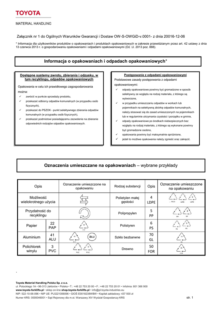Załącznik nr 1 do Ogólnych Warunków Gwarancji i Dostaw OW-S-OWGiD-v.0001- z dnia 20016-12-06 * Informacja dla użytkowników produktów o opakowaniach i produktach opakowaniowych w zakresie przewidzianym przez art. 42 ustawy z dnia 13 czerwca 2013 r. o gospodarowaniu opakowaniami i odpadami opakowaniowymi (Dz .U. 2013 poz. 888). Informacja o opakowaniach i odpadach opakowaniowych* Dostępne systemy zwrotu, zbierania i odzysku, w tym recyklingu, odpadów opakowaniowych Opakowania w celu ich prawidłowego zagospodarowania można: zwrócić w punkcie sprzedaży produktu, przekazać odbiorcy odpadów komunalnych (w przypadku osób Postępowanie z odpadami opakowaniowymi Podstawowe zasady postępowania z odpadami opakowaniowymi: selektywny ze względu na rodzaj materiału, z którego są wytworzone, fizycznych), przekazać podmiotowi posiadającemu zezwolenie na zbieranie odpowiednich rodzajów odpadów opakowaniowych. w przypadku umieszczaniu odpadów w workach lub pojemnikach na selektywną zbiórkę odpadów komunalnych, przekazać do PSZOK - punkt selektywnego zbierania odpadów należy stosować się do zasad umieszczonych na pojemnikach komunalnych (w przypadku osób fizycznych), odpady opakowaniowe powinny być gromadzone w sposób lub w regulaminie utrzymania czystości i porządku w gminie, odpady opakowaniowe po środkach niebezpiecznych bez względu na rodzaj materiału, z którego są wykonane powinny być gromadzone osobno, opakowania powinny być maksymalnie opróżnione, jeżeli to możliwe opakowania należy zgnieść oraz zakręcić. Oznaczenia umieszczane na opakowaniach – wybrane przykłady Oznaczenie umieszczone na opakowaniu Opis Rodzaj substancji Opis Możliwość wielokrotnego użycia Polietylen małej gęstości 4 LDPE Przydatność do recyklingu Polipropylen 5 PP Papier 22 PAP Polistyren 6 PS Aluminium 41 ALU Szkło bezbarwne 70 GL Polichlorek winylu 3 PVC Drewno 50 FOR Oznaczenie umieszczone na opakowaniu ` Toyota Material Handling Polska Sp. z o.o. ul. Potockiego 1A • 96-313 Jaktorów • Polska • T.: +48 22 753 20 00 • F.: +48 22 753 20 01 • Infolinia: 801 366 900 www.toyota-forklifts.pl • sklep on-line shop.toyota-forklifts.pl • [email protected] NIP: 522-10-06-096 • NIP UE: PL5221006096 • GIOŚ E0018238WBW • Kapitał zakładowy: 437 500 zł Numer KRS: 0000046001 • Sąd Rejonowy dla m.st. Warszawy XIV Wydział Gospodarczy KRS str. 1 Oznaczenia umieszczane na opakowaniach – oznakowanie CLP ** Informacja dla użytkowników produktów o opakowaniach i produktach opakowaniowych w zakresie przewidzianym przez art. 42 ustawy z dnia 13 czerwca 2013 r. o gospodarowaniu opakowaniami i odpadami opakowaniowymi (Dz .U. 2013 poz. 888). ** Oznakowanie CLP-klasyfikacja, oznakowanie i pakowanie substancji i mieszanin, zgodnie z rozporządzeniem Parlamentu Europejskiego i Rady (WE) nr 1272/2008 z dnia 16 grudnia 2008 r. w sprawie klasyfikacji, oznakowania i pakowania substancji i mieszanin, zmieniające i uchylające dyrektywy 67/548/EWG i 1999/45/WE oraz zmieniające rozporządzenie (WE) nr 1907/2006 (Dz.U. L 353 z 31.12.2008, s. 1-1355). Niestabilne materiały wybuchowe; Materiały wybuchowe z podklas 1.1, 1.2, 1.3, 1.4; Substancje i mieszaniny samoreaktywne, typy A, ; Nadtlenki organiczne, typy A, B. Gazy łatwopalne, kategoria zagrożenia 1; Oznaczenia umieszczane na opakowaniach – oznakowanie CLP Wyroby aerozolowe łatwopalne, kategorie zagrożeń 1, 2; Ciecze łatwopalne, kategorie zagrożeń 1, 2, 3; Ciała stałe łatwopalne, kategorie zagrożeń 1, 2; Substancje i mieszaniny samoreaktywne, typy B, C, D, E, F; Ciecze piroforyczne, kategoria zagrożenia 1; Ciała stałe piroforyczne, kategoria zagrożenia 1; Substancje i mieszaniny samonagrzewające się, kategorie zagrożeń 1, 2; Substancje i mieszaniny, które w kontakcie z wodą wydzielają gazy łatwopalne, kategorie zagrożeń 1, 2, 3; Nadtlenki organiczne, typy B, C, D, E, F. Gazy utleniające, kategoria zagrożenia 1; Ciecze utleniające, kategorie zagrożeń 1, 2, 3; Ciała stałe utleniające, kategorie zagrożeń 1, 2, 3. Gazy pod ciśnieniem: Gazy sprężone; Gazy skroplone; Gazy skroplone schłodzone; Gazy rozpuszczone. Działanie korodujące na metale, kategoria zagrożenia 1; Działanie żrące na skórę, kategorie zagrożeń 1A, 1B, 1C; Poważne uszkodzenie oczu, kategoria zagrożenia 1; Toksyczność ostra (droga pokarmowa, po naniesieniu na skórę, po narażeniu inhalacyjnym), kategorie zagrożeń 1, 2, 3. Toksyczność ostra (droga pokarmowa, po naniesieniu na skórę, po narażeniu inhalacyjnym), kategoria zagrożenia 4; Działanie drażniące na skórę, kategoria zagrożenia 2; Działanie drażniące na oczy, kategoria zagrożenia 2; Działanie uczulające na skórę, kategoria zagrożenia 1; Działanie toksyczne na narządy docelowe – narażenie jednorazowe, kategoria zagrożenia 3; Działanie drażniące na drogi oddechowe; Skutek narkotyczny; Toyota Material Handling Polska Sp. z o.o. ul. Potockiego 1A • 96-313 Jaktorów • Polska • T.: +48 22 753 20 00 • F.: +48 22 753 20 01 • Infolinia: 801 366 900 www.toyota-forklifts.pl • sklep on-line shop.toyota-forklifts.pl • [email protected] NIP: 522-10-06-096 • NIP UE: PL5221006096 • GIOŚ E0018238WBW • Kapitał zakładowy: 437 500 zł Numer KRS: 0000046001 • Sąd Rejonowy dla m.st. Warszawy XIV Wydział Gospodarczy KRS str. 2 Działanie uczulające na drogi oddechowe, kategoria zagrożenia 1; Działanie mutagenne na komórki rozrodcze, kategorie zagrożeń 1A, 1B, 2; Rakotwórczość, kategorie zagrożeń 1A, 1B, 2; Działanie szkodliwe na rozrodczość, kategorie zagrożeń 1A, 1B, 2; Działanie toksyczne na narządy docelowe – narażenie jednorazowe, kategorie zagrożeń 1, 2; Działanie toksyczne na narządy docelowe – narażenie powtarzane,; kategorie zagrożeń 1, 2; Zagrożenie spowodowane aspiracją, kategoria zagrożenia 1. Stwarzające zagrożenie dla środowiska wodnego: Toksyczność os