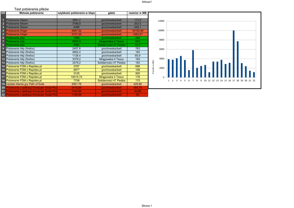 Arkusz1 Test pobierania plików Metoda pobierania szybkość pobierania w kbps gdzie rozmiar w MB 1 2 3 4 5 6 7 8 9 10 11 12 13 14 15 16 17 18 19 20 21 22 Pobieranie Steam Pobieranie Steam Pobieranie Steam Pobieranie Origin Pobieranie Origin Pobieranie p2p Pobieranie p2p Pobieranie p2p Pobieranie http (firefox) Pobieranie http (firefox) Pobieranie http (firefox) Pobieranie http (firefox) Pobieranie http (firefox) Pobieranie FDM z Rapideo.pl Pobieranie FDM z Rapideo.pl Pobieranie FDM z Rapideo.pl Pobieranie FDM z Rapideo.pl Pobieranie FDM z Rapideo.pl Update klienta gry Path of Exile Pobieranie z aplikacji Komputer Świat Plus Pobieranie z aplikacji Komputer Świat Plus Pobieranie z aplikacji Komputer Świat Plus 3891,2 3788,8 4096 4587,52 3727,36 1569 5836,8 2052 2457,6 2662,4 1126,4 3379,2 3379,2 3767 2877 3125 10014,72 7708 3061,76 2416,64 1443,84 1146,88 grochowska/świt grochowska/świt grochowska/świt grochowska/świt grochowska/świt grochowska/świt Mrągowska 4 Tesco Solidarności 47 Pestka grochowska/świt grochowska/świt grochowska/świt Mrągowska 4 Tesco Solidarności 47 Pestka grochowska/świt grochowska/świt grochowska/świt Mrągowska 4 Tesco Solidarności 47 Pestka grochowska/świt grochowska/świt grochowska/świt grochowska/świt 173,5 202,5 448,1 10193,49 1453,57 204 604 49,2 763 183 60,9 183 183 698 108 500 178 175 429,66 483,75 40,88 52 Strona 1 12000 10000 8000 6000 4000 Transfer w kB/s NR 2000 0 1 2 3 4 5 6 7 8 9 10 11 12 13 14 15 16 17 18 19 20 21 22