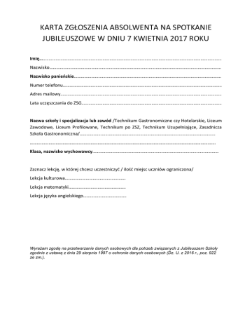 KARTA ZGŁOSZENIA ABSOLWENTA NA SPOTKANIE JUBILEUSZOWE W DNIU 7 KWIETNIA 2017 ROKU Imię………………………………………………………………………………………………………………………………………… Nazwisko………………………………………………………………………………………………………………………………… Nazwisko panieńskie……………………………………………………………………………………………………………… Numer telefonu………………………………………………………………………………………………………………………. Adres mailowy………………………………………………………………………………………………………………………… Lata uczęszczania do ZSG………………………………………………………………………………………………………… Nazwa szkoły i specjalizacja lub zawód /Technikum Gastronomiczne czy Hotelarskie, Liceum Zawodowe, Liceum Profilowane, Technikum po ZSZ, Technikum Uzupełniające, Zasadnicza Szkoła Gastronomiczna/…………………………………………………………………………………………………….. …………………………………………………………………………………………………………………………………………… Klasa, nazwisko wychowawcy……………………………………………………………………………………………… Zaznacz lekcję, w której chcesz uczestniczyć / ilość miejsc uczniów ograniczona/ Lekcja kulturowa……………………………………………. Lekcja matematyki…………………………………………. Lekcja języka angielskiego………………………………. Wyrażam zgodę na przetwarzanie danych osobowych dla potrzeb związanych z Jubileuszem Szkoły zgodnie z ustawą z dnia 29 sierpnia 1997 o ochronie danych osobowych (Dz. U. z 2016 r., poz. 922 ze zm.).
