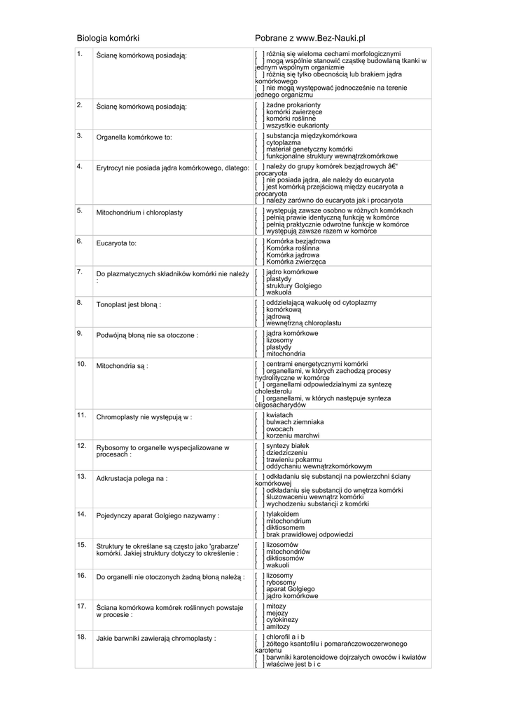 Biologia komórki 1. 2. 3. 4. 5. 6. 7. 8. 9. 10. 11. 12. 13. 14. 15. 16. 17. 18. Pobrane z www.Bez-Nauki.pl [ ] różnią się wieloma cechami morfologicznymi [ ] mogą wspólnie stanowić cząstkę budowlaną tkanki w jednym wspólnym organizmie [ ] różnią się tylko obecnością lub brakiem jądra komórkowego [ ] nie mogą występować jednocześnie na terenie jednego organizmu [ ] żadne prokarionty Ścianę komórkową posiadają: [ ] komórki zwierzęce [ ] komórki roślinne [ ] wszystkie eukarionty [ ] substancja międzykomórkowa Organella komórkowe to: [ ] cytoplazma [ ] materiał genetyczny komórki [ ] funkcjonalne struktury wewnątrzkomórkowe Erytrocyt nie posiada jądra komórkowego, dlatego: [ ] należy do grupy komórek bezjądrowych – procaryota [ ] nie posiada jądra, ale należy do eucaryota [ ] jest komórką przejściową między eucaryota a procaryota [ ] należy zarówno do eucaryota jak i procaryota [ ] występują zawsze osobno w różnych komórkach Mitochondrium i chloroplasty [ ] pełnią prawie identyczną funkcję w komórce [ ] pełnią praktycznie odwrotne funkcje w komórce [ ] występują zawsze razem w komórce [ ] Komórka bezjądrowa Eucaryota to: [ ] Komórka roślinna [ ] Komórka jądrowa [ ] Komórka zwierzęca Do plazmatycznych składników komórki nie należy [ ] jądro komórkowe [ ] plastydy : [ ] struktury Golgiego [ ] wakuola [ ] oddzielającą wakuolę od cytoplazmy Tonoplast jest błoną : [ ] komórkową [ ] jądrową [ ] wewnętrzną chloroplastu [ ] jądra komórkowe Podwójną błoną nie sa otoczone : [ ] lizosomy [ ] plastydy [ ] mitochondria [ ] centrami energetycznymi komórki Mitochondria są : [ ] organellami, w których zachodzą procesy hydrolityczne w komórce [ ] organellami odpowiedzialnymi za syntezę cholesterolu [ ] organellami, w których następuje synteza oligosacharydów [ ] kwiatach Chromoplasty nie występują w : [ ] bulwach ziemniaka [ ] owocach [ ] korzeniu marchwi [ ] syntezy białek Rybosomy to organelle wyspecjalizowane w [ ] dziedziczeniu procesach : [ ] trawieniu pokarmu [ ] oddychaniu wewnątrzkomórkowym [ ] odkładaniu się substancji na powierzchni ściany Adkrustacja polega na : komórkowej [ ] odkładaniu się substancji do wnętrza komórki [ ] śluzowaceniu wewnątrz komórki [ ] wychodzeniu substancji z komórki [ ] tylakoidem Pojedynczy aparat Golgiego nazywamy : [ ] mitochondrium [ ] diktiosomem [ ] brak prawidłowej odpowiedzi [ ] lizosomów Struktury te określane są często jako 'grabarze' [ ] mitochondriów komórki. Jakiej struktury dotyczy to określenie : [ ] diktiosomów [ ] wakuoli [ ] lizosomy Do organelli nie otoczonych żadną błoną należą : [ ] rybosomy [ ] aparat Golgiego [ ] jądro komórkowe [ ] mitozy Ściana komórkowa komórek roślinnych powstaje [ ] mejozy w procesie : [ ] cytokinezy [ ] amitozy [ ] chlorofil a i b Jakie barwniki zawierają chromoplasty : [ ] żółtego ksantofilu i pomarańczowoczerwonego karotenu [ ] barwniki karotenoidowe dojrzałych owoców i kwiatów [ ] właściwe jest b i c Ścianę komórkową posiadają: 19. Siateczka śródplazmatyczna gładka bierze udział w syntezie : 20. Nauką zajmującą się budową i czynnościami komórki jest : [ [ [ [ [ [ [ [ ] węglowodanów ] kwasów nukleinowych ] kwasów tłuszczowych ] białek ] cytologia ] fizjologia ] cytometria ] cytofizjologia Poprawne odpowiedzi 1. 3. 5. 7. 9. 11. 13. 2. 4. 6. 8. 10. 12. 14. komórki roślinne 15. 17. różnią się wieloma cechami morfologicznymi funkcjonalne struktury wewnątrzkomórkowe pełnią praktycznie odwrotne funkcje w komórce wakuola lizosomy bulwach ziemniaka odkładaniu się substancji na powierzchni ściany komórkowej mitochondriów cytokinezy 16. 18. 19. kwasów tłuszczowych 20. rybosomy żółtego ksantofilu i pomarańczowoczerwonego karotenu cytologia Komórka jądrowa oddzielającą wakuolę od cytoplazmy centrami energetycznymi komórki syntezy białek diktiosomem