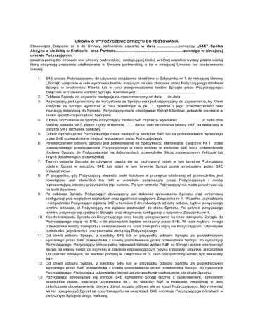 UMOWA O WYPOŻYCZENIE SPRZĘTU DO TESTOWANIA Stanowiąca Załącznik nr 4 do Umowy partnerskiej zawartej w dniu ....................pomiędzy „S4E” Spółka Akcyjna z siedzibą w Krakowie oraz Partnera................................................................zwanego w niniejszej umowie Pożyczającym, zawarta pomiędzy stronami ww. Umowy partnerskiej; następującej treści, w której wszelkie wyrazy pisane wielką literą otrzymują znaczenie zdefiniowane w Umowie partnerskiej, o ile w niniejszej Umowie nie postanowiono inaczej: 1. 2. 3. 4. 5. 6. 7. 8. 9. 10. 11. 12. 13. S4E oddaje Pożyczającemu do używania urządzenia określone w Załączniku nr 1 do niniejszej Umowy („Sprzęt) wyłącznie w celu wykonania testów, mających na celu zbadanie przez Pożyczającego działania Sprzętu w środowisku Klienta lub w celu przeprowadzenia testów Sprzętu przez Pożyczającego; Załącznik nr 1 określa wartość Sprzętu. Klientem jest :....................................................... Oddanie Sprzętu do używania następuje na czas oznaczony od dnia .... do dnia ........ Pożyczający jest uprawniony do korzystania ze Sprzętu oraz jest obowiązany do zapewnienia, by Klient korzystał ze Sprzętu wyłącznie w celu określonym w pkt. 1, zgodnie z jego przeznaczeniem oraz instrukcją dołączoną do Sprzętu. Pożyczający może udostępniać Sprzęt Klientowi, jednakże nie może w żaden sposób rozporządzać Sprzętem. Z tytułu korzystania ze Sprzętu Pożyczający zapłaci S4E czynsz w wysokości ...................... zł netto plus należny podatek VAT, płatny z góry w terminie ........ dni od daty otrzymania faktury VAT, na wskazany w fakturze VAT rachunek bankowy. Odbiór Sprzętu przez Pożyczającego może nastąpić w siedzibie S4E lub za pośrednictwem wybranego przez S4E przewoźnika w miejscu wskazanym przez Pożyczającego. Potwierdzeniem odbioru Sprzętu jest pokwitowanie na Specyfikacji, stanowiącej Załącznik Nr 1 przez upoważnionego przedstawiciela Pożyczającego w razie odbioru w siedzibie S4E bądź potwierdzenie dostawy Sprzętu do Pożyczającego na dokumentach przewoźnika (liście przewozowym, fakturze lub innych dokumentach przewoźnika). Termin oddania Sprzętu do używania uważa się za zachowany, jeżeli w tym terminie Pożyczający odebrał Sprzęt w siedzibie S4E lub jeżeli w tym terminie Sprzęt został przekazany przez S4E przewoźnikowi. W przypadku, gdy Pożyczający stwierdzi braki ilościowe w przesyłce odebranej od przewoźnika, jest obowiązany jest stwierdzić ten fakt w protokole podpisanym przez Pożyczającego i osobę reprezentującą interesy przewoźnika (np. kuriera). Po tym terminie Pożyczający nie może powoływać się na braki ilościowe. Po odbiorze Sprzętu Pożyczający obowiązany jest dokonać sprawdzenia Sprzętu oraz otrzymanej konfiguracji pod względem uszkodzeń oraz zgodności względem Załącznika nr 1. Wszelkie uszkodzenia i niezgodności Pożyczający zgłasza S4E w terminie 5 dni roboczych od daty odbioru. Upływ powyższego terminu oznacza, iż Pożyczający nie zgłasza zastrzeżeń do stanu Sprzętu. Po upływie powyższego terminu przyjmuje się zgodność Sprzętu oraz otrzymanej konfiguracji z opisem w Załączniku nr 1. Koszty transportu Sprzętu do Pożyczającego oraz koszty ubezpieczenia na czas transportu Sprzętu do Pożyczającego ciążą na S4E, o ile przewoźnik będzie wskazany przez S4E. W razie wyboru innego przewoźnika koszty transportu i ubezpieczenia na czas transportu ciążą na Pożyczającym. Obowiązek rozładunku, jego koszty i ubezpieczenie obciążają Pożyczającego. Od chwili odbioru Sprzętu z siedziby S4E lub w przypadku odbioru Sprzętu za pośrednictwem wybranego przez S4E przewoźnika z chwilą pozostawienia przez przewoźnika Sprzętu do dyspozycji Pożyczającego, Pożyczający ponosi pełną odpowiedzialność wobec S4E za Sprzęt i winien ubezpieczyć Sprzęt na własny koszt, co najmniej w zakresie odpowiadającym ryzyku kradzieży, rabunku, zniszczenia lub zdarzeń losowych, na wartość podaną w Załączniku nr 1. Jako ubezpieczony winien być wskazany S4E. Od chwili odbioru Sprzętu z siedziby S4E lub w przypadku odbioru Sprzętu za pośrednictwem wybranego przez S4E przewoźnika z chwilą pozostawienia przez przewoźnika Sprzętu do dyspozycji Pożyczającego, Pożyczający odpowiada również za przypadkowe uszkodzenie lub utratę Sprzętu. Pożyczający zobowiązuje się zwrócić S4E kompletny Sprzęt łącznie z opakowaniem, kompletem akcesoriów (kable, instrukcja użytkownika itd.), do siedziby S4E w Krakowie, najpóźniej w dniu zakończenia obowiązywania Umowy. Zwrot sprzętu odbywa się na koszt Pożyczającego, który również winien ubezpieczyć Sprzęt na czas transportu na swój koszt. S4E informuje Pożyczającego o brakach w zwróconym Sprzęcie drogą mailową. 2 14. 15. 16. 17. 18. 19. 20. 13.1. W przypadku zwrotu Sprzętu bez kompletnego opakowania Pożyczający jest obowiązany je zwrócić S4E na swój koszt w terminie 5 dni roboczych od dnia poinformowania przez S4E o brakach. 13.2. W przypadku zwrotu Sprzętu bez kompletu akcesoriów (kable, instrukcja użytkownika itd.) Pożyczający jest obowiązany zwrócić S4E komplet akcesoriów na swój koszt w terminie 5 dni roboczych od dnia poinformowania przez S4E o brakach. Pożyczający zapłaci karę umowną w przypadku: a) zwłoki w zwrocie Sprzętu - w wysokości 2% wartości Sprzętu netto określonej w Załączniku Nr 1 za każdy dzień zwłoki; b) zwrotu Sprzętu bez kompletnego opakowania w terminie, o którym mowa w pkt. 13.1 w wysokości 3.000,- zł (trzy tysiące złotych); c) zwrotu Sprzętu bez kompletu akcesoriów (kable, instrukcja użytkownika itd.) w terminie, o którym mowa w pkt. 13.2 - w wysokości 1.000,- zł za każdy brakujący element (jeden tysiąc złotych); d) uszkodzenia oprogramowania pracującego na Sprzęcie, wymagającego reinstalacji oprogram