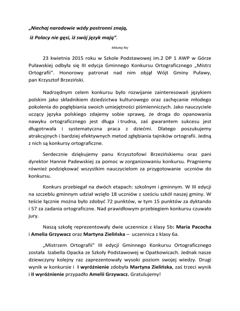 „Niechaj narodowie wżdy postronni znają, iż Polacy nie gęsi, iż swój język mają”. Mikołaj Rej 23 kwietnia 2015 roku w Szkole Podstawowej im.2 DP 1 AWP w Górze Puławskiej odbyła się III edycja Gminnego Konkursu Ortograficznego „Mistrz Ortografii". Honorowy patronat nad nim objął Wójt Gminy Puławy, pan Krzysztof Brzeziński. Nadrzędnym celem konkursu było rozwijanie zainteresowań językiem polskim jako składnikiem dziedzictwa kulturowego oraz zachęcanie młodego pokolenia do pogłębiania swoich umiejętności piśmienniczych. Jako nauczyciele uczący języka polskiego zdajemy sobie sprawę, że droga do opanowania nawyku ortograficznego jest długa i trudna, zaś gwarantem sukcesu jest długotrwała i systematyczna praca z dziećmi. Dlatego poszukujemy atrakcyjnych i bardziej efektywnych metod zgłębiania tajników ortografii. Jedną z nich są konkursy ortograficzne. Serdecznie dziękujemy panu Krzysztofowi Brzezińskiemu oraz pani dyrektor Hannie Padewskiej za pomoc w zorganizowaniu konkursu. Pragniemy również podziękować wszystkim nauczycielom za przygotowanie uczniów do konkursu. Konkurs przebiegał na dwóch etapach: szkolnym i gminnym. W III edycji na szczeblu gminnym udział wzięło 18 uczniów z sześciu szkół naszej gminy. W teście łącznie można było zdobyć 72 punktów, w tym 15 punktów za dyktando i 57 za zadania ortograficzne. Nad prawidłowym przebiegiem konkursu czuwało jury. Naszą szkołę reprezentowały dwie uczennice z klasy 5b: Maria Pacocha i Amelia Grzywacz oraz Martyna Zielińska – uczennica z klasy 6a. „Mistrzem Ortografii” III edycji Gminnego Konkursu Ortograficznego została Izabella Opacka ze Szkoły Podstawowej w Opatkowicach. Jednak nasze dziewczyny kolejny raz zaprezentowały wysoki poziom swojej wiedzy. Drugi wynik w konkursie i I wyróżnienie zdobyła Martyna Zielińska, zaś trzeci wynik i II wyróżnienie przypadło Amelii Grzywacz. Gratulujemy!