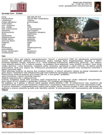 Małgorzata Klebańska tel.: (+48) 501 031743 email: [email protected] Sprzedaż Dom - 032860 Cena: Powierzchnia: Lokalizacja: rodzaj zabudowy: liczba pokoi: pow. użytkowa: pow. działki: stan wykończenia: położenie: przeznaczenie: okna: ogrzewanie: podpiwniczenie: kształt dachu: pokrycie dachu: materiał: prąd: gaz: kanalizacja: komunikacja: tereny rekreacyjne: umeblowanie: 490 000,00 PLN 400,00 Metr kwadratowy Lutkowo wolnostojący 8 400 5300 do zamieszkania pod miastem mieszkalno-usługowy plastikowe; olejowe; częściowe spadzisty dachówka cegła tak tak miejska/gminna; pks; las;jezioro; częściowe Opis Przedmiotem oferty jest pięknie zagospodarowane "ranczo" o powierzchni 5300 m2 zabudowane poniemieckim domem. Nieruchomość położona w malowniczej okolicy Ińskiego Parku Krajobrazowego. Budynek w 2007r. przeszedł kapitalny remont, wykonano m.in.: nową instalację hydrauliczną, elektryczną, grzewczą - piec olejowy, nowa stolarka okienna PCV w kolorze kasztan, na poddaszu okna połaciowe, nowe schodny na piętro, nowy strop, więźba dachowa i nowa dachówka, ocieplenie wełna mineralna, wentylacja w całym budynku, na piętrze panele przemysłowe, taras przy wejsciu etc. Praktycznie pozostawiono tylko stare stylowe mury zewnętrzne wykonane z pełnej czerwonej cegły. Obok głównego budynku są jeszcze dwa mniejsze budynki, w których aktualnie robione są pokoje mieszkalne dla gości razem z łazienkami oraz zlokalizowana jest nowa kotłownia ogrzewająca wszystkie budynki. Powierzchnia użytkowa budynku gł.to ponad 200 m2, w tym parter i poddasze: salon kominkowy z barem (kominek otwarty) Jadalnia połączona jest z częścią barową kuchnia; kompletny sprzęt AGD prywatna część przeznaczona do wyłącznego użytku właścicieli nieruchomości duża (około 30 m2) sypialnia z garderobą i łazienką z WC (podłoga jest podgrzewana). Na poddaszu są 4 pokoje, z których każdy posiada własną łazienkę z WC. W przestronnym holu wspólnym dla wszystkich pokoi zrobiony jest kompletnie umeblowany i wyposażony aneks kuchenny oraz duża zabudowana szafa. W piwnicy dyskoteka z wygospodarowaną częścią pod konsolę i barek. Piwnica posiada 2 okna i jest ogrzewana. Na podłodze w piwnicy położone są kafle oraz naturalny kamień. W pomieszczeniu tym rozprowadzona jest kompletna Zdjęcia Dokument wygenerowany przez eKomako Makler Nieruchomości Data wydruku: 2017-03-03 13:12