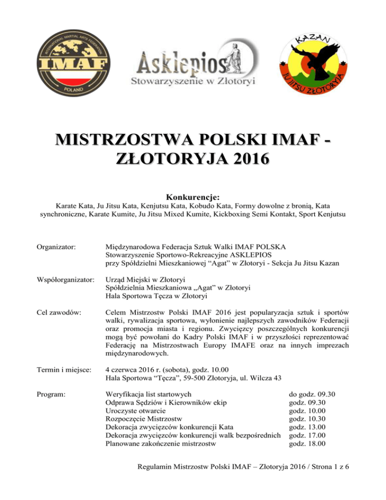 MISTRZOSTWA POLSKI IMAF ZŁOTORYJA 2016 Konkurencje: Karate Kata, Ju Jitsu Kata, Kenjutsu Kata, Kobudo Kata, Formy dowolne z bronią, Kata synchroniczne, Karate Kumite, Ju Jitsu Mixed Kumite, Kickboxing Semi Kontakt, Sport Kenjutsu Organizator: Międzynarodowa Federacja Sztuk Walki IMAF POLSKA Stowarzyszenie Sportowo-Rekreacyjne ASKLEPIOS przy Spółdzielni Mieszkaniowej “Agat” w Złotoryi - Sekcja Ju Jitsu Kazan Współorganizator: Urząd Miejski w Złotoryi Spółdzielnia Mieszkaniowa „Agat” w Złotoryi Hala Sportowa Tęcza w Złotoryi Cel zawodów: Celem Mistrzostw Polski IMAF 2016 jest popularyzacja sztuk i sportów walki, rywalizacja sportowa, wyłonienie najlepszych zawodników Federacji oraz promocja miasta i regionu. Zwycięzcy poszczególnych konkurencji mogą być powołani do Kadry Polski IMAF i w przyszłości reprezentować Federację na Mistrzostwach Europy IMAFE oraz na innych imprezach międzynarodowych. Termin i miejsce: 4 czerwca 2016 r. (sobota), godz. 10.00 Hala Sportowa “Tęcza”, 59-500 Złotoryja, ul. Wilcza 43 Program: Weryfikacja list startowych Odprawa Sędziów i Kierowników ekip Uroczyste otwarcie Rozpoczęcie Mistrzostw Dekoracja zwycięzców konkurencji Kata Dekoracja zwycięzców konkurencji walk bezpośrednich Planowane zakończenie mistrzostw do godz. 09.30 godz. 09.30 godz. 10.00 godz. 10.30 godz. 13.00 godz. 17.00 godz. 18.00 Regulamin Mistrzostw Polski IMAF – Złotoryja 2016 / Strona 1 z 6 Opłaty startowe: 30 PLN za konkurencję indywidualną 40 PLN za drużynę Ju Jitsu Kata 50 PLN za drużynę Karate Kata lub Kobudo Kata Wnoszenie opłat: Wpłat należy dokonywać przelewem do dnia 01 czerwca 2016 r. na konto: Stowarzyszenie ASKLEPIOS przy SM “Agat” w Złotoryi Powiatowy Bank Spółdzielczy w Złotoryi Nr rachunku: 68 8658 0009 0000 0710 2000 0010 W szczególnych przypadkach możliwe jest uiszczenie opłaty startowej gotówką w dniu zawodów, w Biurze Mistrzostw (Biuro Mistrzostw czynne od godz. 8:00 na terenie Hali „Tęcza”). Nagrody: Medale i dyplomy za miejsca I-III, statuetki dla klubów Zasady: Obowiązują przepisy i zasady regulaminów poszczególnych konkurencji IMAF Polska. Przepisy zawodów w systemie IMAF dostępne na stronie internetowej www.imaf.pl. System walk: Pucharowy w walkach bezpośrednich, punktowy w kata (zawodnicy prezentują formy kolejno jeden po drugim). Sędziowie: Posiadający kwalifikacje sędziowskie IMAF Polska. Zgłoszenia: Zgłoszenia do dnia 25 maja 2016r. ,w formie elektronicznej na oryginalnym formularzu zgłoszeniowym, na adres e-mail [email protected]. Karty niekompletne lub nieprawidłowo wypełnione będą odsyłane do nadawcy! Organizator dopuszcza możliwość wykreślenia 1 zawodnika z klubu, który pomimo zgłoszenia nie przybył na Mistrzostwa. Prawo startu: Wyłącznie zawodnicy Klubów Członkowskich IMAF Polska! Konkurencje: Karate Kata indywidualne: 1. Kata młodzików 10-12 lat 2. Kata kadetów 13-15 lat 3. Kata juniorów 16-18 lat, minimum 6 kyu 4. Kata seniorów 19+, minimum 5 kyu 5. Kata młodziczek 10-12 lat 6. Kata kadetek 13-15 lat 7. Kata juniorek 16-18 lat, minimum 6 kyu 8. Kata seniorek 19+, minimum 5 kyu Kobudo Kata: 9. Kata Kobudo młodzików 10-12 lat 10. Kata Kobudo kadetów 13-15 lat 11. Kata Kobudo juniorów 16-18 lat 12. Kata Kobudo seniorów 19+ 13. Kata Kobudo kadetek 13-15 lat 14. Kata Kobudo juniorek 16-18 lat 15. Kata Kobudo seniorek 19+ Regulamin Mistrzostw Polski IMAF – Złotoryja 2016 / Strona 2 z 6 Formy dowolne z bronią: 16. Broń kadet/kadetka 13-15 lat 17. Broń junior/juniorka 16-18 lat 18. Broń senior/seniorka 19+ Kata synchroniczne (Karate lub Kobudo; 3 osoby, mogą startować drużyny mieszane): 19. Kata synchroniczne, grupa młodsza do 15 lat 20. Kata synchroniczne, grupa starsza 16+ Kata Ju Jitsu 21. Kata ju jitsu kadetów 13-15 lat 22. Kata ju jitsu juniorów 16-18 lat 23. Kata ju jitsu seniorów 19+ 24. Kata ju jitsu kadetek i juniorek 13-18 lat lub pary mieszane 25. Kata ju jitsu seniorek 19+ lub pary mieszane Karate Sanbon Shobu Kumite: 26. Sanbon Kumite młodzików 10-12 lat 27. Sanbon Kumite kadetów 13-15 lat 28. Sanbon Kumite juniorów 16-18 lat 29. Sanbon Kumite seniorów 19+, minimum 5kyu 30. Sanbon Kumite młodziczek 10-12 lat 31. Sanbon Kumite kadetek 13-15 lat 32. Sanbon Kumite juniorek 16-18 lat 33. Sanbon Kumite seniorek 19+ minimum 5 kyu Semi Kontakt kickboxing: 34. Semi Kontakt kadetów 13-15 lat, waga lekka -45-52 35. Semi Kontakt kadetów 13-15 lat, waga średnia -55-60 36. Semi Kontakt kadetów 13-15 lat, waga ciężka +60 37. Semi Kontakt juniorów 16-18 lat, waga lekka -55-60 38. Semi Kontakt juniorów 16 -18 lat, waga średnia -65-70 39. Semi Kontakt juniorów 16-18 lat, waga ciężka -80 40. Semi Kontakt juniorów 16-18 lat, waga super ciężka +80 41. Semi Kontakt seniorów 19+, waga lekka -65-70 42. Semi Kontakt seniorów 19+, waga średnia -75-80 43. Semi Kontakt seniorów 19+, waga ciężka -89 44. Semi Kontakt seniorów 19+ waga super ciężka +89 45-46 Semi Kontakt kadetek 13-15 lat, dwie kategorie wagowe 47-48 Semi Kontakt juniorek 16-18 lat, dwie kategorie wagowe 49-50 Semi Kontakt seniorek 19+, dwie kategorie wagowe (Różnica wagi nie może przekroczyć w kategoriach kadet i junior 8kg, a w kategorii senior 10kg). Ju Jitsu Mixed Kumite: 51-55. Ju Jitsu Mixed Kumite kadetów 13-15 lat -47kg, - 54kg, -61kg, - 68kg, + 68kg 56-60. Ju Jitsu Mixed Kumite kadetek 13-15 lat -45kg, - 52kg, -59kg, - 66kg, + 66kg 61-65. Ju Jitsu Mixed Kumite juniorów 16-18 lat -56kg, - 64kg, - 72kg, -80kg , +80kg 66-70. Ju Jitsu Mixed Kumite juniorek 16-18 lat -50kg, - 57kg, -64kg, - 71kg. + 71kg 71-75. Ju Jitsu Mixed Kumite seniorów 19+ -65kg, -74kg, -83kg, -92kg, +92kg 76-80. Ju Jitsu Mixed Kumite seniorek 19+ –55kg, - 62kg, - 69kg , -76kg, +76kg Regulamin Mistrzostw Polski IMAF – Złotoryja 2016 / Strona 3 z 6 (Konkurencje wagowe rozegrane zostaną w przypadku zgłoszenia min. 3 zawodników, w innych przypadkach zostanie zapr