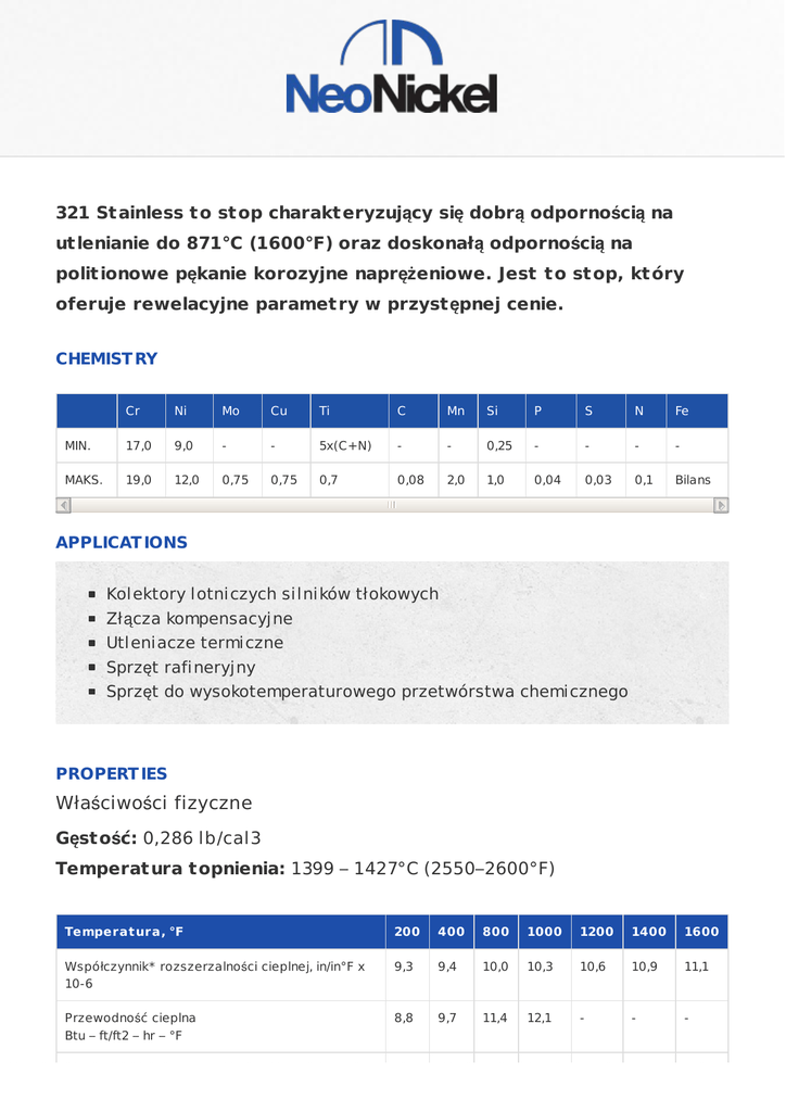 321 St ainless t o st op charakt eryzujący się dobrą odpornością na ut lenianie do 871°C (1600°F) oraz doskonałą odpornością na polit ionowe pękanie korozyjne naprężeniowe. Jest t o st op, kt óry oferuje rewelacyjne paramet ry w przyst ępnej cenie. CHEMIST RY Cr Ni Mo Cu Ti C Mn Si P S N Fe MIN. 17,0 9,0 - - 5x(C+N) - - 0,25 - - - - MAKS. 19,0 12,0 0,75 0,75 0,7 0,08 2,0 1,0 0,04 0,03 0,1 Bilans APPLICAT IONS Kolektory lotniczych silników tłokowych Złącza kompensacyjne Utleniacze termiczne Sprzęt rafineryjny Sprzęt do wysokotemperaturowego przetwórstwa chemicznego PROPERT IES Właściwości fizyczne Gęst ość: 0,286 lb/cal3 Temperat ura t opnienia: 1399 – 1427°C (2550–2600°F) Temperat ura, °F 200 400 800 1000 1200 1400 1600 Współczynnik* rozszerzalności cieplnej, in/in°F x 10-6 9,3 9,4 10,0 10,3 10,6 10,9 11,1 Przewodność cieplna Btu – ft/ft2 – hr – °F 8,8 9,7 11,4 12,1 - - - Współczynnik sprężystości, dynamiczny psi x 106 28,0 26,5 23,8 22,5 21,2 19,7 - Opór właściwy Temperat ura, °F 68 212 392 752 1112 1472 1652 omów – circ mil/ft 430 470 515 600 670 725 760 * 70°F do wskazanej temperatury. Właściwości mechaniczne Średnie właściwości mechaniczne przy rozciąganiu w podwyższonej t emperat urze Temperat ura, °F 68 400 600 800 1000 1200 1400 Wytrzymałość na rozciąganie, ksi 84 62 62 62 59,5 45,5 27,5 0,2% granica plastyczności, ksi 38 20,5 18 17 16,5 16 14 Średnie obciążenie zrywające Temperat ura, °F 1050 1100 1150 1200 1250 1300 1350 1400 1450 1500 1000 godzin, ksi - 30 - 19 - 11,2 - 6,8 - 4,0 10 000 godzin, ksi 31 23,5 17,3 12,9 9,7 7,2 5,4 4,0 3,05 2,3 100 000 godzin, ksi 23 16,5 12 8,7 6,3 4,6 3,3 2,45 1,75 1,27 Średnie obciążenie dla wt órnej (minimalnej) szybkości pełzania Temperat ura, °F 1050 1100 1150 1200 1250 1300 1350 1400 1450 1500 1% w 1000 godzin, ksi 30 20 13,1 8,8 5,8 3,85 2,55 1,7 1,13 0,75 1% 100 000 godzin, ksi 13,6 9,2 5,9 3,9 2,55 1,7 1,1 0,74 0,48 0,32 PROFIL W&LST ROK;A&SACUT E;CIWO&SACUT E;CI Stop 321 Stainless jest stabilizowanym tytanem gatunkiem często stosowanym do pracy w zakresie temperatury 538 – 871°C (1000 –1600°F). W temperaturach użytkowych do około 871°C (1600°F), przy obróbce stabilizacyjnej w temperaturze 843 – 899°C (1550 –1650°F), może zapewniać optymalną odporność na międzyziarnową korozję oraz pękanie korozyjne naprężeniowe w kwasie politionowym. Stop 321 Stainless można spawać wszystkimi typowymi metodami, włącznie z łukiem krytym. Odpowiednimi wypełniaczami spoin są nieizolowane druty AWS ER347 oraz izolowane elektrody E347. Stop 321 Stainless jest podobny pod względem skrawalności do stali nierdzewnej 304. Odznacza się on wartością skrawalności wynosząca 45% względem stali AISI B1112. Właściwości stopu Alloy 321 Odporność na utlenianie do 871°C (1600°F) Stabilizowany przeciw międzyziarnowej korozji strefy wpływu ciepła (HAZ) Odporny na pękanie korozyjne naprężeniowe w kwasie politionowym. Firma NeoNickel specjalizuje się w dostarczaniu wysokiej klasy stopów metali na potrzeby wielu różnych sektorów przemysłowych. Będąc poważanym europejskim liderem szczycącym się prawie 30-letnim doświadczeniem w tej dziedzinie, zdobyliśmy na całym świecie reputację dostawcy najwyższej jakości stopów lotniczych, tytanowych oraz ze stali nierdzewnej, odpornych na wysoką temperaturę i korozję. Skont akt uj się z nami, aby uzyska&cacut e; więcej informacji na t emat st opu 321 St ainless lub wype&lst rok;nij nasz formularz zapyt ania, a wkrót ce skont akt ujemy się z Tobą! ZWYCZAJOWE NAZWY HANDLOWE 321, 321 Stainless, Alloy 321