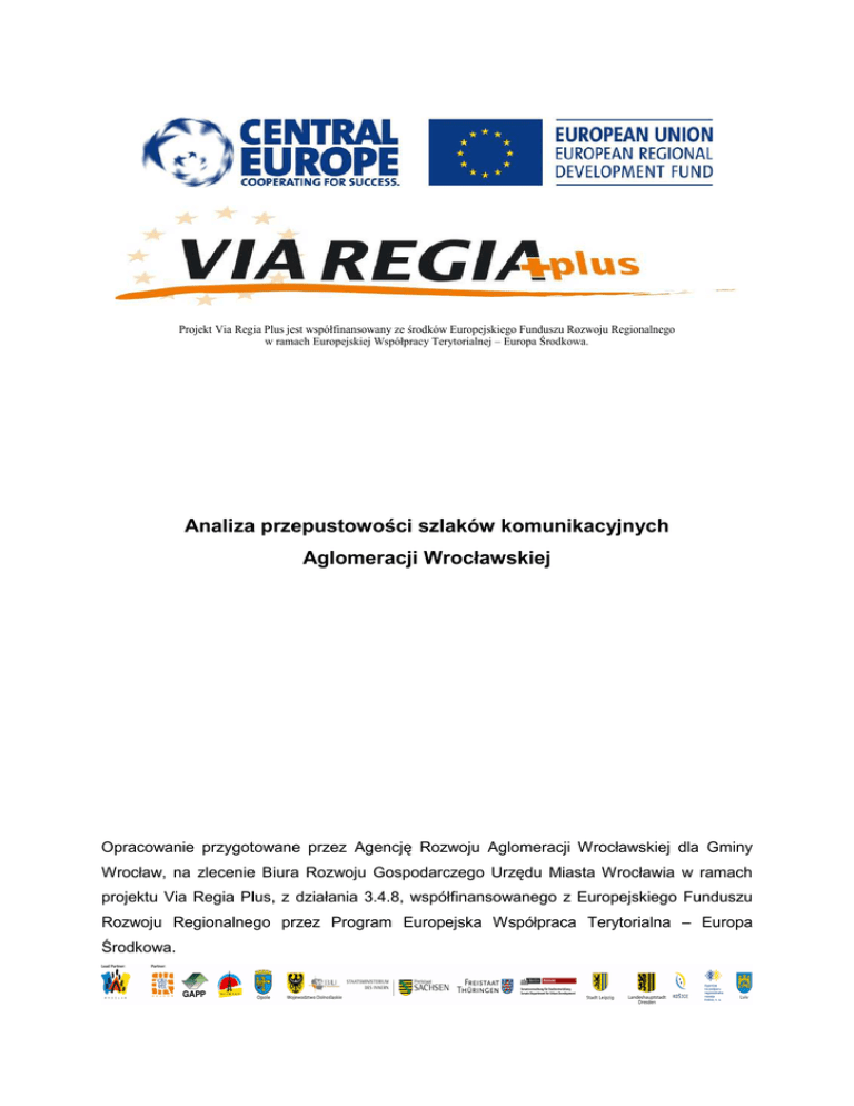 Projekt Via Regia Plus jest współfinansowany ze środków Europejskiego Funduszu Rozwoju Regionalnego w ramach Europejskiej Współpracy Terytorialnej – Europa Środkowa. Analiza przepustowości szlaków komunikacyjnych Aglomeracji Wrocławskiej Opracowanie przygotowane przez Agencję Rozwoju Aglomeracji Wrocławskiej dla Gminy Wrocław, na zlecenie Biura Rozwoju Gospodarczego Urzędu Miasta Wrocławia w ramach projektu Via Regia Plus, z działania 3.4.8, współfinansowanego z Europejskiego Funduszu Rozwoju Regionalnego przez Program Europejska Współpraca Terytorialna – Europa Środkowa. Analiza przepustowości szlaków komunikacyjnych Aglomeracji Wrocławskiej Spis Treści 1. Aglomeracja Wrocławska jako jednostka przestrzenna 2. Transport drogowy Aglomeracji Wrocławskiej 2.1 Infrastruktura transportu drogowego; 2.2 Ruch kołowy i wykorzystanie przepustowości dróg; 2.3 Zjawiska kongestii ruchu; 2.4 Planowany rozwój i modernizacja infrastruktury drogowej; 3. Transport kolejowy Aglomeracji Wrocławskiej 3.1 Infrastruktura transportu kolejowego; 3.2 Ruch kolejowy i wykorzystanie przepustowości linii kolejowych; 3.3 Planowany rozwój i modernizacja infrastruktury kolejowej; 4. Transport lotniczy Aglomeracji Wrocławskiej; 4.1 Infrastruktura transportu lotniczego; 4.2 Ruch lotniczy i wykorzystanie przepustowości; 4.3 Planowany rozwój i modernizacji infrastruktury transportu lotniczego; 5. Transport śródlądowy Aglomeracji Wrocławskiej 5.1 Infrastruktury Ŝeglugi Śródlądowej 5.2 śegluga Śródlądowa i stopień wykorzystania Odrzańskiej Drogi Wodnej 5.3 Planowany rozwój i modernizacja infrastruktury Ŝeglugi śródlądowej; 6. Infrastruktura logistyczno – magazynowa Aglomeracji Wrocławskiej 2 Analiza przepustowości szlaków komunikacyjnych Aglomeracji Wrocławskiej Aglomeracja wrocławska jako jednostka przestrzenna; Granice Aglomeracji Wrocławskiej, jako umownej (subiektywnej) jednostki gospodarczo – urbanistycznej nie są dokładnie określone. Najbardziej powszechnie uwaŜa się, Ŝe jest to obszar dawnego województwa wrocławskiego. Dla potrzeb niniejszej analizy, przyjęto powyŜszą definicję aglomeracji rozumianą jako obszar powiatów: wrocławskiego grodzkiego, wrocławskiego ziemskiego, milickiego, oleśnickiego, oławskiego, strzelińskiego, średzkiego, wołowskiego i trzebnickiego. Istnieją jednak opracowania,1 które zawęŜają jej obszar do sześciu powiatów ziemskich i miasta Wrocław jako siódmego powiatu grodzkiego, czyli wyłączają z jej obrębu powiat milicki i strzeliński. W związku z powyŜszym, uŜywając pojęcia Aglomeracji Wrocławskiej będziemy mieli na myśli obszar dziewięciu wymienionych powyŜej powiatów. Rys nr 1 Powiaty Aglomeracji Wrocławskiej 1 Strategia Rozwoju Aglomeracji Wrocławskiej, Strategia Integracji Gospodarczo Przestrzennej Aglomeracji Wrocławskiej 3 Analiza przepustowości szlaków komunikacyjnych Aglomeracji Wrocławskiej Na wyznaczenie jednostek administracyjnych jako części aglomeracji składa się szereg czynników, z których najwaŜniejsze znaczenie ma fakt, znajdowania się poszczególnych miast, gmin i powiatów jako całości w strefie oddziaływania Wrocławia, jako ośrodka typu metropolitalnego, powiązanych z nim zespołem wielorakich reakcji gospodarczych, społecznych, kulturalnych i administracyjnych. Tabela nr 1 Ludność i Powierzchnia powiatów Aglomeracji Wrocławskiej Lp Nazwa powiatu Ludność Powierzchnia Gęstość zaludnienia 1 Wrocławski Grodzki 632 930 29 282 2161 2 Wrocławski Ziemski 106 080 111 769 95 3 Oleśnicki 103 496 104 928 99 4 Milicki 36 823 71 497 52 5 Oławski 71 540 52 412 136 6 Strzeliński 43 443 62 208 70 7 Średzki 49 540 70 414 70 8 Wołowski 47 417 67 496 70 9 Trzebnicki 78 248 102 447 76 1 091 269 672 453 162 458 339 643 171 71 Razem bez Wrocławia Główny Urząd Statystyczny 2008 Z definicyjnego punktu widzenia, aglomeracja rozumiana jest zazwyczaj jako skupisko ludności i zabudowy na małym obszarze, powodujące jego silne zurbanizowanie. Aglomeracja miejska, to przede wszystkim skupienie zabudowy o układzie monocentrycznym, które charakteryzuje wiele zgrupowań miejsc pracy i głównych ośrodków usługowych, z których jedno np.: śródmieście wielkiego miasta, ma charakter dominujący. Stanowi ono rdzeń aglomeracji, natomiast pozostałe jego elementy moŜna podzielić na dwa kręgi: zewnętrzny i wewnętrzny. Zewnętrzny krąg noszący często miano peryferii, charakteryzuje się tym, Ŝe nie wchodzi w skład 4 Analiza przepustowości szlaków komunikacyjnych Aglomeracji Wrocławskiej zwartego centrum, ale funkcjonalnie pozostaje z nim w ścisłym związku. W obszarze peryferii znajdują się ( przykłady z obszaru Aglomeracji Wrocławskiej) m.in.: 1. Osiedla mieszkalne tworzące tzw. sypialnie (Nowy Dwór, Leśnica, Psie Pole, Zakrzów); 2. Obszary niskiej zabudowy jednorodzinnej, zamieszkane przez osoby pracujące w centrum (Pawłowice, Mirków, Bielany Wrocławskie, Wojnów, Czernica, Święta Katarzyna); 3. Osiedla z zakładami przemysłowymi, zlokalizowane z dala od centrum ze względów ekologicznych lub innych (Jelcz Laskowice, Brzeg Dolny); 4. Osiedla rolniczo – hodowlane, przede wszystkim warzywnicze, dostarczające aglomeracji świeŜych produktów Ŝywnościowych (Siechnice); 5. Tereny rekreacyjne (m.in. tzw. grunty działkowe, a takŜe parki, lasy podmiejskie, obiekty sportowe), słuŜące do wypoczynku mieszkańców aglomeracji (Sobótka); 6. Linie i obiekty komunikacyjne – drogowa obwodnica miasta, szybka kolej miejska, lotnisko itp.,(AOW, Obwodnica Śródmiejska, Port Lotniczy Wrocław, Wrocławski Węzeł Kolejowy); 7. Osiedla akademickie tzw. campusy uczelniane (projektowany Kampus Pracze, obecne uczelnie Wrocławskie); 8. Centra handlowe (Bielany Wrocławskie , Sołtysowice, Długołęka) 9. Strefy przemysłowe (Strefa Przemysłowa LG); Wewnętrznym krąg stanowi zurbanizowana (mieszkalna lub przemysłowo – mieszka