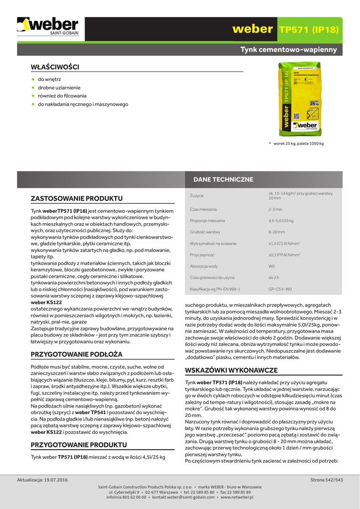 weber TP571 (IP18) Tynk cementowo-wapienny WŁAŚCIWOŚCI • do wnętrz • drobne uziarnienie • również do filcowania • do nakładania ręcznego i maszynowego • worek 25 kg, paleta 1050 kg DANE TECHNICZNE ZASTOSOWANIE PRODUKTU Zużycie ok. 13-14 kg/m2 przy grubści warstwy 10 mm Tynk weberTP571 (IP18) jest cementowo-wapiennym tynkiem podkładowym pod kolejne warstwy wykończeniowe w budynkach mieszkalnych oraz w obiektach handlowych, przemysłowych, oraz użyteczności publicznej. Służy do: wykonywania tynków podkładowych pod tynki cienkowarstwowe, gładzie tynkarskie, płytki ceramiczne itp. wykonywania tynków zatartych na gładko, np. pod malowanie, tapety itp. tynkowania podłoży z materiałów ściennych, takich jak bloczki keramzytowe, bloczki gazobetonowe, zwykłe i poryzowane pustaki ceramiczne, cegły ceramiczne i silikatowe. tynkowania powierzchni betonowych i innych podłoży gładkich lub o niskiej chłonności (nasiąkliwości), pod warunkiem zastosowania warstwy sczepnej z zaprawy klejowo-szpachlowej weber KS122 ostatecznego wykańczania powierzchni we-wnątrz budynków, również w pomieszczeniach wilgotnych i mokrych, np. łazienki, natryski, pral-nie, garaże Zastępuje tradycyjne zaprawy budowlane, przygotowywane na placu budowy ze składników - jest przy tym znacznie szybszy i łatwiejszy w przygotowaniu oraz wykonaniu. Czas mieszania 2-3 min. Proporcje mieszania 4,5-5,0 l/25 kg Grubość warstwy 8-20 mm Wytrzymałość na ściskanie ≥1,5 (CS II) N/mm2 Przyczepność ≥0,3 (FP:A) N/mm2 Absorpcja wody W0 Czas gotowości do użycia do 2 h Klasyfikacja wg PN-EN 998-1 GP-CS II -W0 PRZYGOTOWANIE PODŁOŻA Podłoże musi być stabilne, mocne, czyste, suche, wolne od zanieczyszczeń i warstw słabo związanych z podłożem lub osłabiających wiązanie (tłuszcze, kleje, bitumy, pył, kurz, resztki farb i zapraw, środki antyadhezyjne itp.). Wszelkie większe ubytki, fugi, szczeliny instalacyjne itp. należy przed tynkowaniem wypełnić zaprawą cementowo-wapienną. Na podłożach silnie nasiąkliwych (np. gazobeton) wykonać obrzutkę (szpryc) z weber TP541 i pozostawić do wyschnięcia. Na podłoża gładkie i/lub nienasiąkliwe (np. beton) nałożyć pacą zębatą warstwę sczepną z zaprawy klejowo-szpachlowej weber KS122 i pozostawić do wyschnięcia. PRZYGOTOWANIE PRODUKTU Tynk weber TP571 (IP18) mieszać z wodą w ilości 4,5l/25 kg suchego produktu, w mieszalnikach przepływowych, agregatach tynkarskich lub za pomocą mieszadła wolnoobrotowego. Mieszać 2-3 minuty, do uzyskania jednorodnej masy. Sprawdzić konsystencję i w razie potrzeby dodać wodę do ilości maksymalnie 5,0l/25kg, ponownie zamieszać. W zależności od temperatury, przygotowana masa zachowuje swoje właściwości do około 2 godzin. Dodawanie większej ilości wody niż zalecana, obniża wytrzymałość tynku i może powodować powstawanie rys skurczowych. Niedopuszczalne jest dodawanie „dodatkowo” piasku, cementu i innych materiałów. WSKAZÓWKI WYKONAWCZE Tynk weber TP571 (IP18) należy nakładać przy użyciu agregatu tynkarskiego lub ręcznie. Tynk układać w jednej warstwie, narzucając go w dwóch cyklach roboczych w odstępie kilkudziesięciu minut (czas zależny od tempe-ratury i wilgotności), stosując zasadę „mokre na mokre”. Grubość tak wykonanej warstwy powinna wynosić od 8 do 20 mm. Narzucony tynk równać i doprowadzić do płaszczyzny przy użyciu łaty. W razie potrzeby wykonania grubszego tynku należy pierwszą jego warstwę „przeczesać” poziomo pacą zębatą i zostawić do związania. Drugą warstwę tynku o grubości 8 - 20 mm można układać, zachowując przerwę technologiczną około 1 dzień / mm grubości pierwszej warstwy tynku. Po częściowym stwardnieniu tynk zacierać w zależności od potrzeb: Aktualizacja: 19.07.2016 Strona 542/543 Saint-Gobain Construction Products Polska sp. z o.o. • marka WEBER - biuro w Warszawie ul. Cybernetyki 9 • 02-677 Warszawa • tel. 22 589 85 80 • fax 22 589 85 89 infolinia 801 62 00 00 • [email protected] • www.netweber.pl weber TP571 (IP18) Tynk cementowo-wapienny tynk podkładowy - na ostro pacą styropianową lub drewnianą; tynk gładki/filcowany (np. pod malowanie) - równomierne zatrzeć na gładko pacą z gąbką lub filcem. Ewentualne uszkodzenia powierzchni w trakcie zacierania naprawiać na bieżąco tynkiem weber TP571 (IP18). Na związany i wyschnięty tynk weber TP571 (IP18) można nakładać wszelkiego rodzaju tynki cienkowarstwowe, gładzie, płytki ceramiczne i inne materiały wykończeniowe. WARUNKI PODCZAS STOSOWANIA I WIĄZANIA Temperatura w trakcie nakładania i wiązania nie powinna być niższa niż +5°C oraz wyższa niż +25°C.Należy chronić powierzchnię przed bezpośrednim nasłonecznieniem i przeciągami. W upalne dni oraz przy intensywnym ogrzewaniu, tynk należy zraszać wodą. ZUŻYCIE • ok. 13 - 14 kg na 1 m tynku grubości 10 mm 2 OPAKOWANIA worek 25 kg, paleta 1050 kg Saint-Gobain Construction Products Polska sp. z o.o. ul. Okrężna 16, 44-100 Gliwice 14 DoP-PL-TP571 (IP18)/01/14 EN 998-1:2010 weber TP571 (IP18) Zaprawa tynkarska ogólnego przeznaczenia (GP) do wnętrz GP – CS II – W 0 Reakcja na ogień Klasa A1 Substancje niebezpieczne patrz Karta Charakterystyki Gęstość w stanie suchym 1300-1600 kg/m3 Wytrzymałość na ściskanie CS II Przyczepność ≥ 0,3 N/mm2 (FP:B) Absorpcja wody W0 Współczynnik przewodzenia ciepła, λ10,dry (wartość tabelaryczna) 0,45 W/m*K (P=50%) MAGAZYNOWANIE I TRANSPORT Wyrób przechowywać do 12 miesięcy od daty produkcji podanej na opakowaniu. Składować i transportować w suchych warunkach, na paletach, w fabrycznie zamkniętych i nieuszkodzonych opakowaniach. Po otwarciu opakowanie należy zużyć w ciągu 1 miesiąca. Chronić przed wilgocią. ŚRODKI BEZPIECZEŃSTWA Wyrób zawiera cement portlandzki, po wymieszaniu z wodą daje odczyn silnie alkaliczny. Przechowywać pod zamknięciem. Nie wdycha