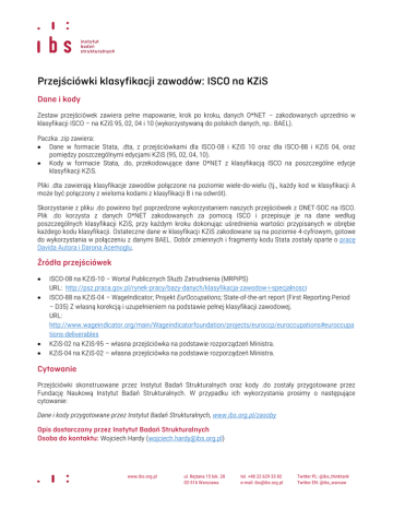 Zestaw przejściówek zawiera pełne mapowanie, krok po kroku, danych O*NET – zakodowanych uprzednio w klasyfikacji ISCO – na KZiS 95, 02, 04 i 10 (wykorzystywaną do polskich danych, np.: BAEL). Paczka .zip zawiera: Dane w formacie Stata, .dta, z przejściówkami dla ISCO-08 i KZiS 10 oraz dla ISCO-88 i KZiS 04, oraz pomiędzy poszczególnymi edycjami KZiS (95, 02, 04, 10). Kody w formacie Stata, .do, przekodowujące dane O*NET z klasyfikacją ISCO na poszczególne edycje klasyfikacji KZiS. Pliki .dta zawierają klasyfikacje zawodów połączone na poziomie wiele-do-wielu (tj., każdy kod w klasyfikacji A może być połączony z wieloma kodami z klasyfikacji B i na odwrót). Skorzystanie z pliku .do powinno być poprzedzone wykorzystaniem naszych przejściówek z ONET-SOC na ISCO. Plik .do korzysta z danych O*NET zakodowanych za pomocą ISCO i przepisuje je na dane według poszczególnych klasyfikacji KZiS, przy każdym kroku dokonując uśrednienia wartości przypisanych w obrębie każdego kodu klasyfikacji. Ostateczne dane w klasyfikacji KZiS zakodowane są na poziomie 4-cyfrowym, gotowe do wykorzystania w połączeniu z danymi BAEL. Dobór zmiennych i fragmenty kodu Stata zostały oparte o pracę Davida Autora i Darona Acemoglu. ISCO-08 na KZiS-10 – Wortal Publicznych Służb Zatrudnienia (MRPiPS) URL: http://psz.praca.gov.pl/rynek-pracy/bazy-danych/klasyfikacja-zawodow-i-specjalnosci ISCO-88 na KZiS-04 – WageIndicator; Projekt EurOccupations; State-of-the-art report (First Reporting Period – D35) Z własną korekcją i uzupełnieniem na podstawie pełnej klasyfikacji zawodowej. URL: http://www.wageindicator.org/main/Wageindicatorfoundation/projects/euroccp/euroccupations#euroccupa tions-deliverables KZiS-02 na KZiS-95 – własna przejściówka na podstawie rozporządzeń Ministra. KZiS-04 na KZiS-02 – własna przejściówka na podstawie rozporządzeń Ministra. Przejściówki skonstruowane przez Instytut Badań Strukturalnych oraz kody .do zostały przygotowane przez Fundację Naukową Instytut Badań Strukturalnych. W przypadku ich wykorzystania prosimy o następujące cytowanie: Dane i kody przygotowane przez Instytut Badań Strukturalnych, www.ibs.org.pl/zasoby Wojciech Hardy ([email protected]) www.ibs.org.pl ul. Rejtana 15 lok. 28 02-516 Warszawa tel. +48 22 629 33 82 e-mail: [email protected] Twitter PL: @ibs_thinktank Twitter EN: @ibs_warsaw